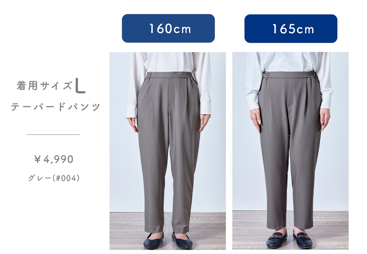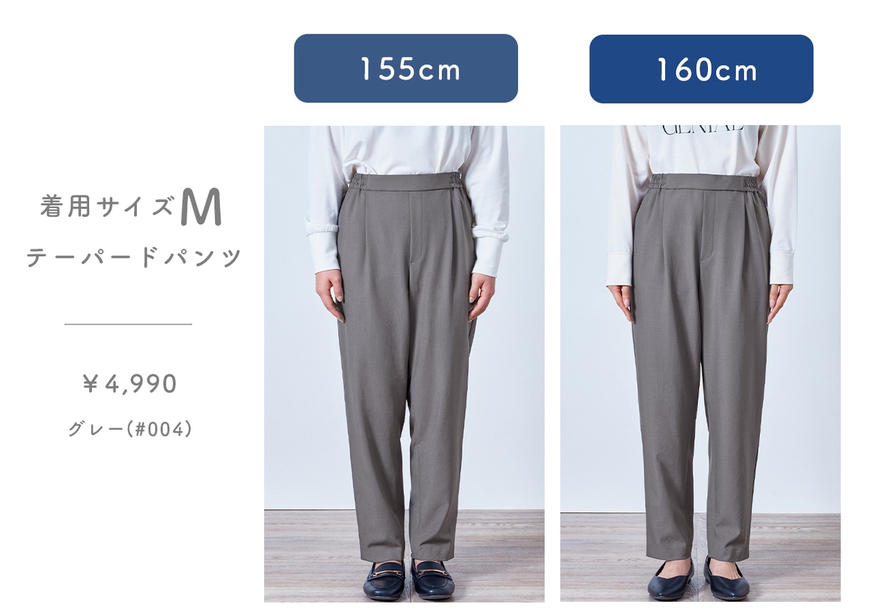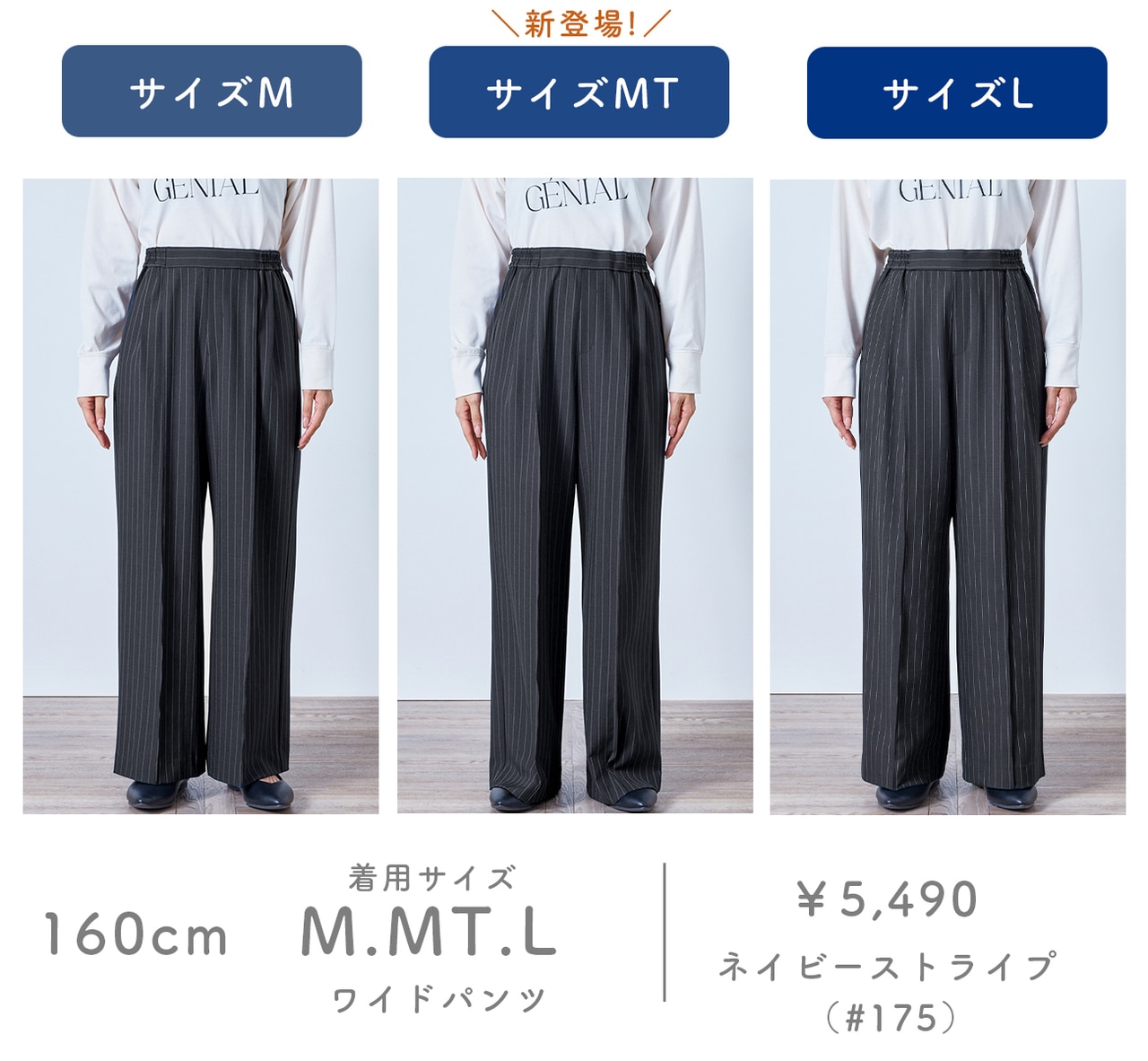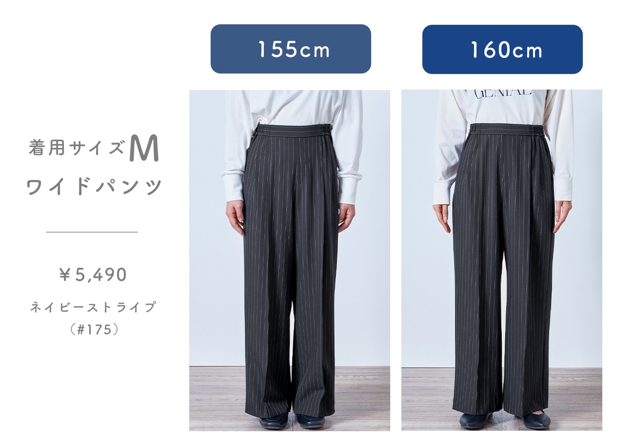 Mサイズよりも丈が長く、裾にワンクッションが入ることで程よいリラックス感を演出。ヒールで合わせればバランスよく大人っぽく、裾を軽く調整すればフラットシューズでもすっきり着こなせます。スタイルやシーンに合わせて丈感を楽しめます。