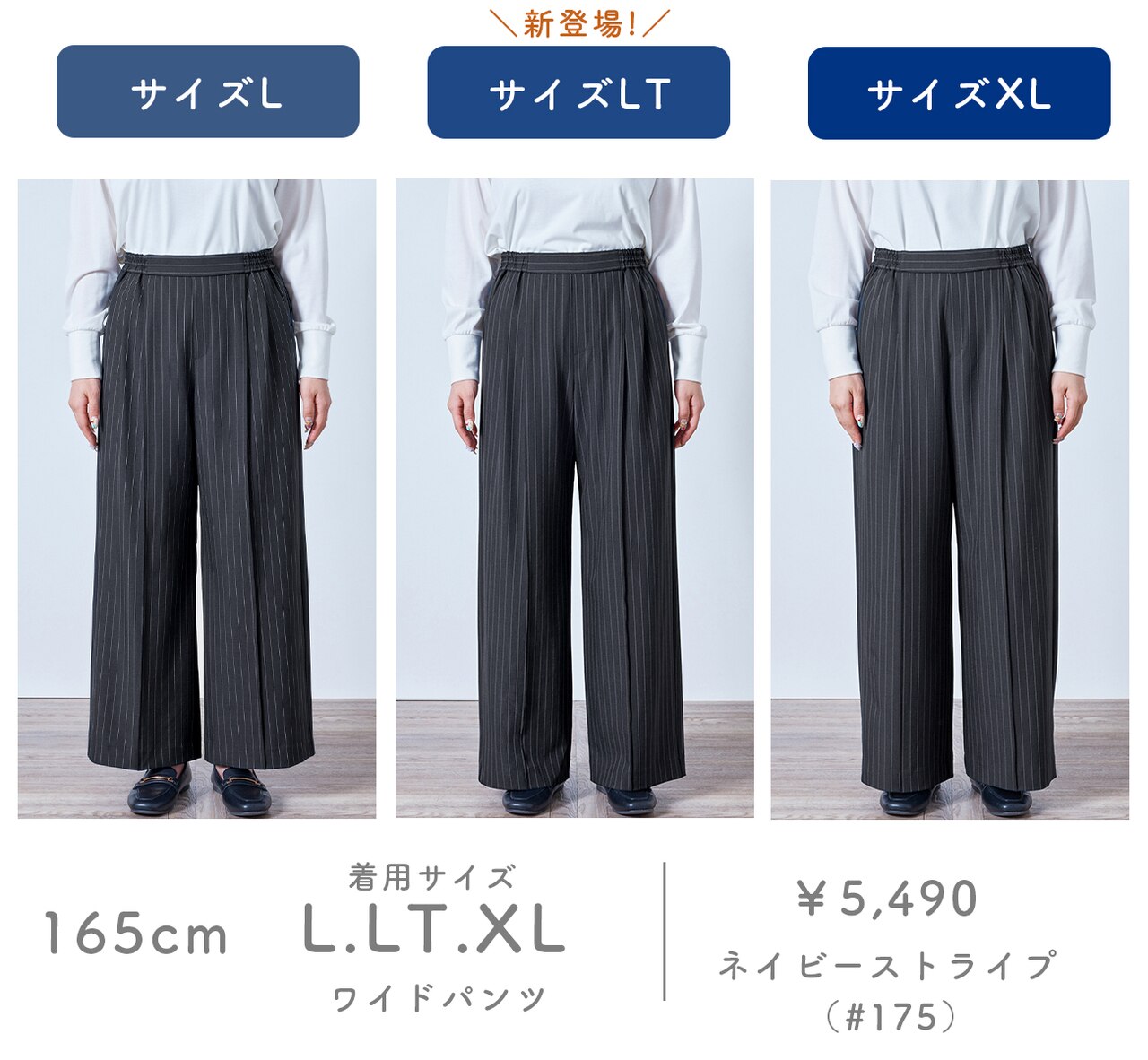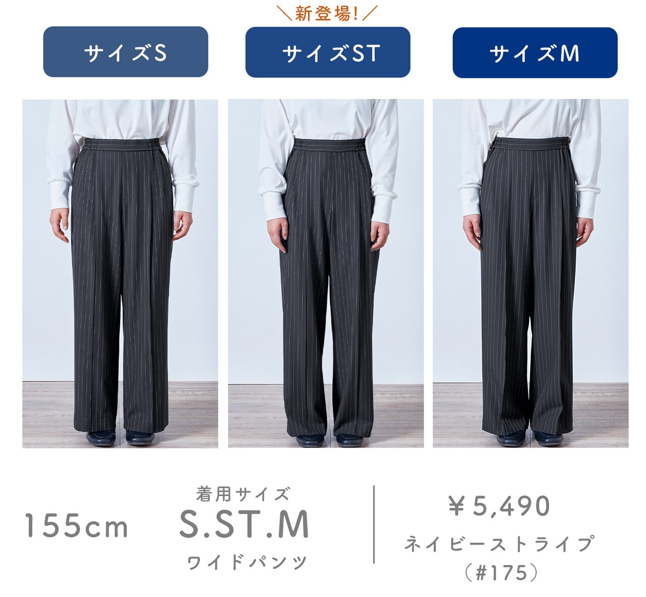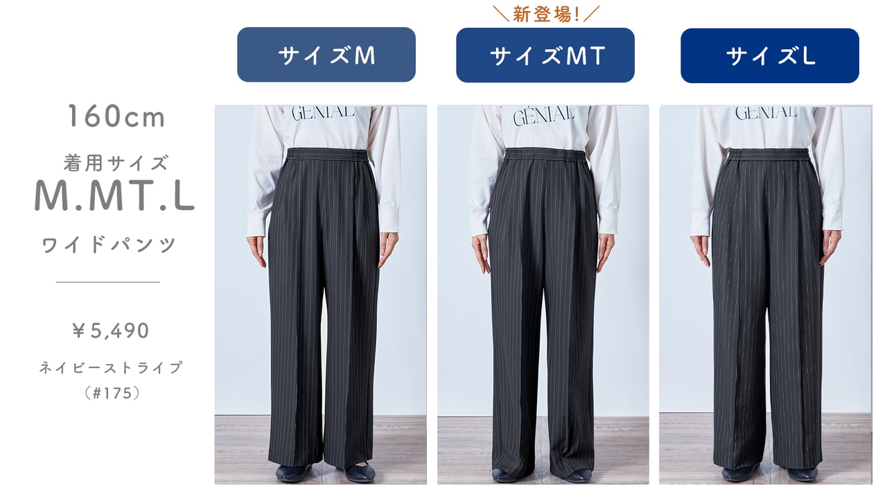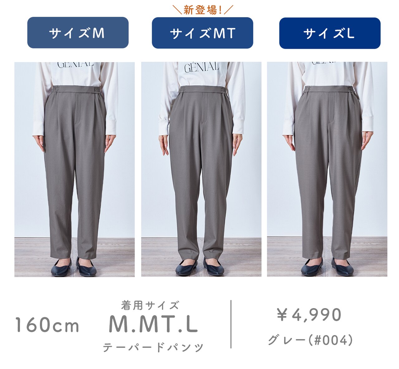 Mサイズよりも丈が長く、裾にワンクッションが入ることで程よいリラックス感を演出。ヒールで合わせればバランスよく大人っぽく、裾を軽く調整すればフラットシューズでもすっきり着こなせます。スタイルやシーンに合わせて丈感を楽しめます。