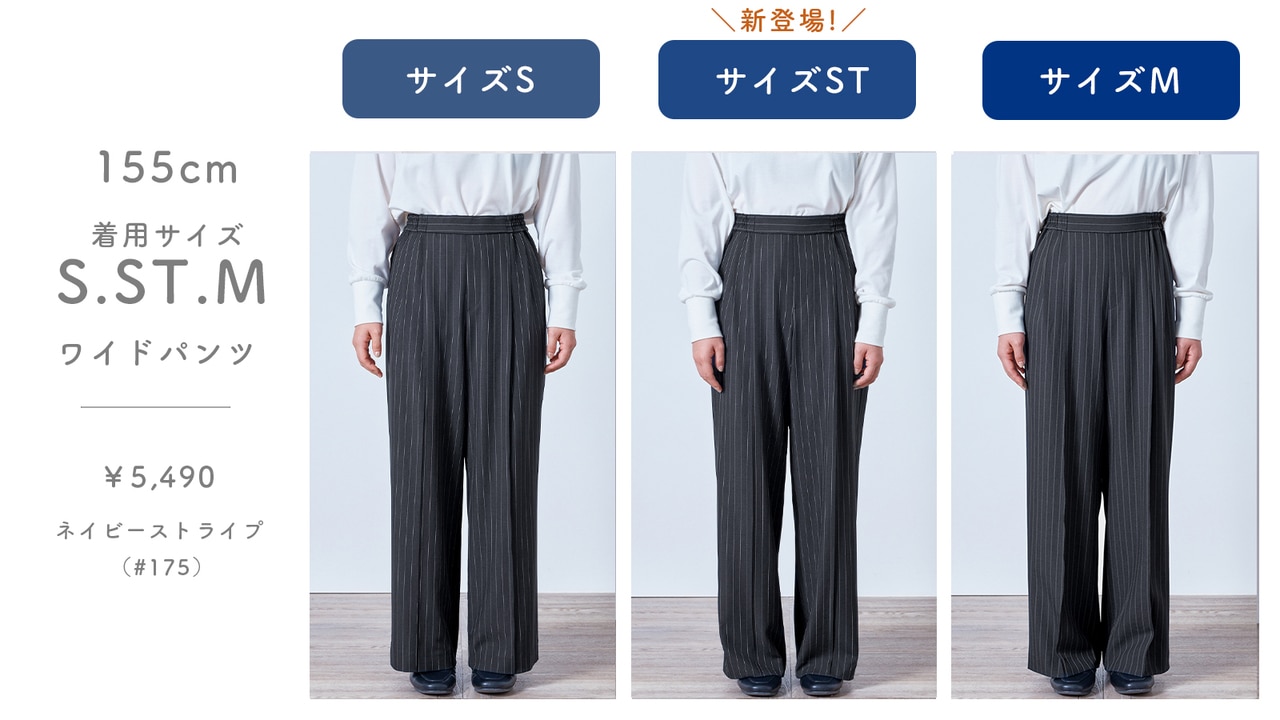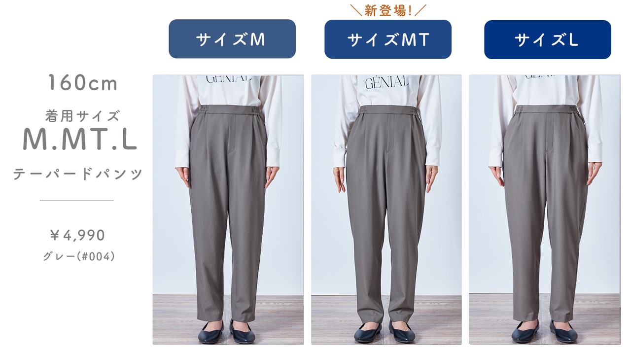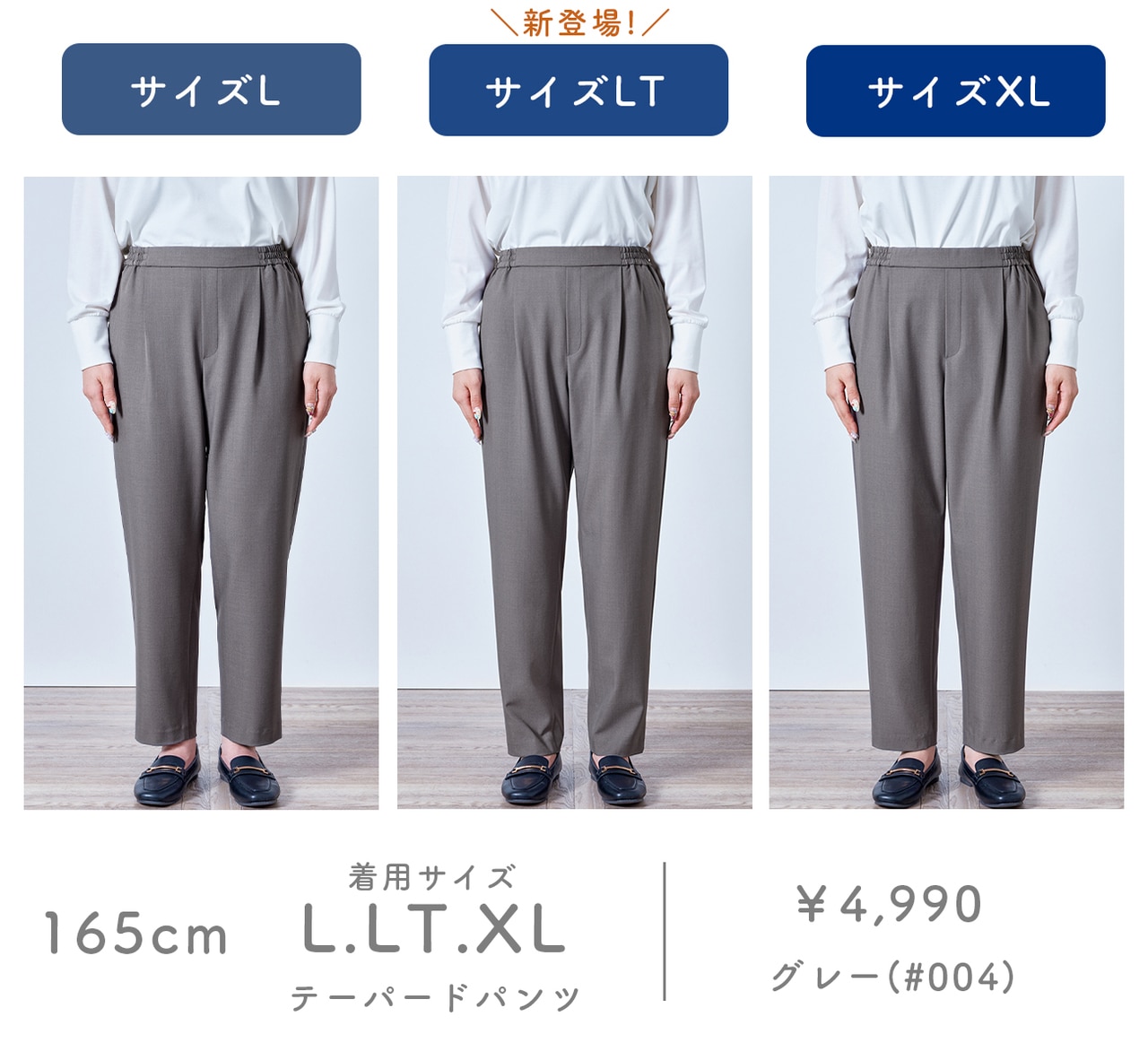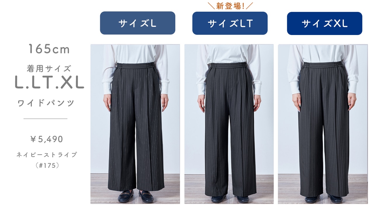 Mサイズよりも丈が長く、裾にワンクッションが入ることで程よいリラックス感を演出。ヒールで合わせればバランスよく大人っぽく、裾を軽く調整すればフラットシューズでもすっきり着こなせます。スタイルやシーンに合わせて丈感を楽しめます。