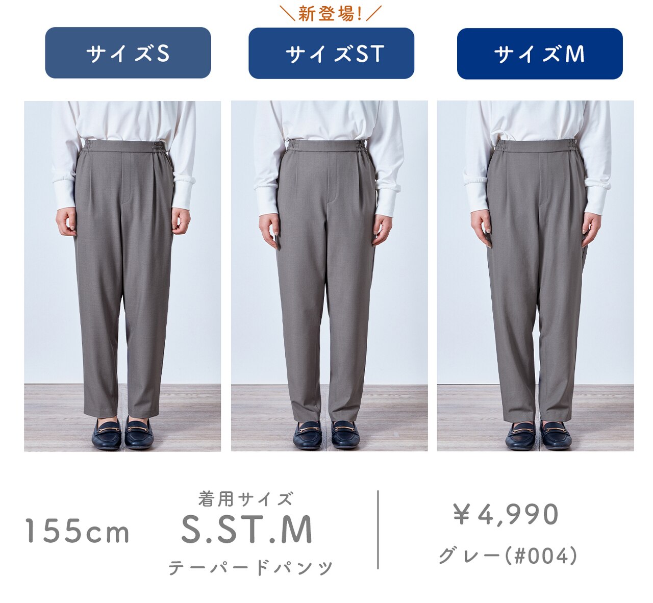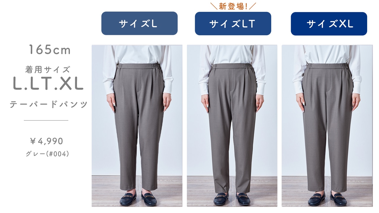 テーパード型はヒップゆったり&裾すっきりの絶妙ライン、ワイド型は裾に向かって程よく広がる旬バランス。どちらもウエストゴム+調節紐で快適な穿き心地とサイズ調整ができ、通勤からデイリーまで毎日頼れる万能パンツです。