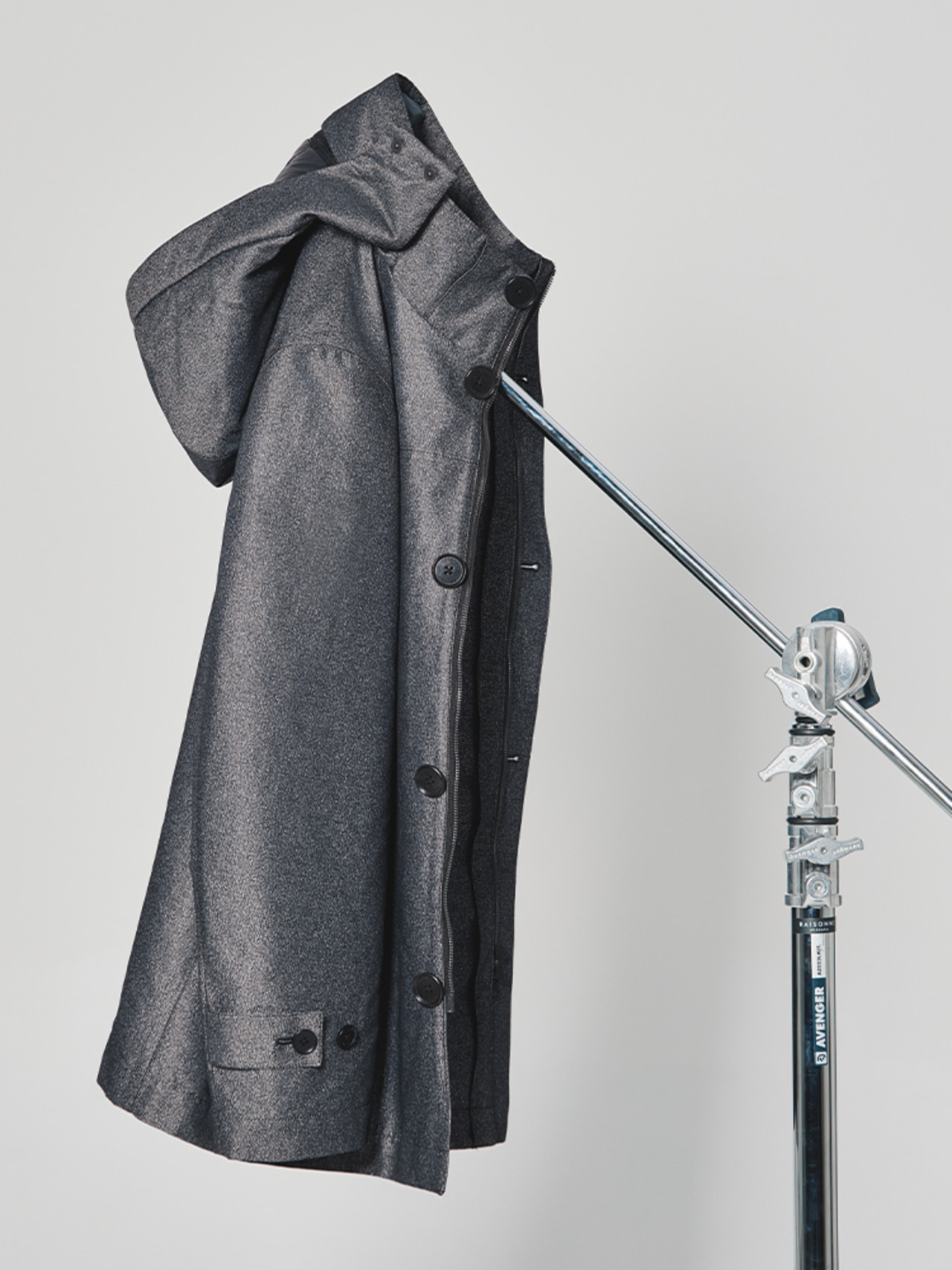 さらにフードを外せば、端正なスタンドカラーに変化。