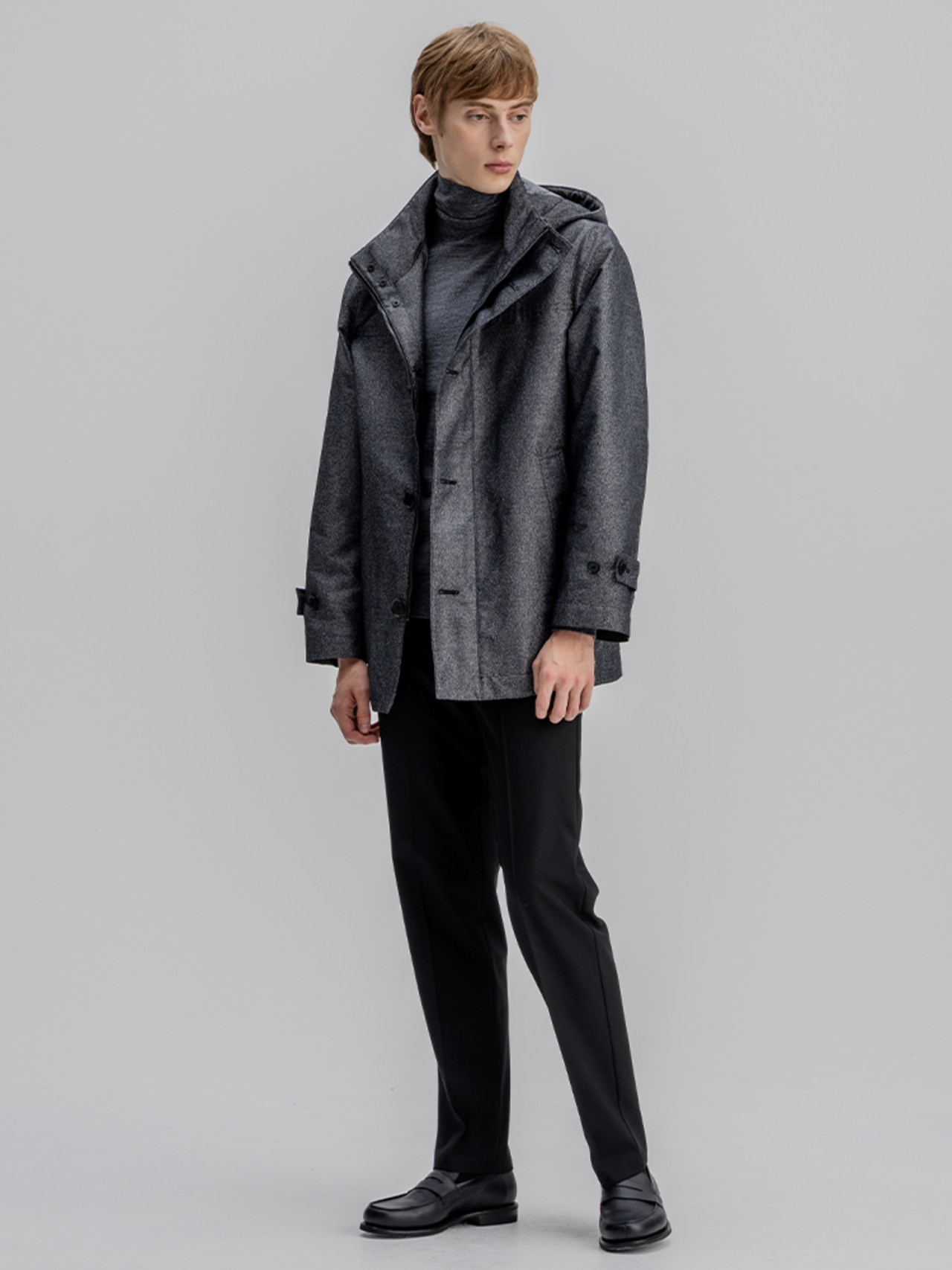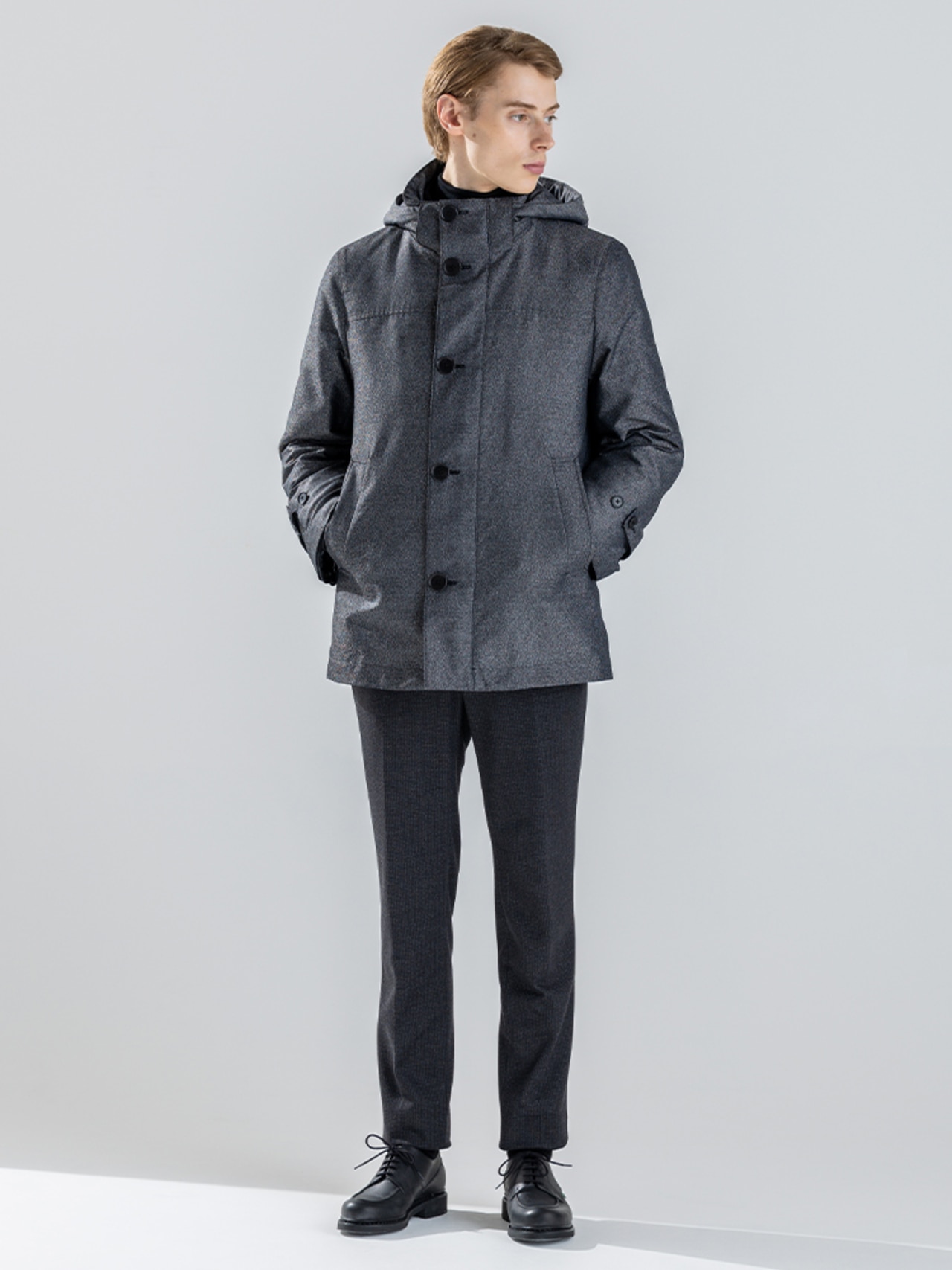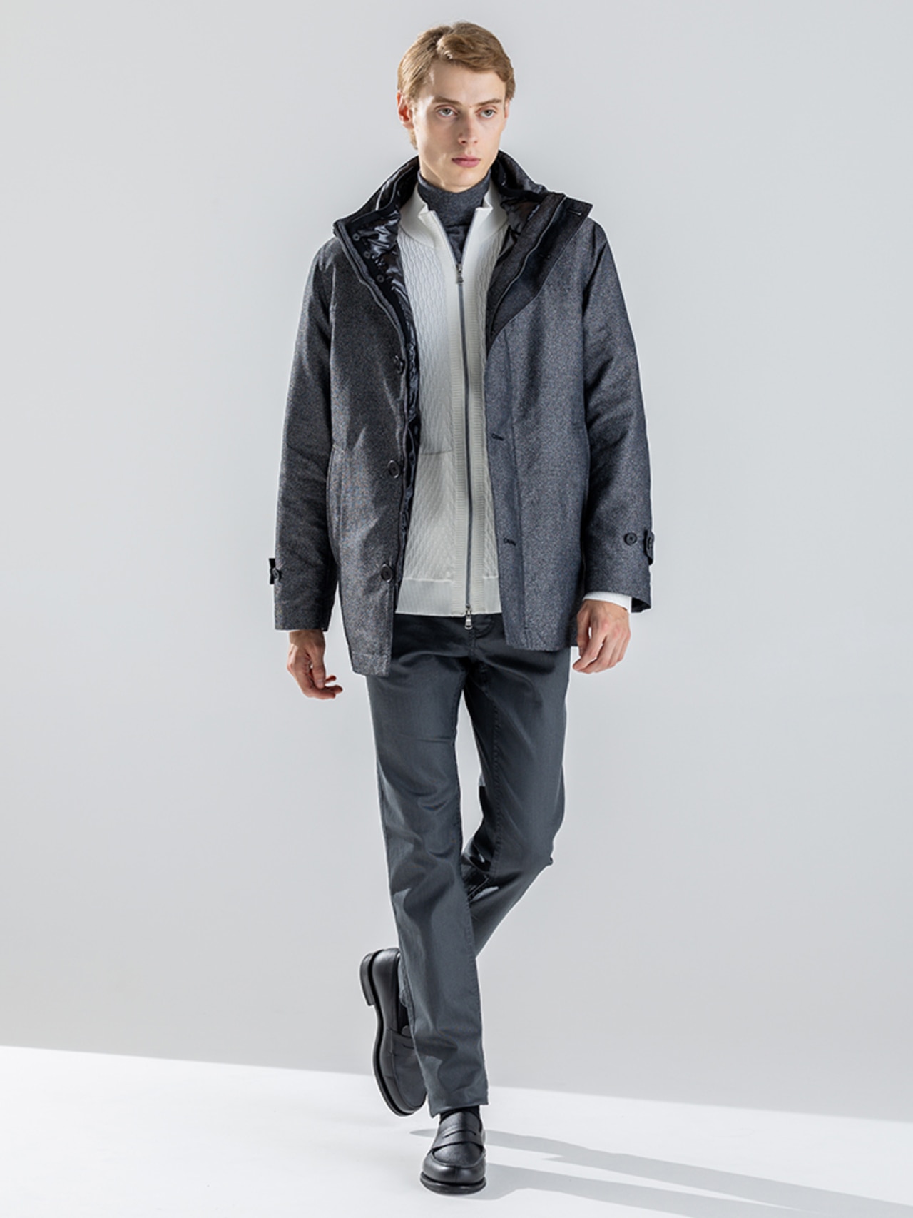 さらにフードを外せば、端正なスタンドカラーに変化。