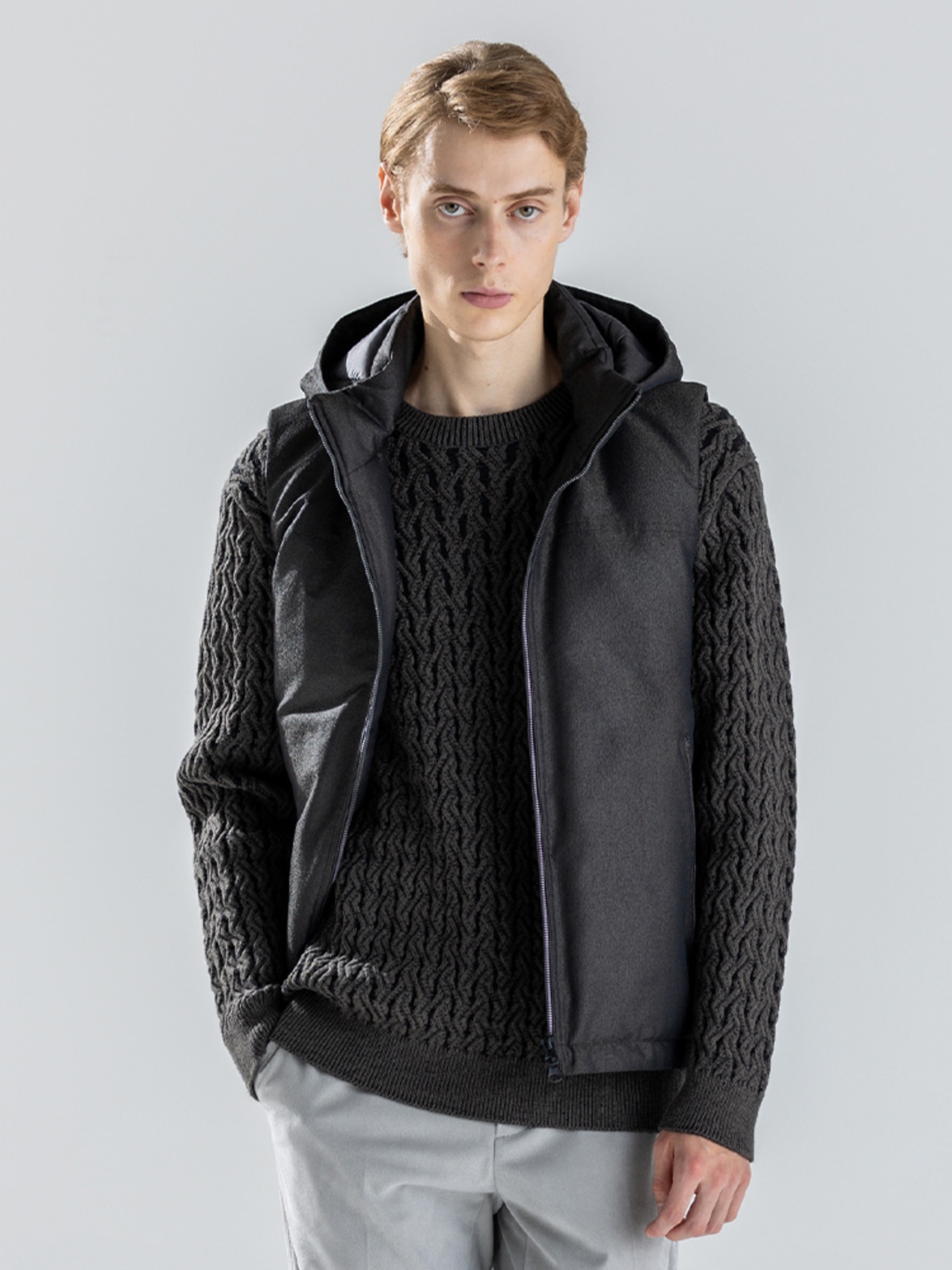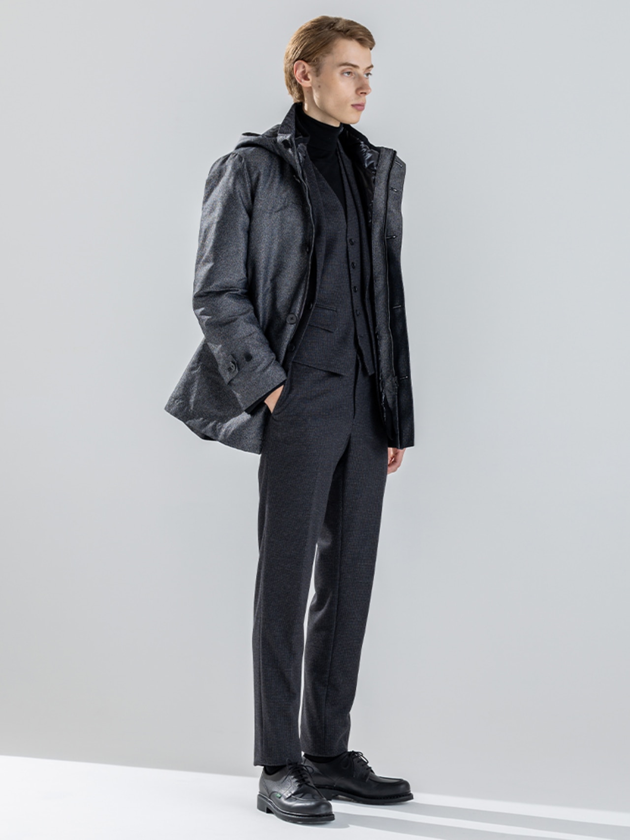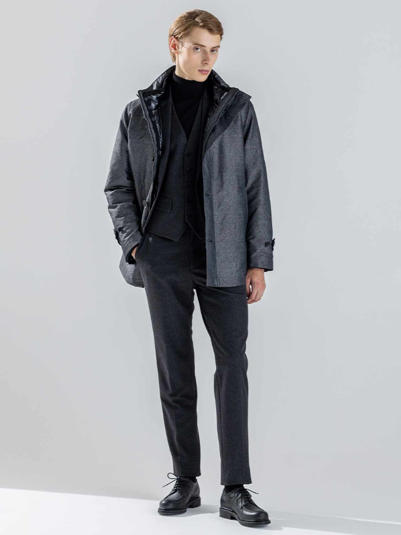さらにフードを外せば、端正なスタンドカラーに変化。