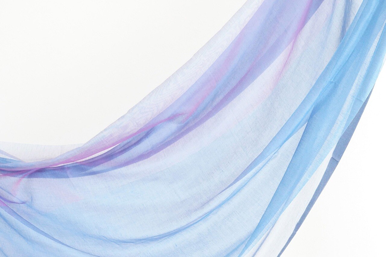たっぷりとしたサイズのものでも畳むと手のひらの中に収まるほどの軽やかさ。経糸と緯糸が混ざり合って生み出す色は深みと明るさを描き出します。