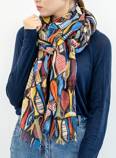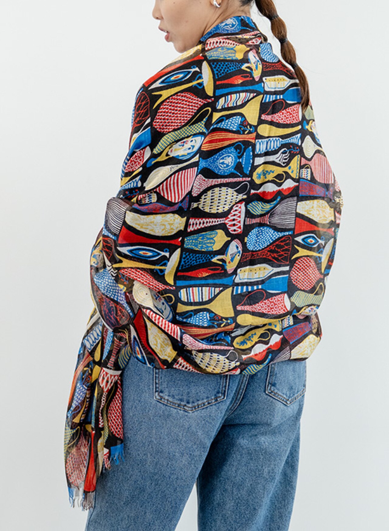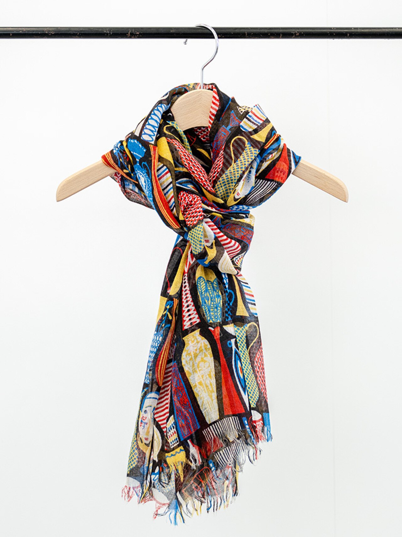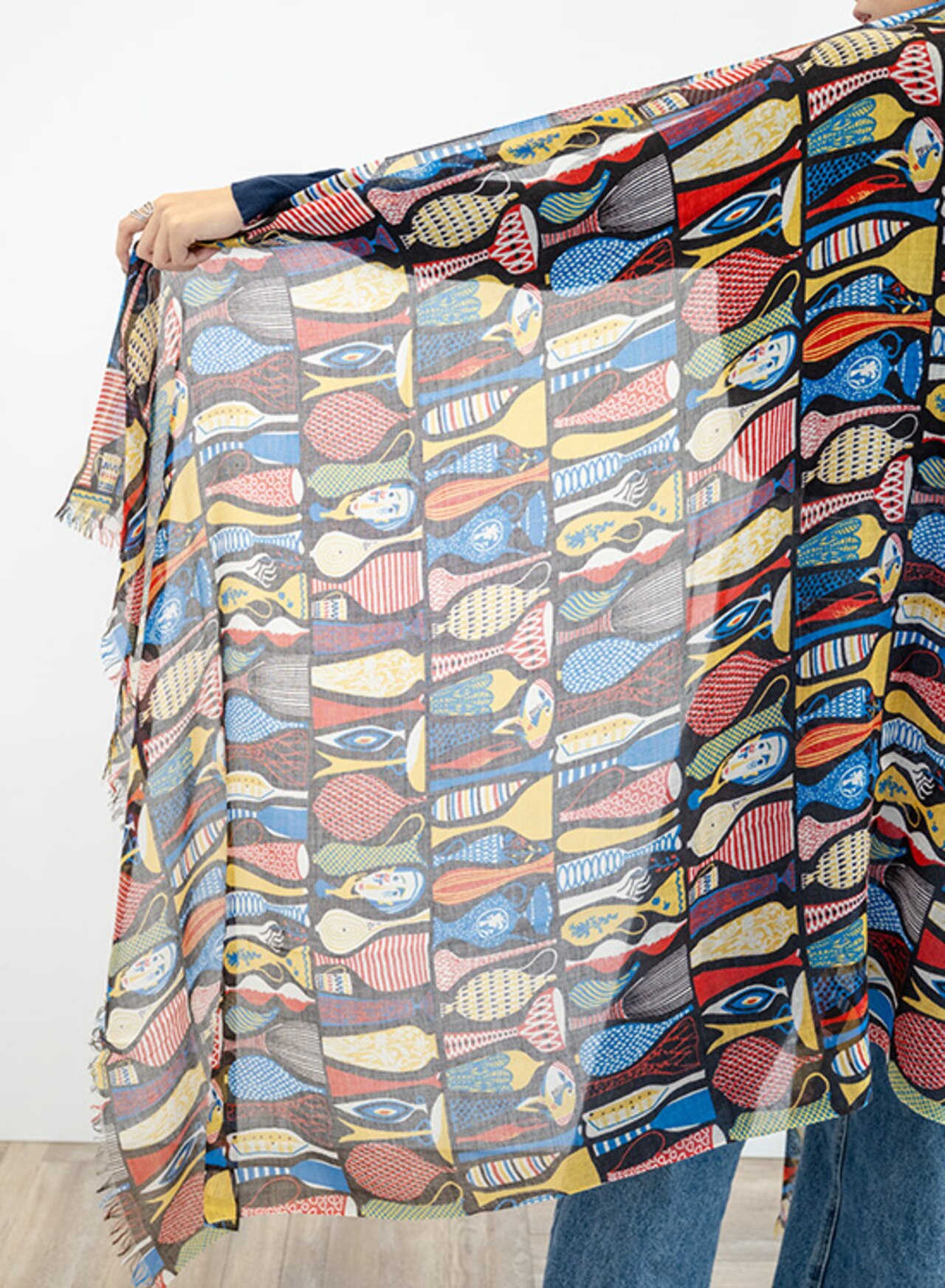 オリジナル生地「シルクカシミア」に、北欧の巨匠スティグ・リンドベリの人気柄【ポテリー】をプリントした一枚。