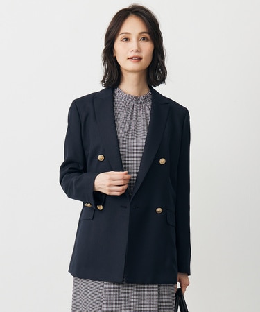クラシカルで端正な表情のダブルジャケット。きちんと感がありながらも、仕立ては半裏仕様で、着心地も重くならず快適。パンツにもスカートにも合わせやすく、通勤からお出かけまで幅広く活躍します。