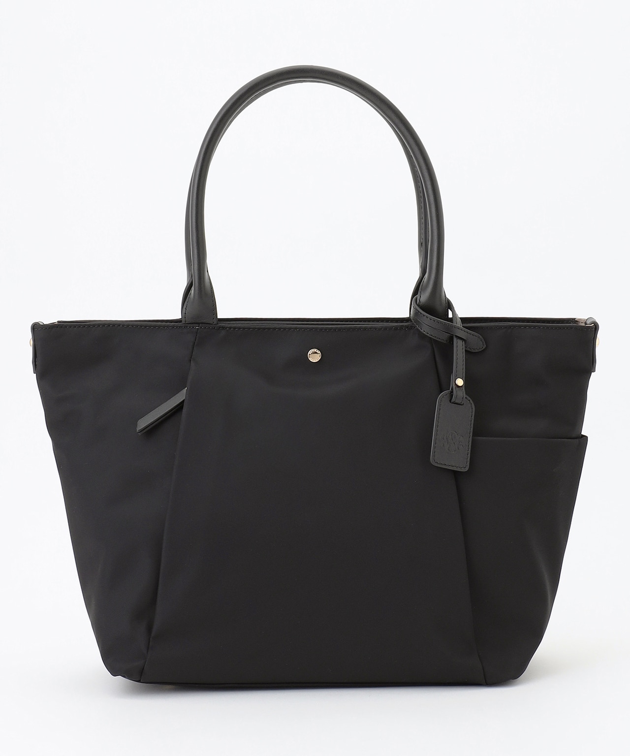軽やかなナイロンと、持ち手に高級感のある本革を使用した、容量たっぷりのトートバッグ。前と後ろ、サイドにポケットがついており、お出かけの際に小物が取り出しやすい仕様で、軽量でありながらも、ノートパソコン、水筒、お財布やポーチ、折り畳み傘など、通勤に必要なものは大抵すっきりと収まる抜群の収納力が魅力。撥水効果があり、小雨でも安心。