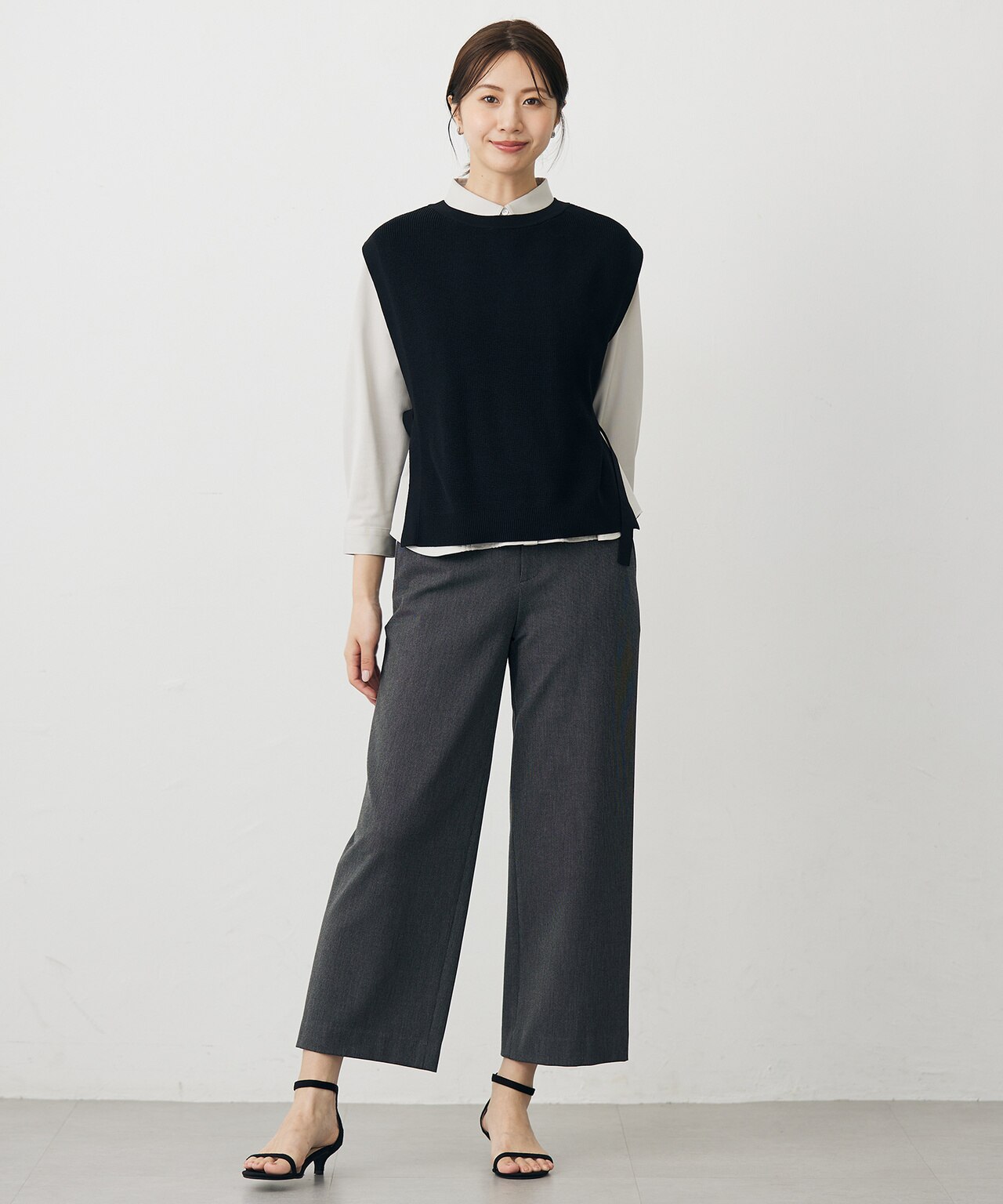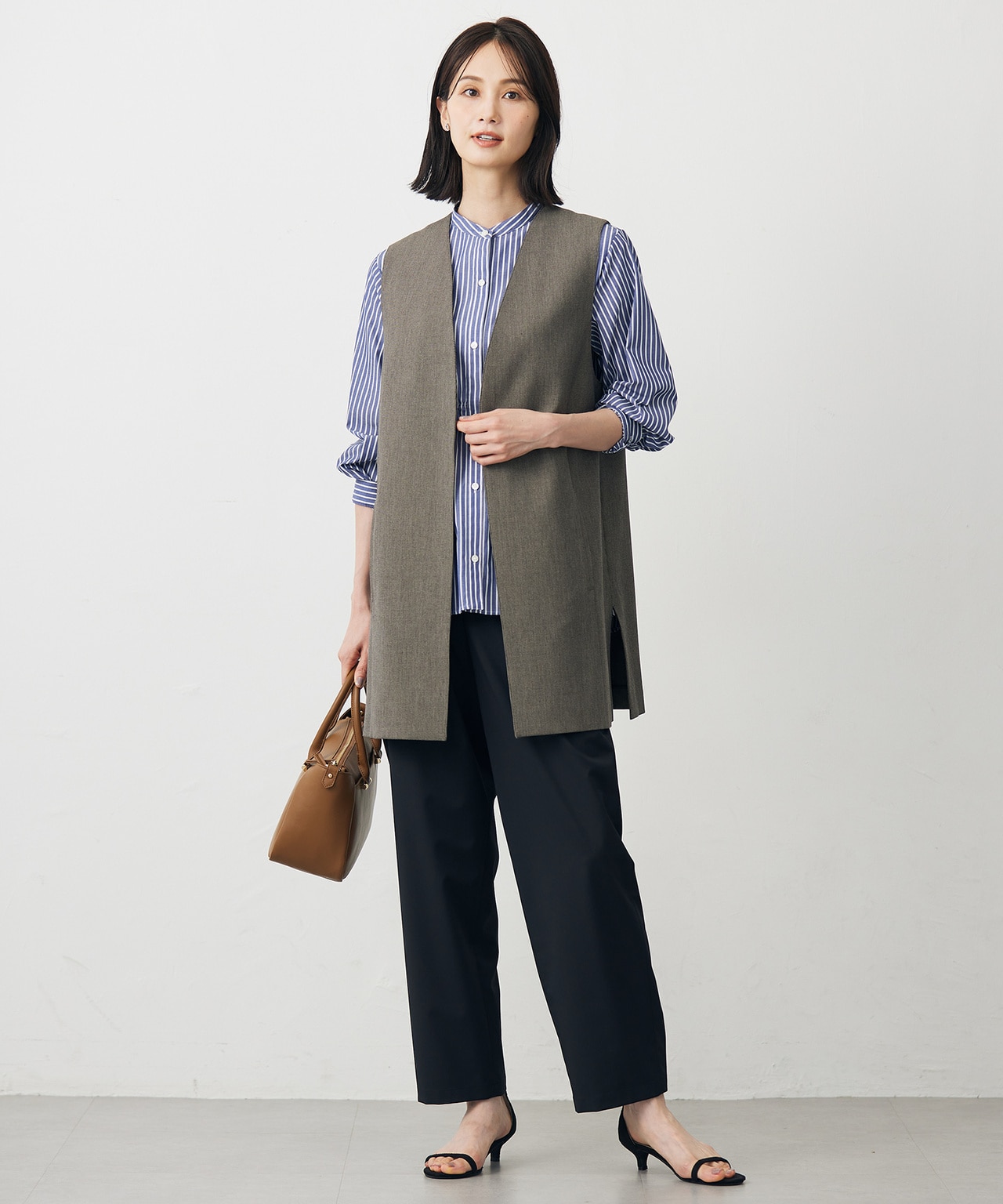 上品な雰囲気に仕上げたトレンドのジレ。スッキリとしたIラインシルエットが気になる腰回りを隠してくれるため、ワードローブに1枚あると重宝します。首回りをキレイに見せるノーカラーで合わせるトップスを選ばず、気温により半袖や長袖などを使い分けることでロングシーズン活躍.。同素材のパンツとセットアップで、通勤スタイルにもおすすめです。