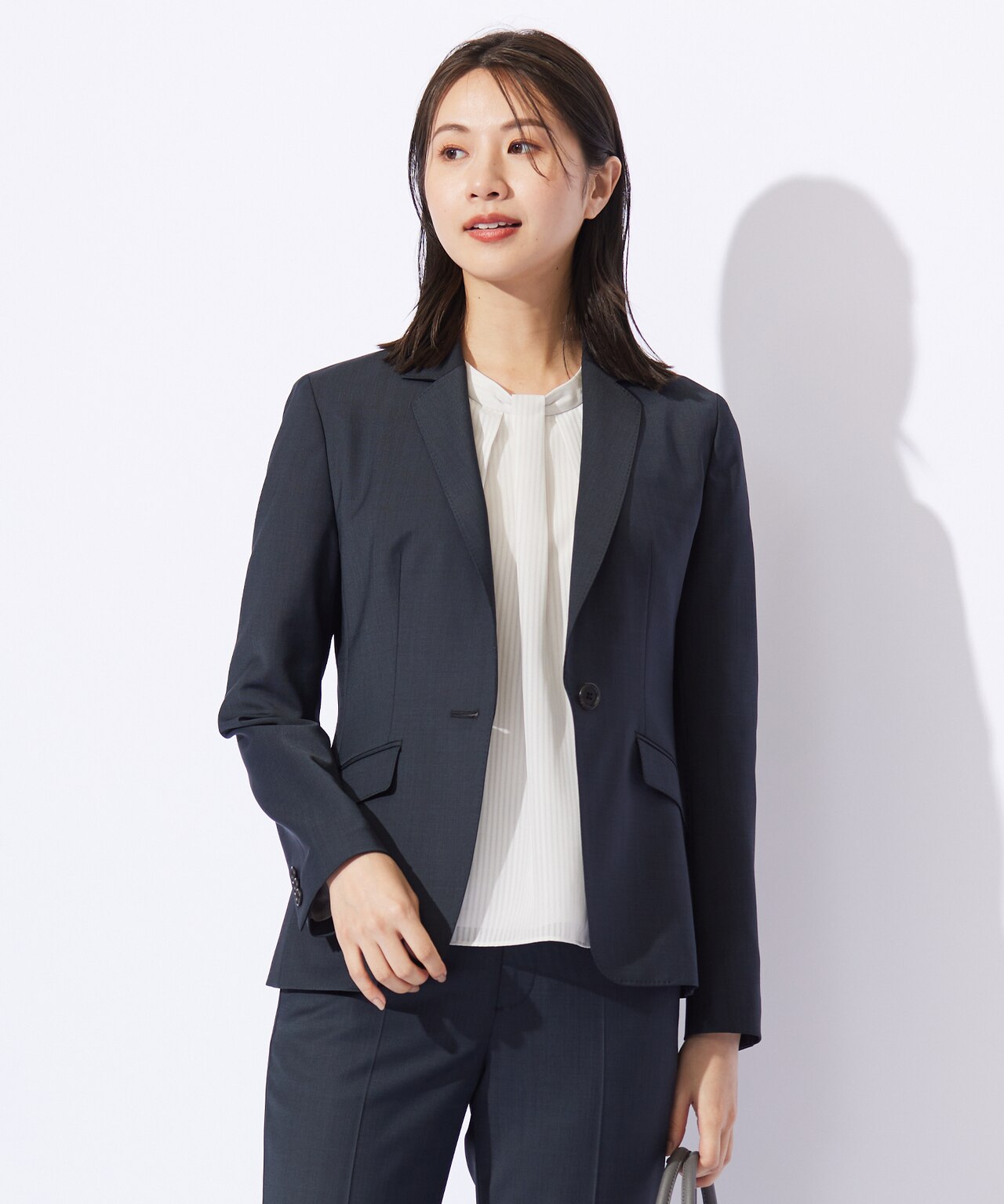 長袖でリターンできる仕様の、1つボタンのテーラードジャケット。スカートとパンツのどちらにも合わせやすいよう、レングスは60cmにしています。肩パットは無しですが、きれいなシルエットと楽な着用感を実現。セットアップでの着用はもちろん、単品使いでも活躍します。