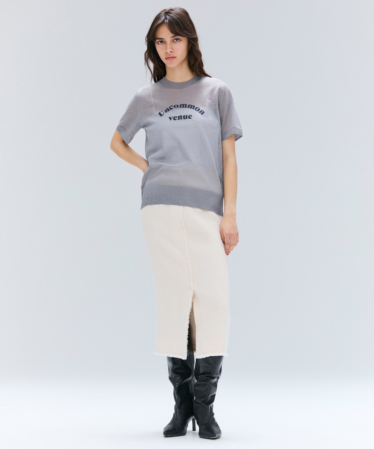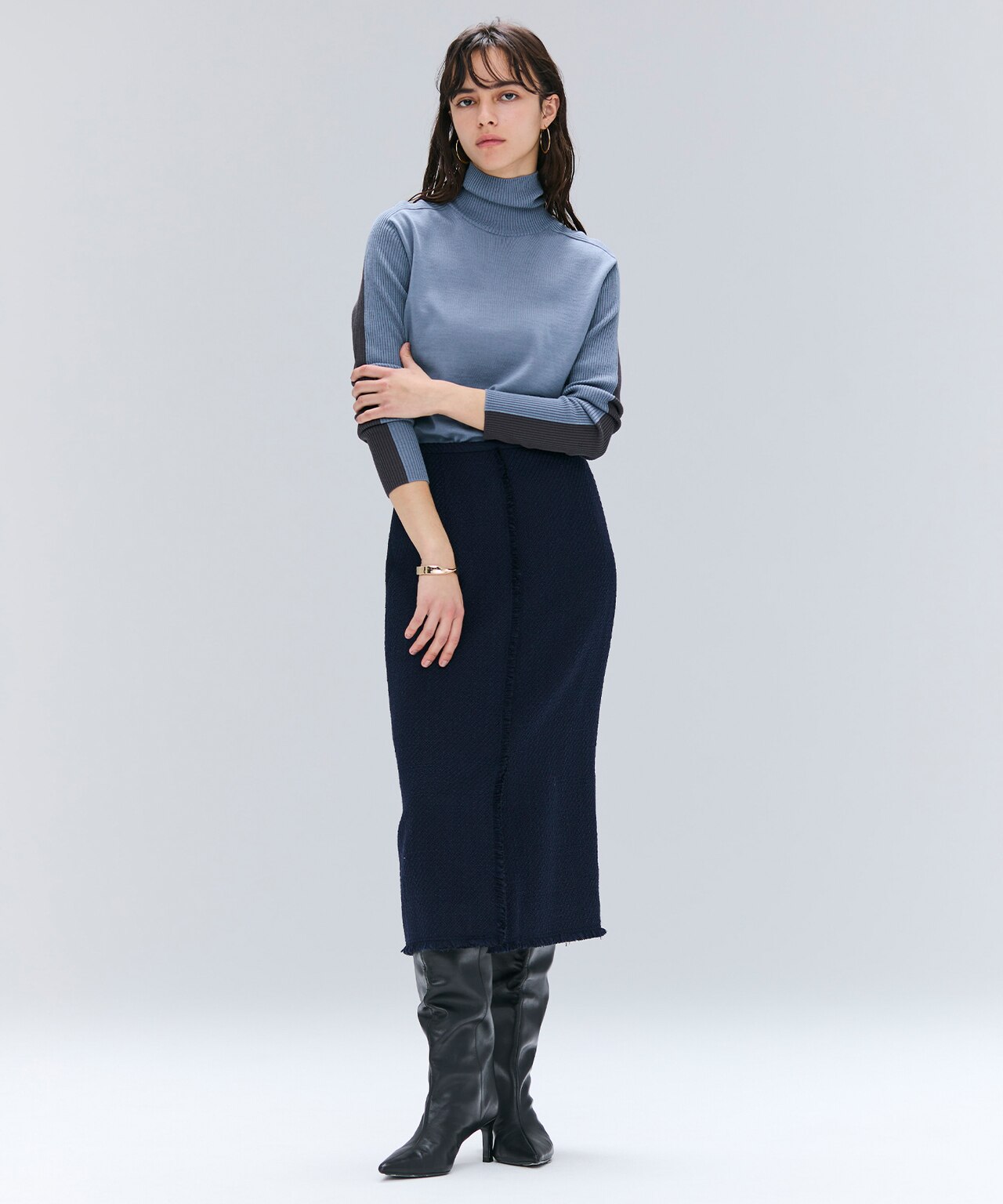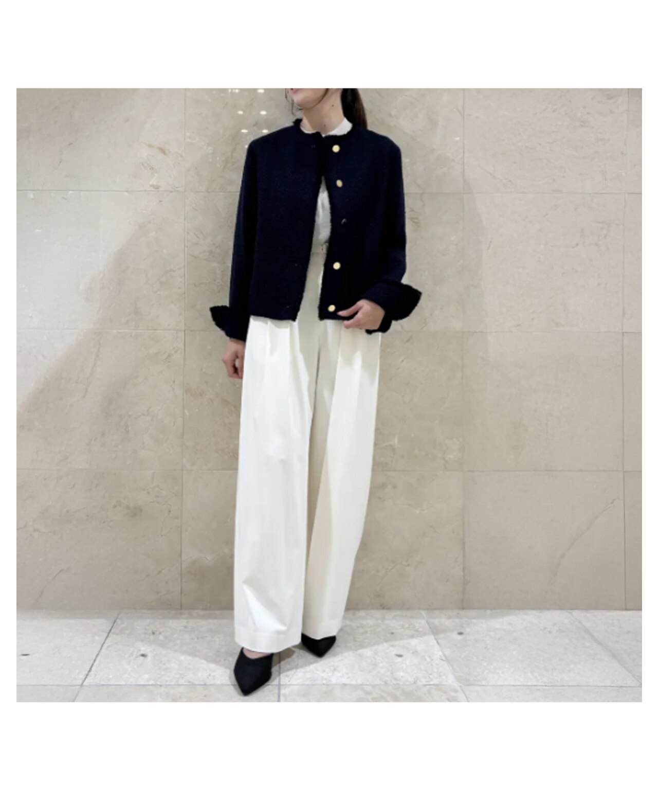 クラシックな風合いはそのままに、凛とした女性らさのあるクルーネックデザイン。