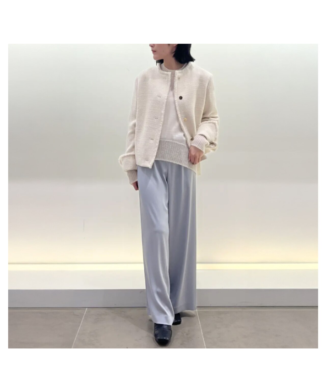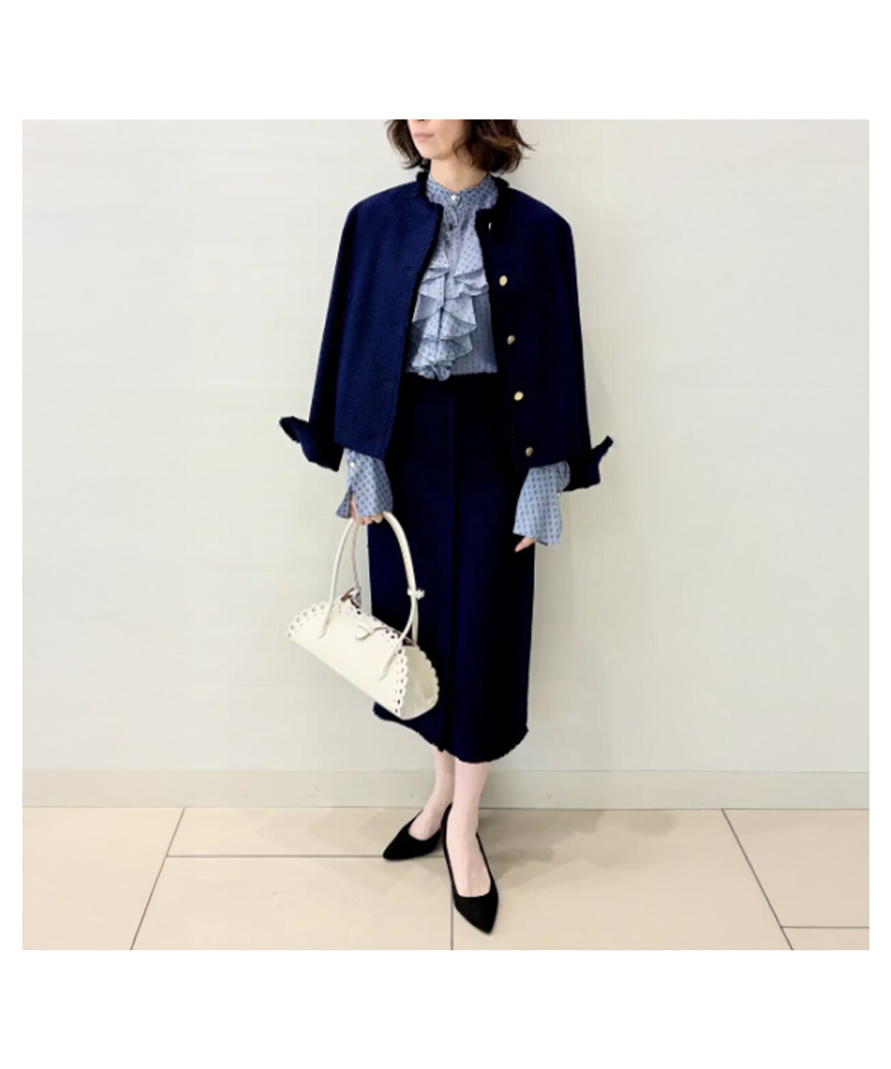 同素材セットはもちろん、単品使いでも華やかさをプラスする上品スタイル。