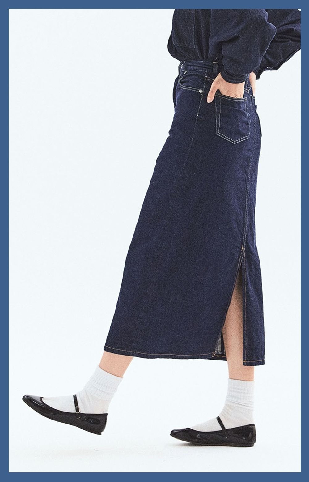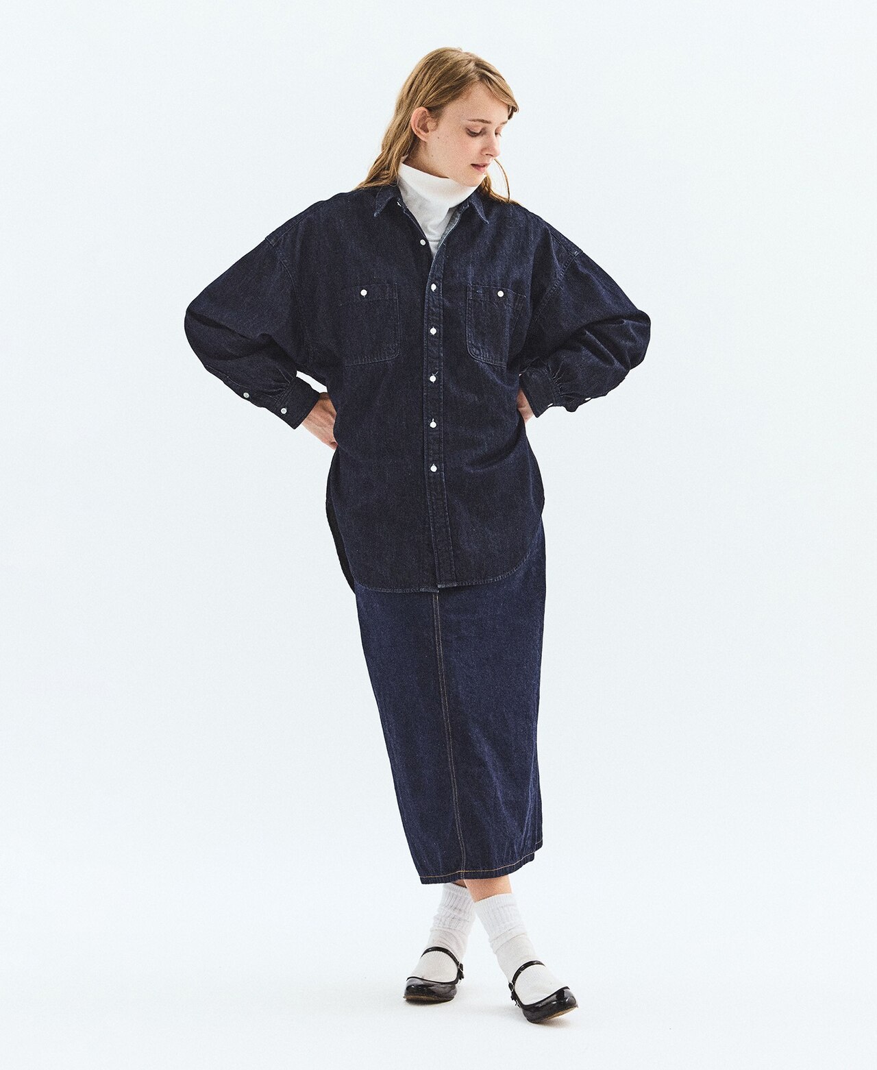 9オンスのデニムシャツと12オンスのマキシ丈スカートを合わせた、デニムオンデニムスタイル。