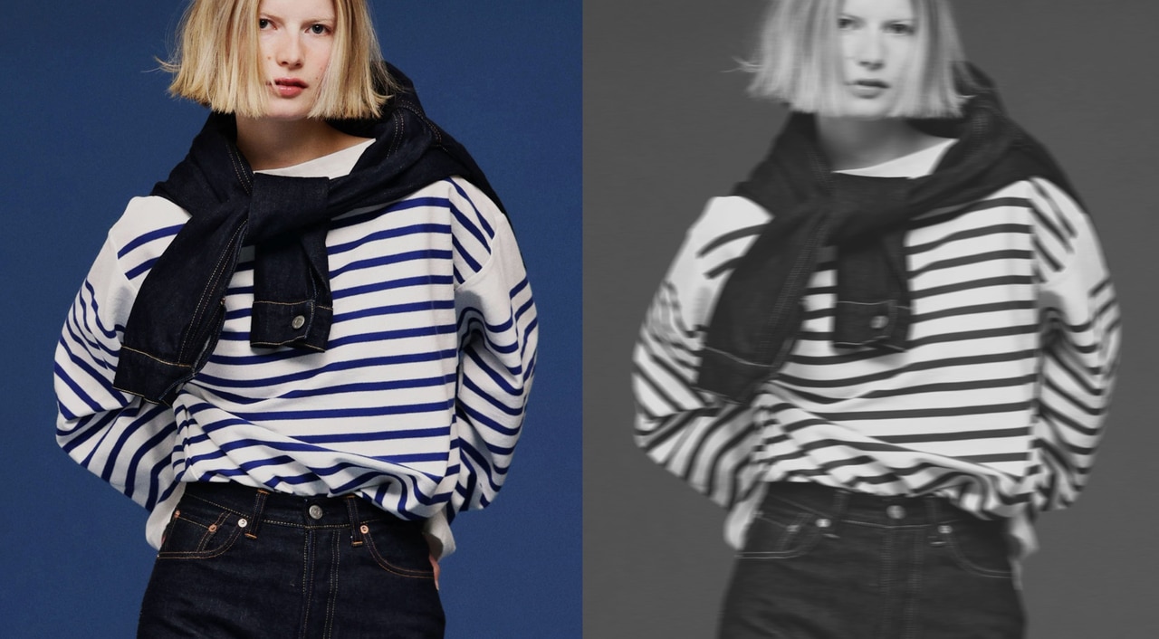 身頃と袖で切り替えたオリジナルのパネルボーダーが、定番アイテムに新鮮さを添える。