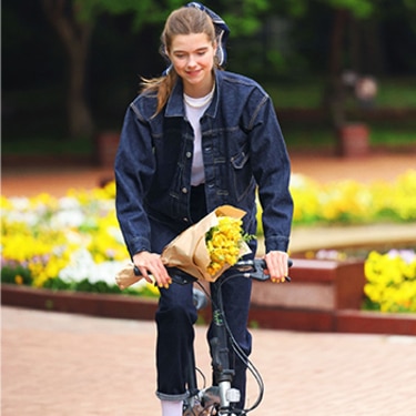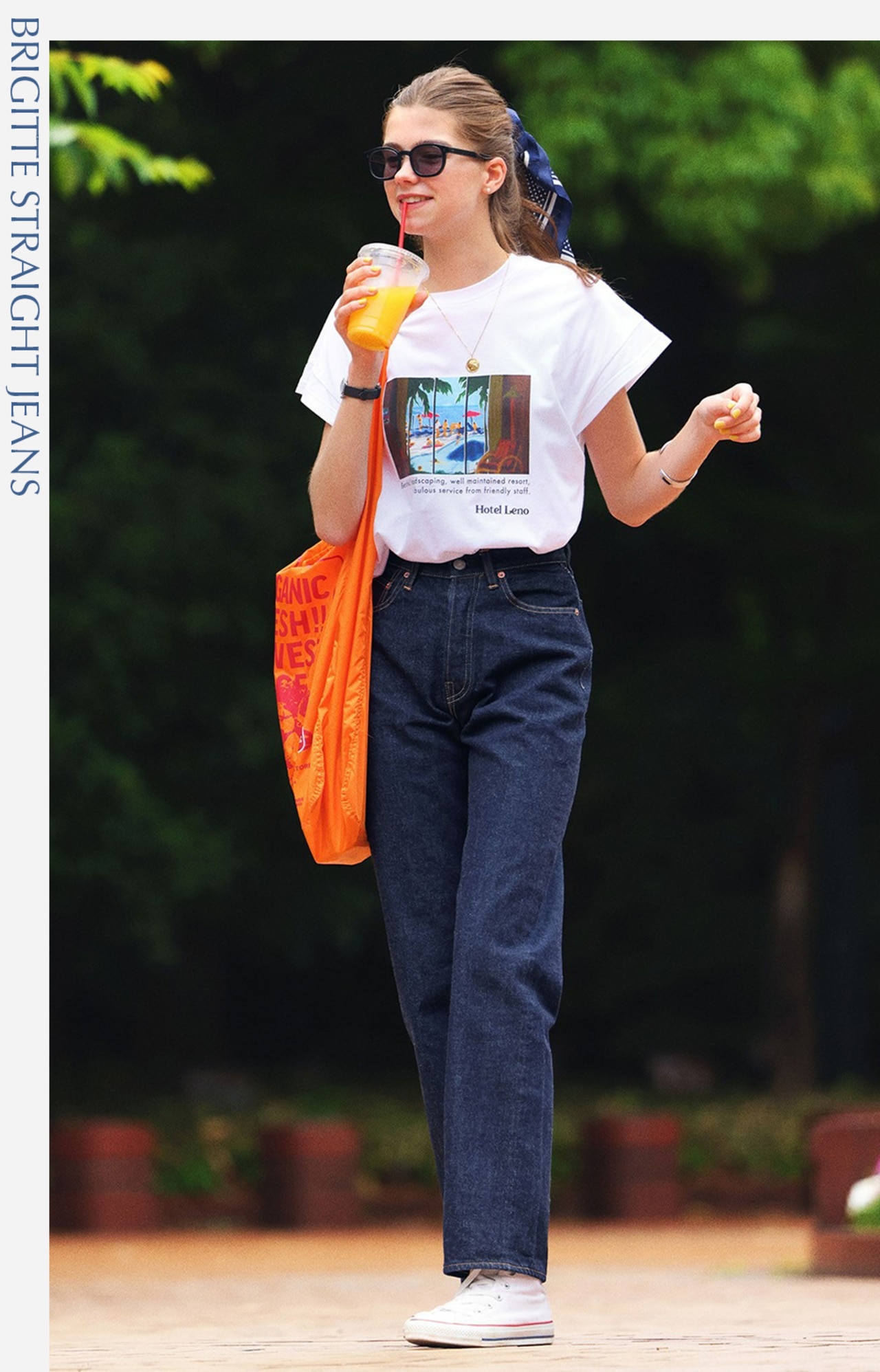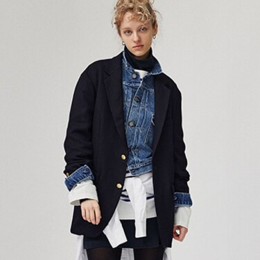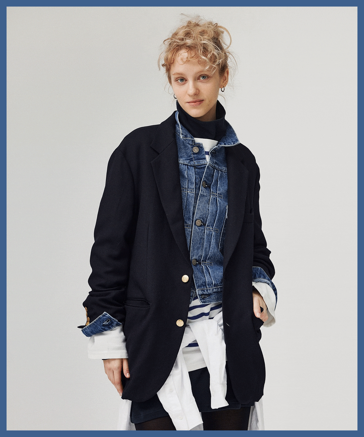 メンズウェアの定番を女性らしくリサイズしたデニムジャケットと、尾州産の紺ブレザーを重ねた、クラシックで洗練されたスタイリング。