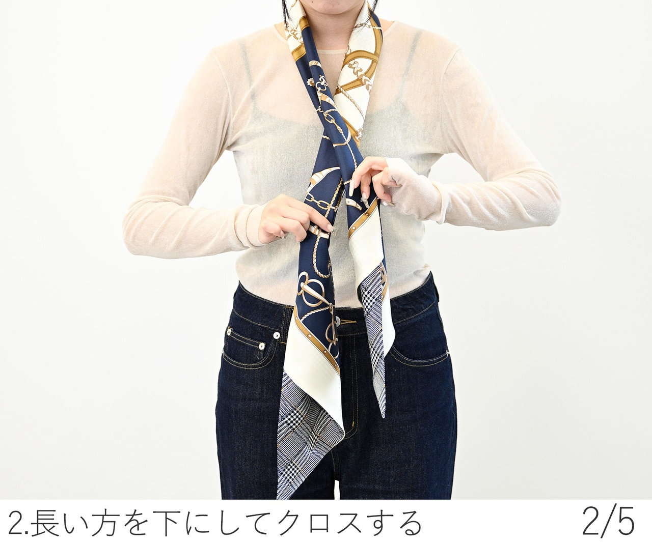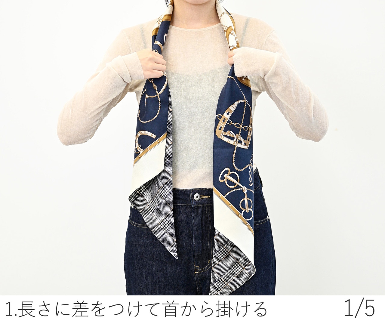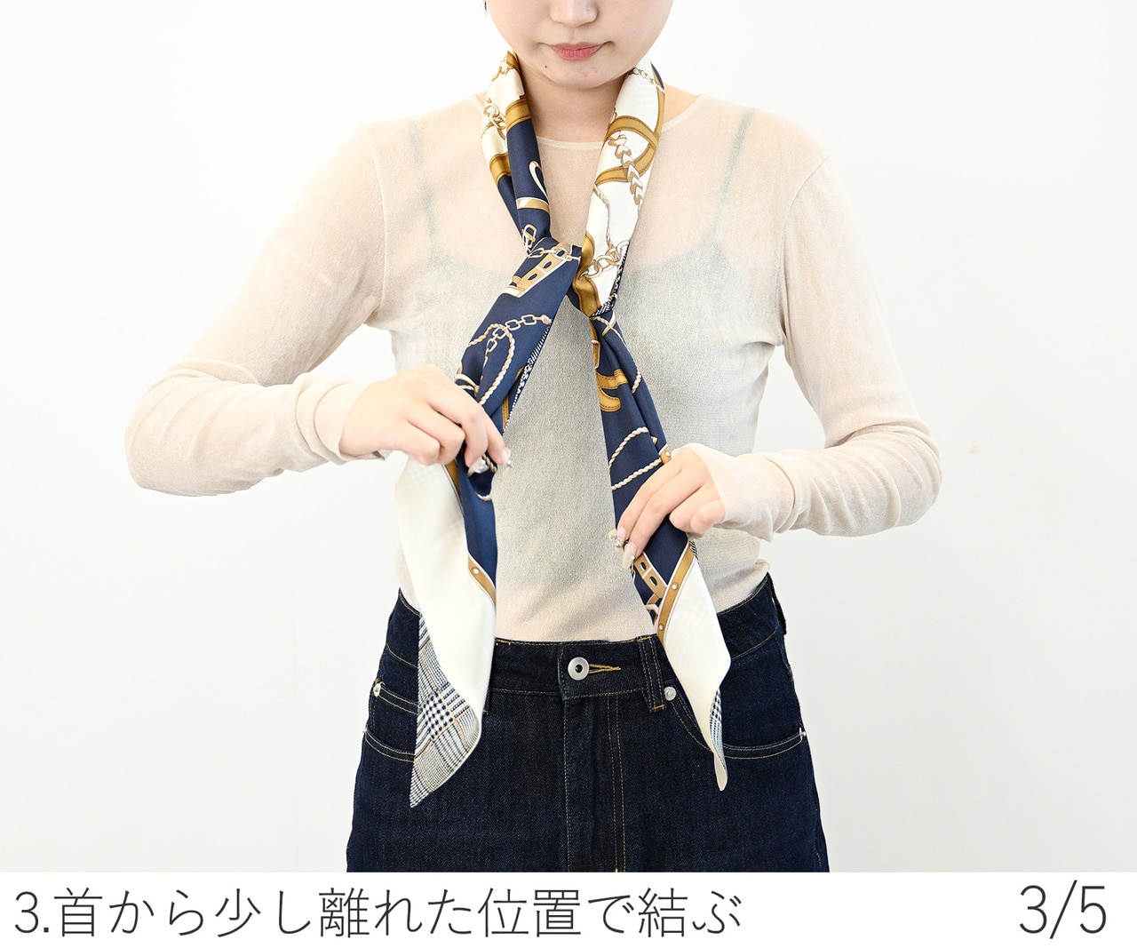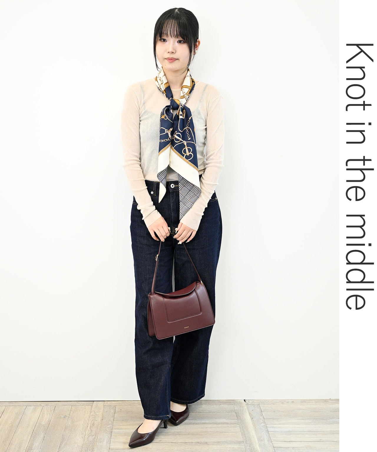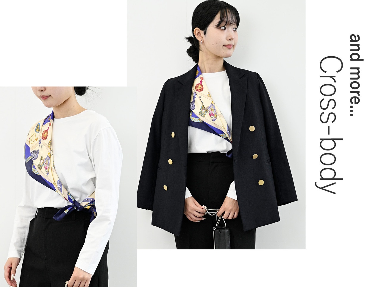 「たすき掛け」のジャケット合わせもおすすめです。三角に折り畳んだスカーフを斜めに掛け、腰位置で固結びするだけの簡単アレンジ。いつもとまた違った見え感で洗練された印象です。