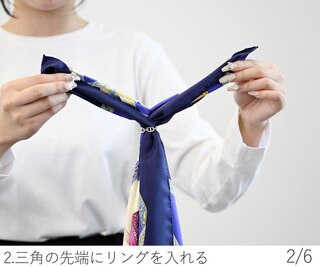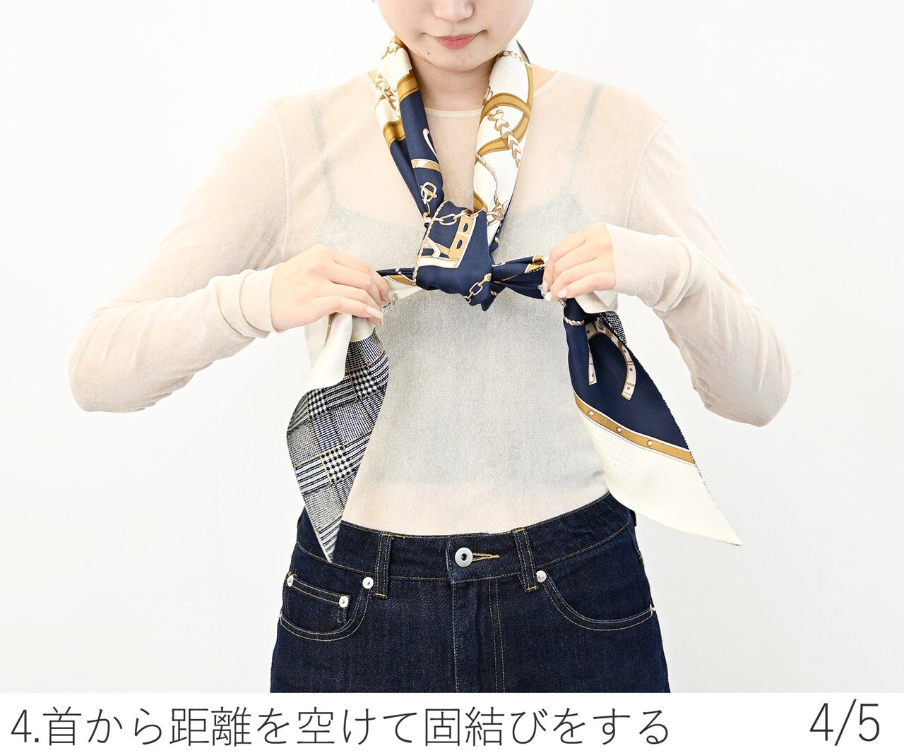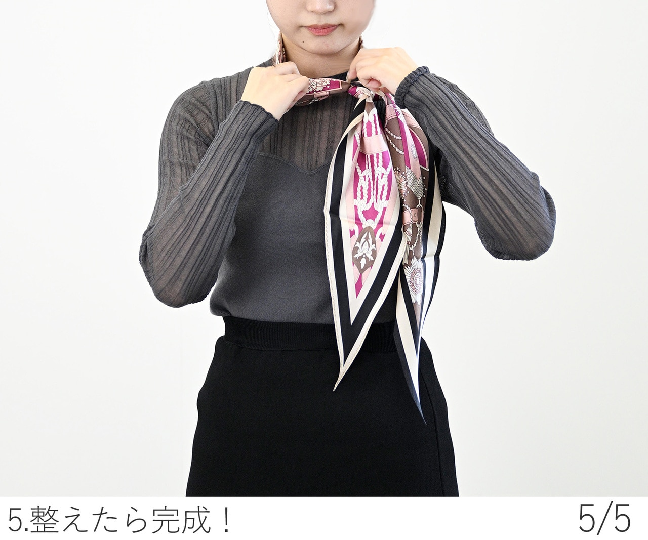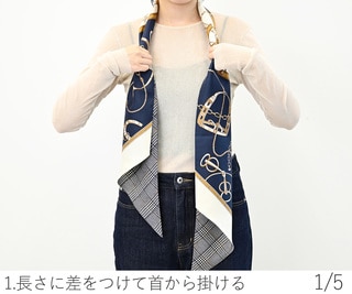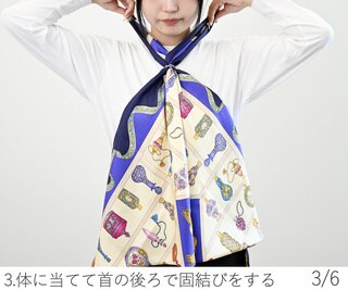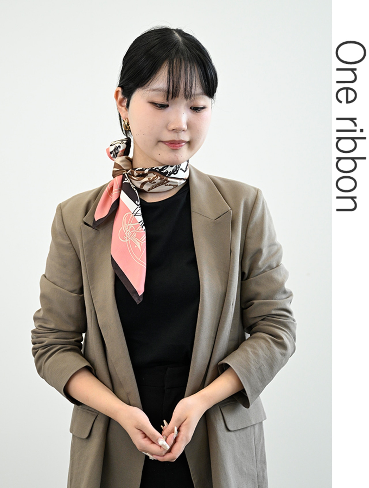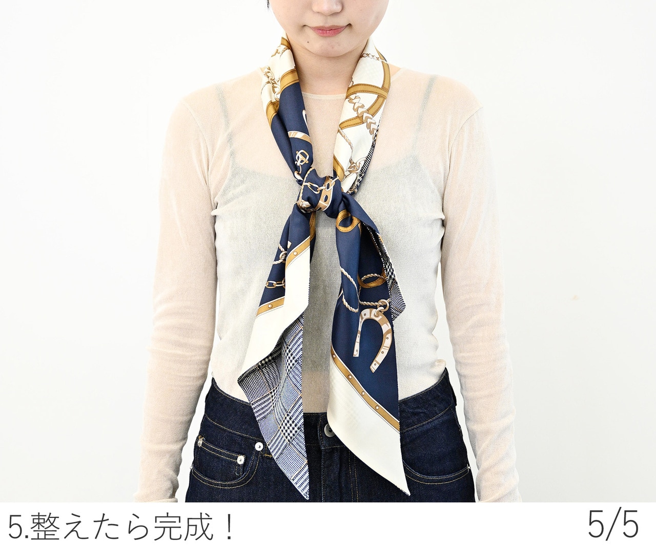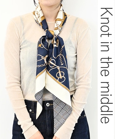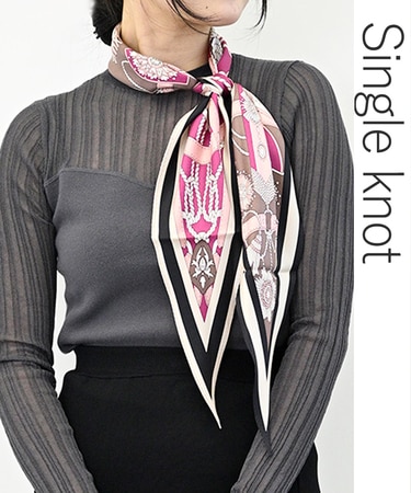 「たすき掛け」のジャケット合わせもおすすめです。三角に折り畳んだスカーフを斜めに掛け、腰位置で固結びするだけの簡単アレンジ。いつもとまた違った見え感で洗練された印象です。