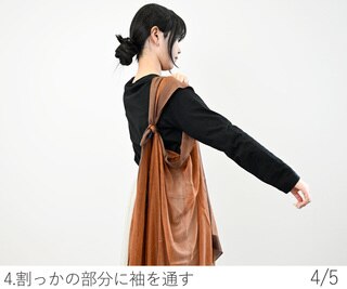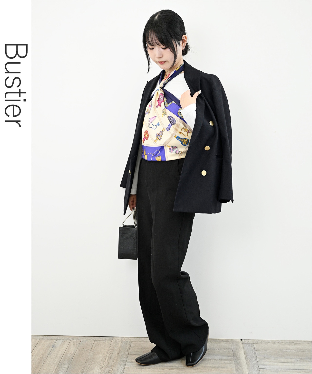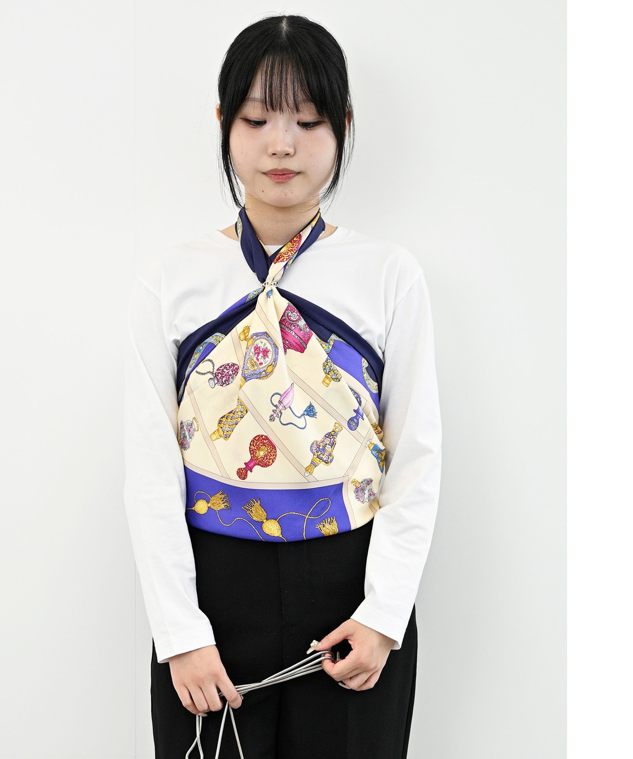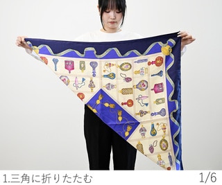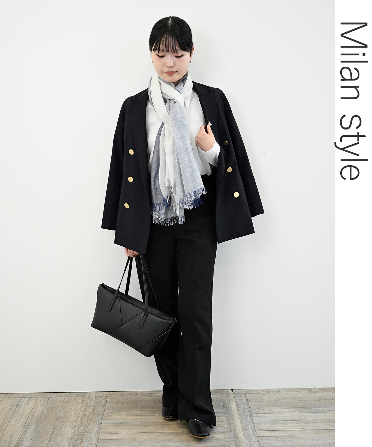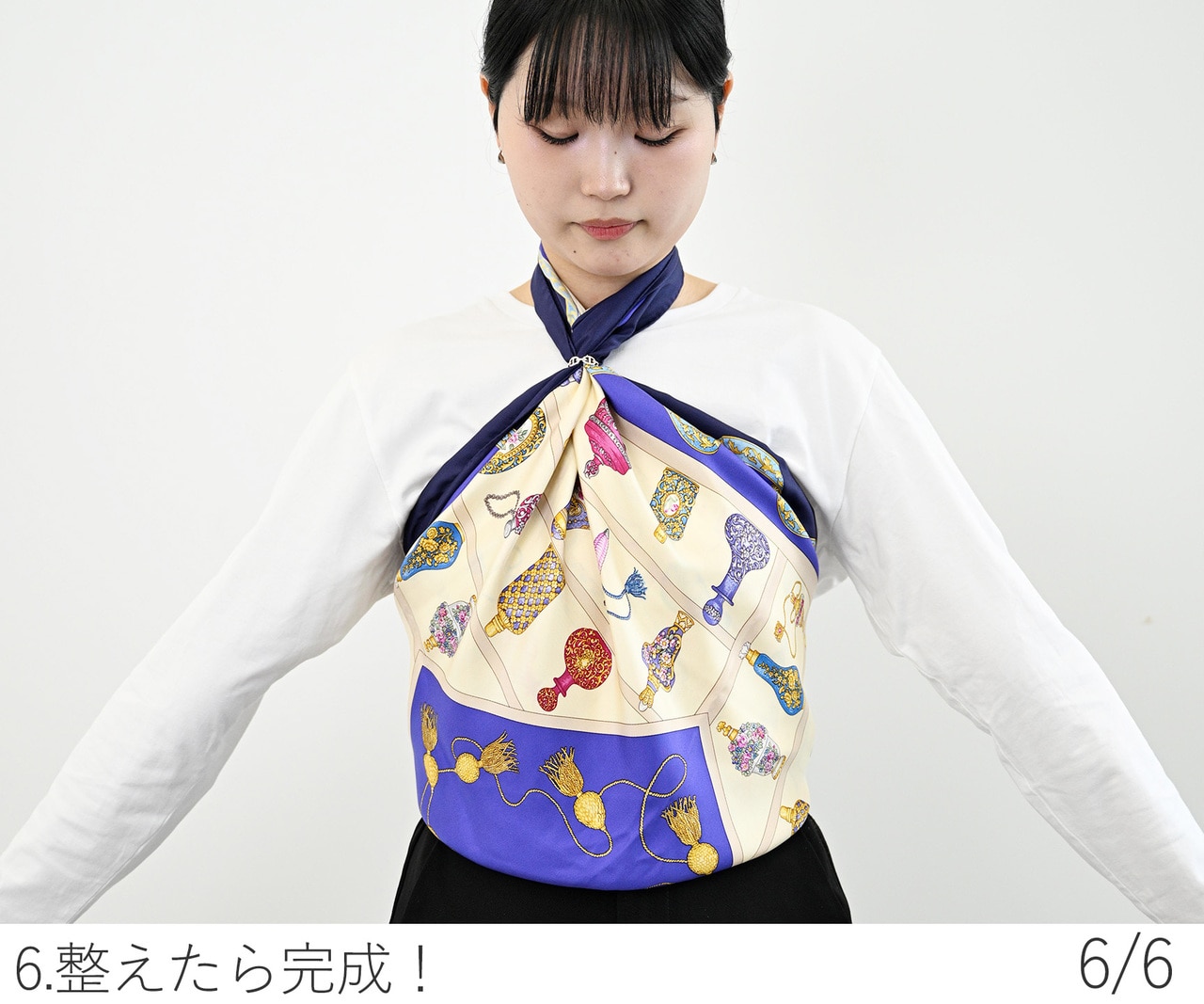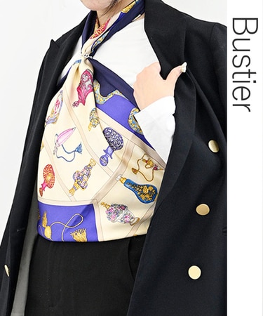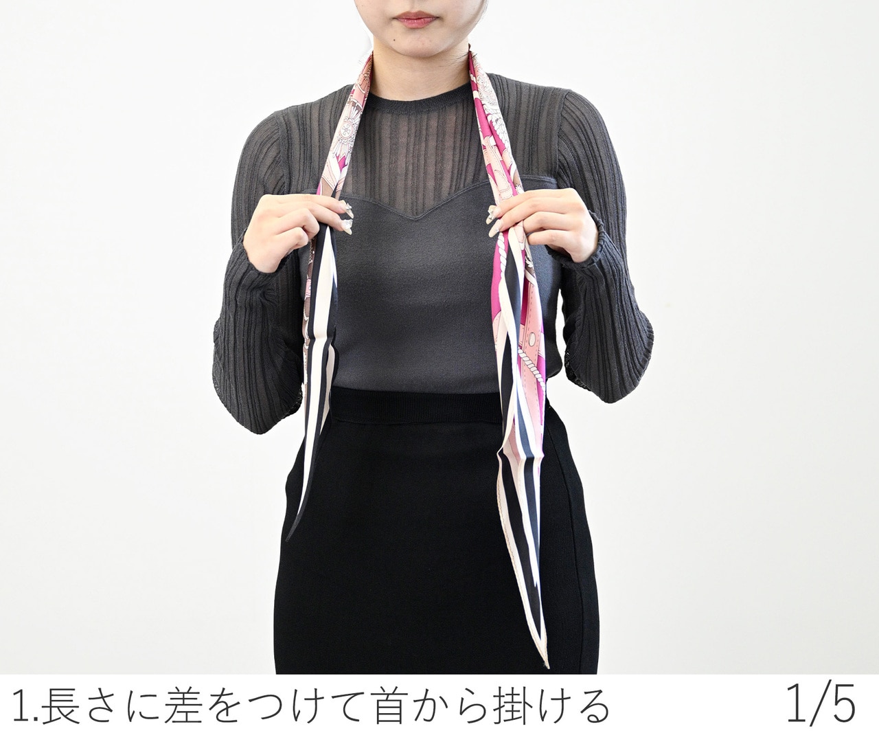 「たすき掛け」のジャケット合わせもおすすめです。三角に折り畳んだスカーフを斜めに掛け、腰位置で固結びするだけの簡単アレンジ。いつもとまた違った見え感で洗練された印象です。