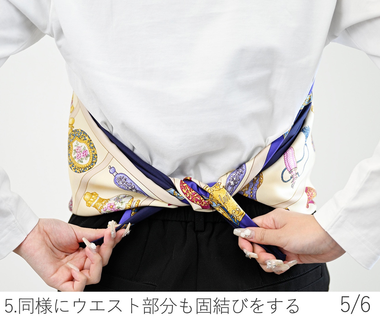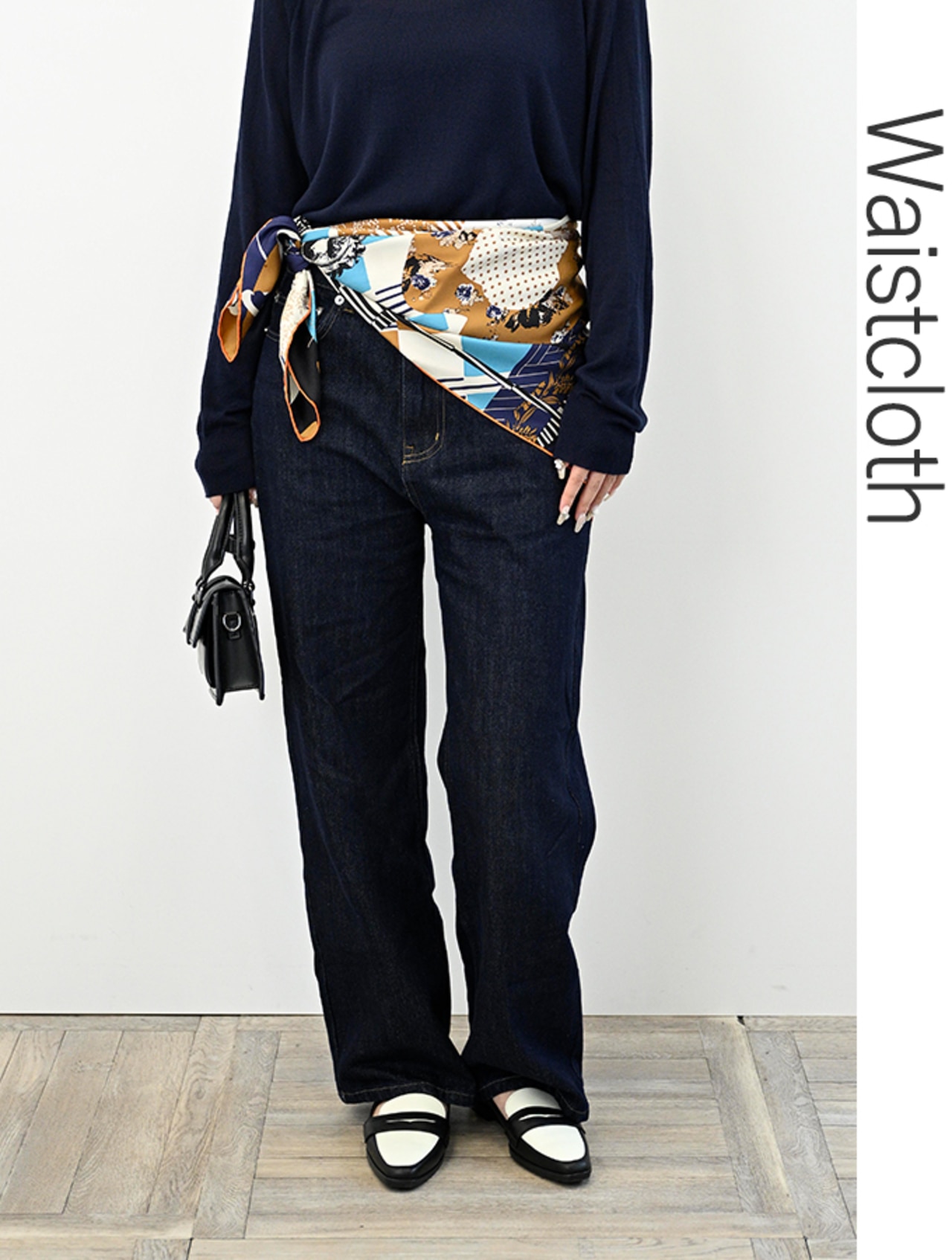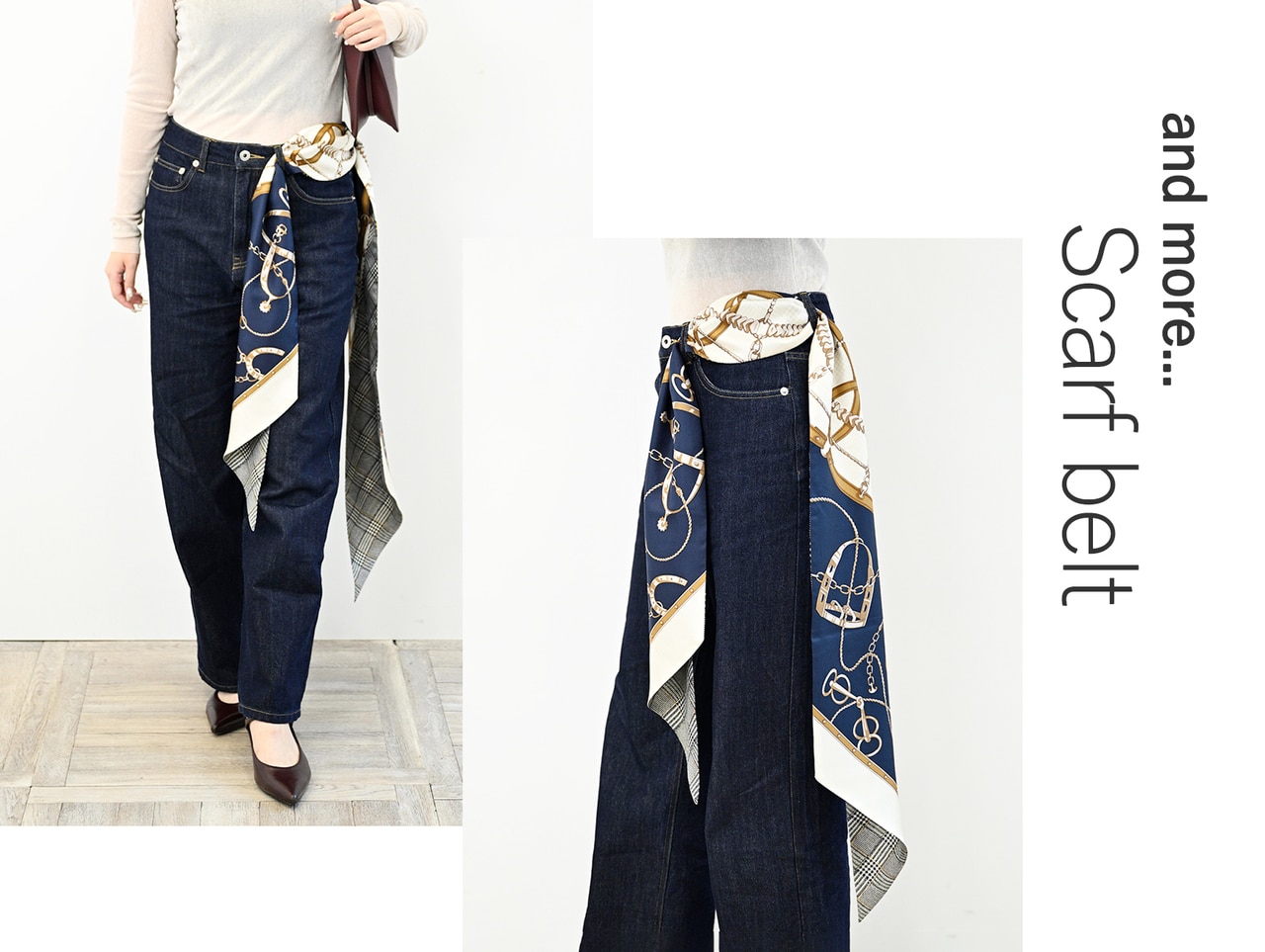 長めのスカーフは「ベルト」としても使えます。ボトムのベルトループに通してスカーフの両サイドを垂らすだけで、コーディネートのアクセントに。足も細長く見えて一石二鳥です。
