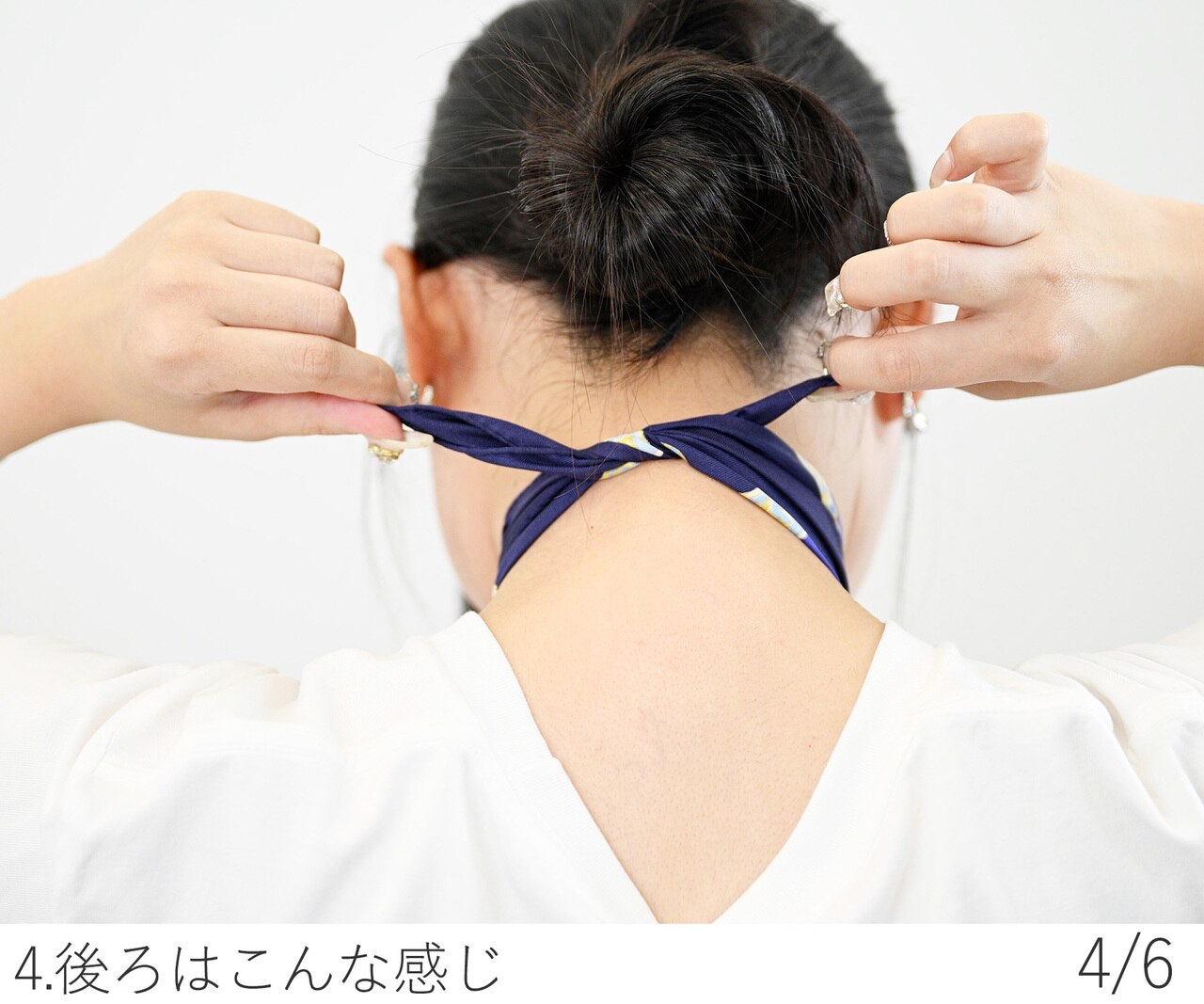 「ヘアバンド」も人気のアレンジです。後頭部にスカーフの中央を当て、頭の上に向かってスカーフを持ち上げ、頭のてっぺんでクロスした後にまた後頭部で固結びするだけ。