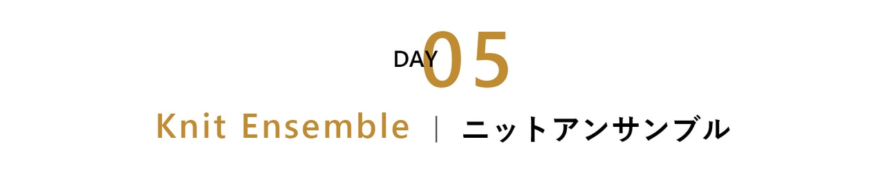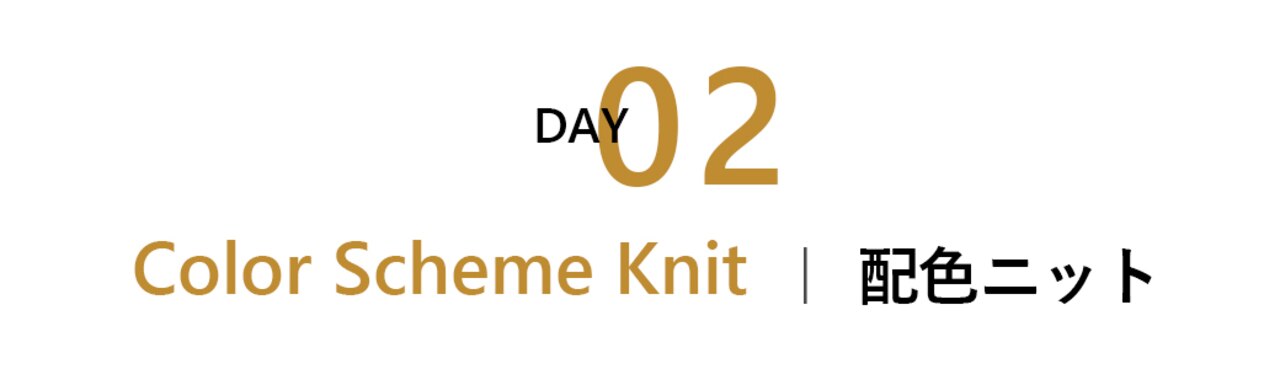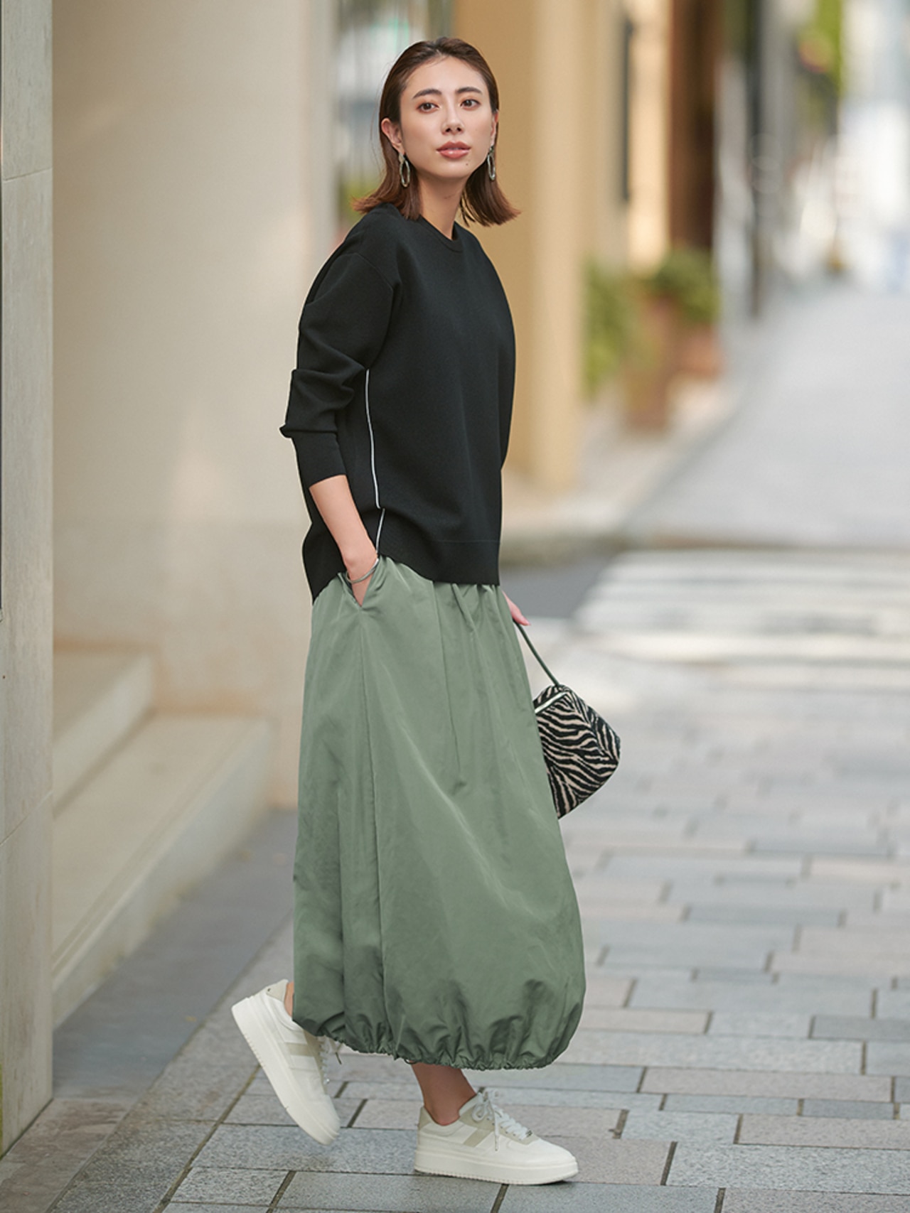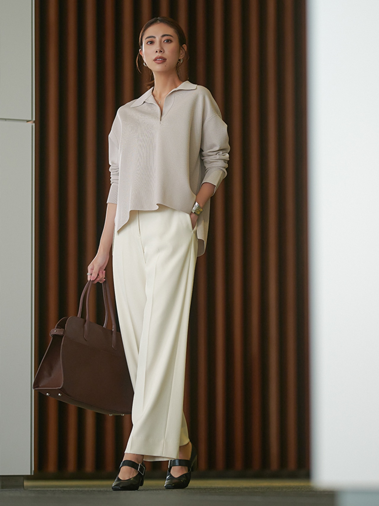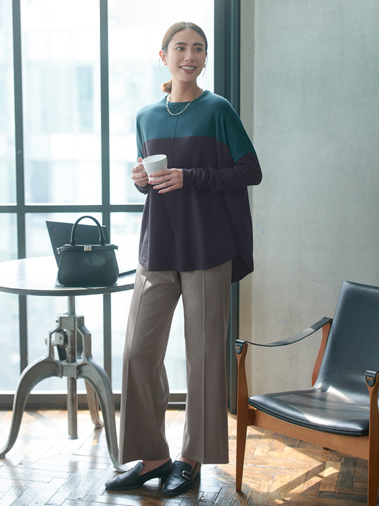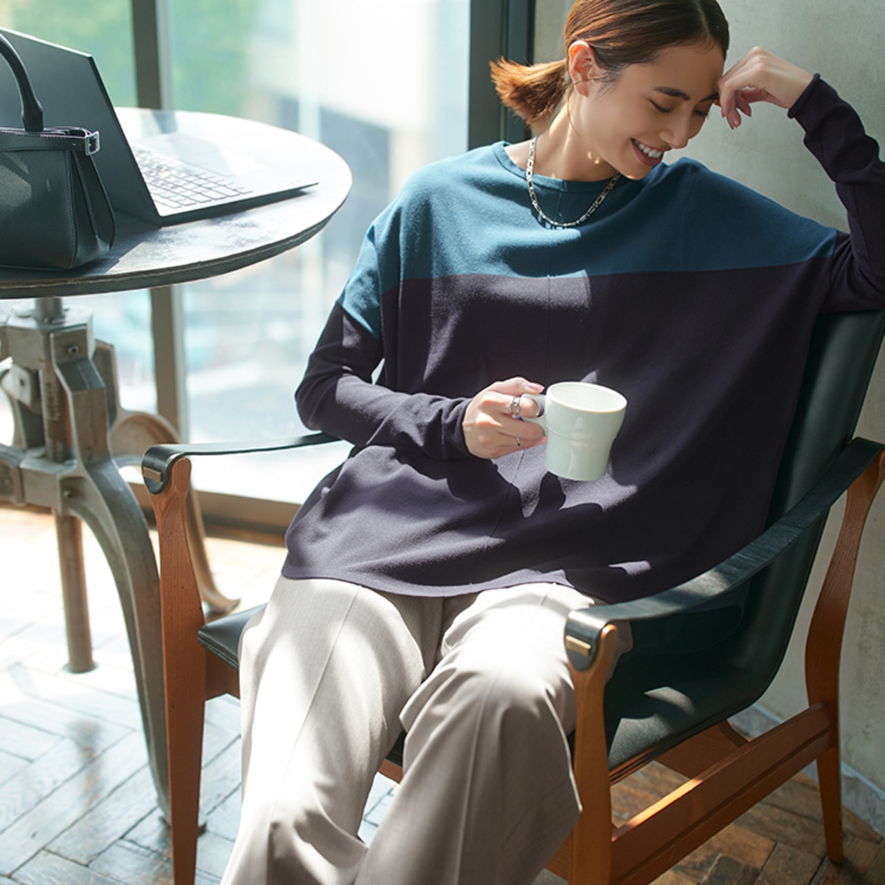 オンラインミーティングの日は配色ニットがベスト。秋色の配色が顔周りを華やげてくれ、ゆったりとした身頃が快適な着心地も両立。ボトムはパンツ合わせで肩肘張らない大人のスタイリング。