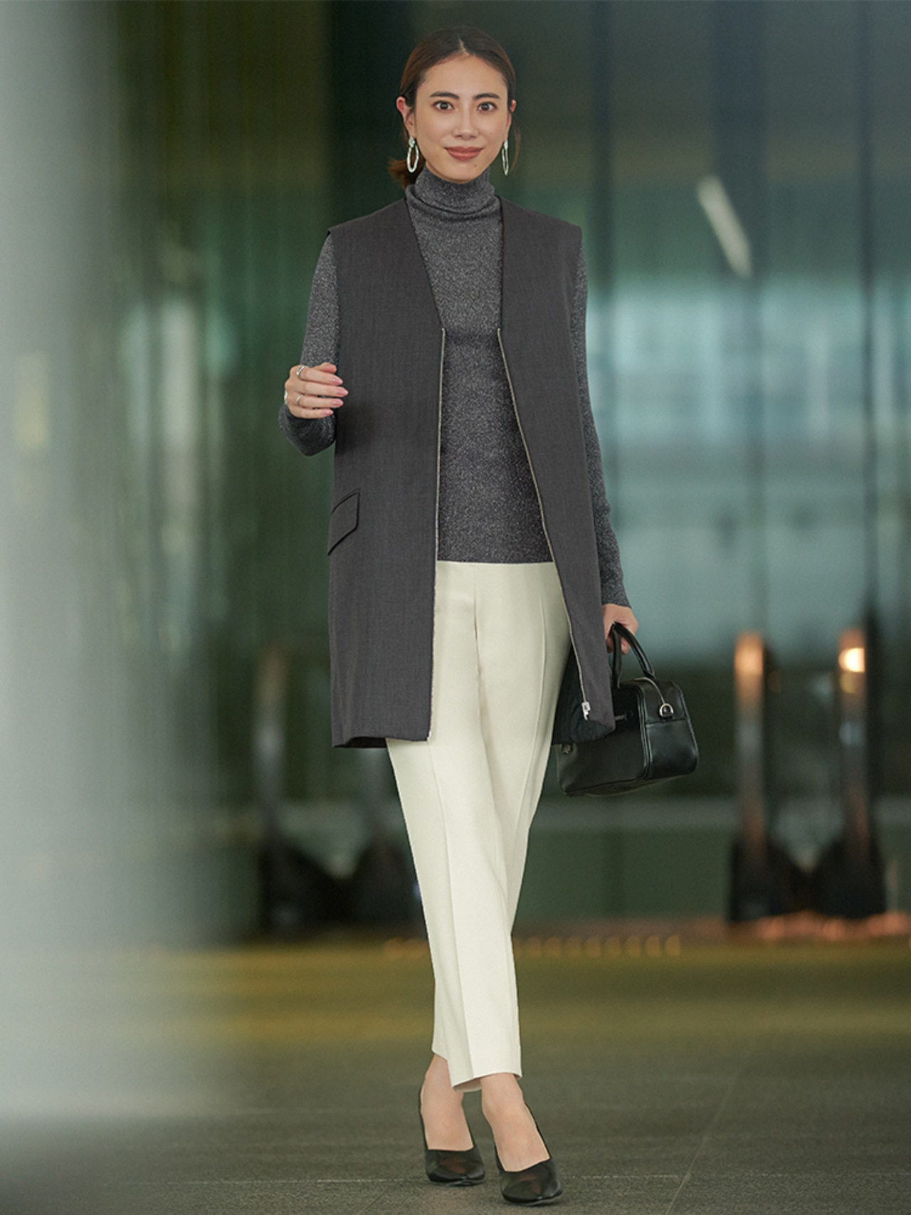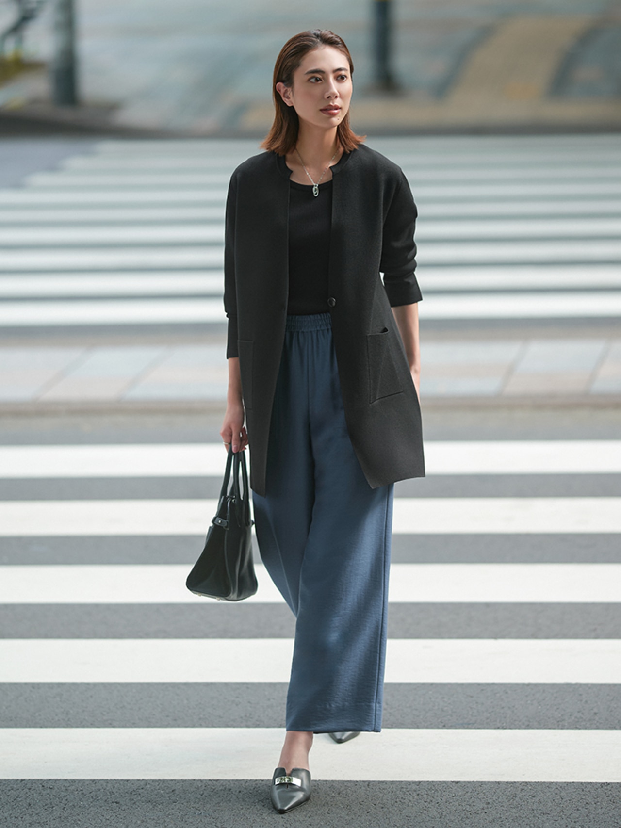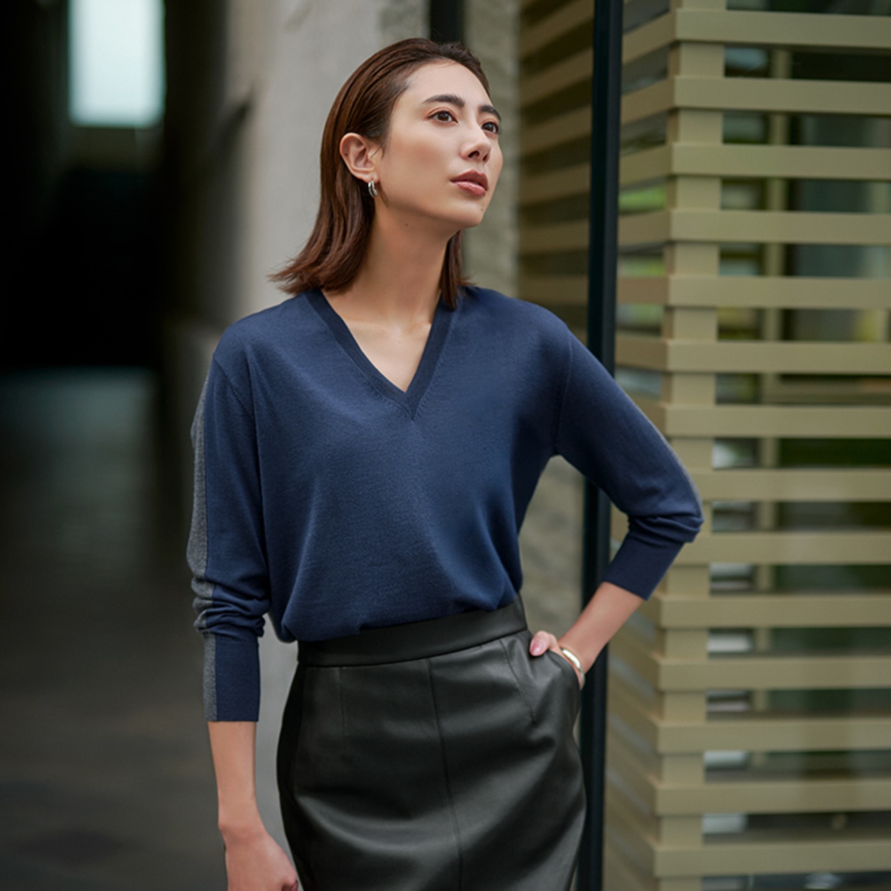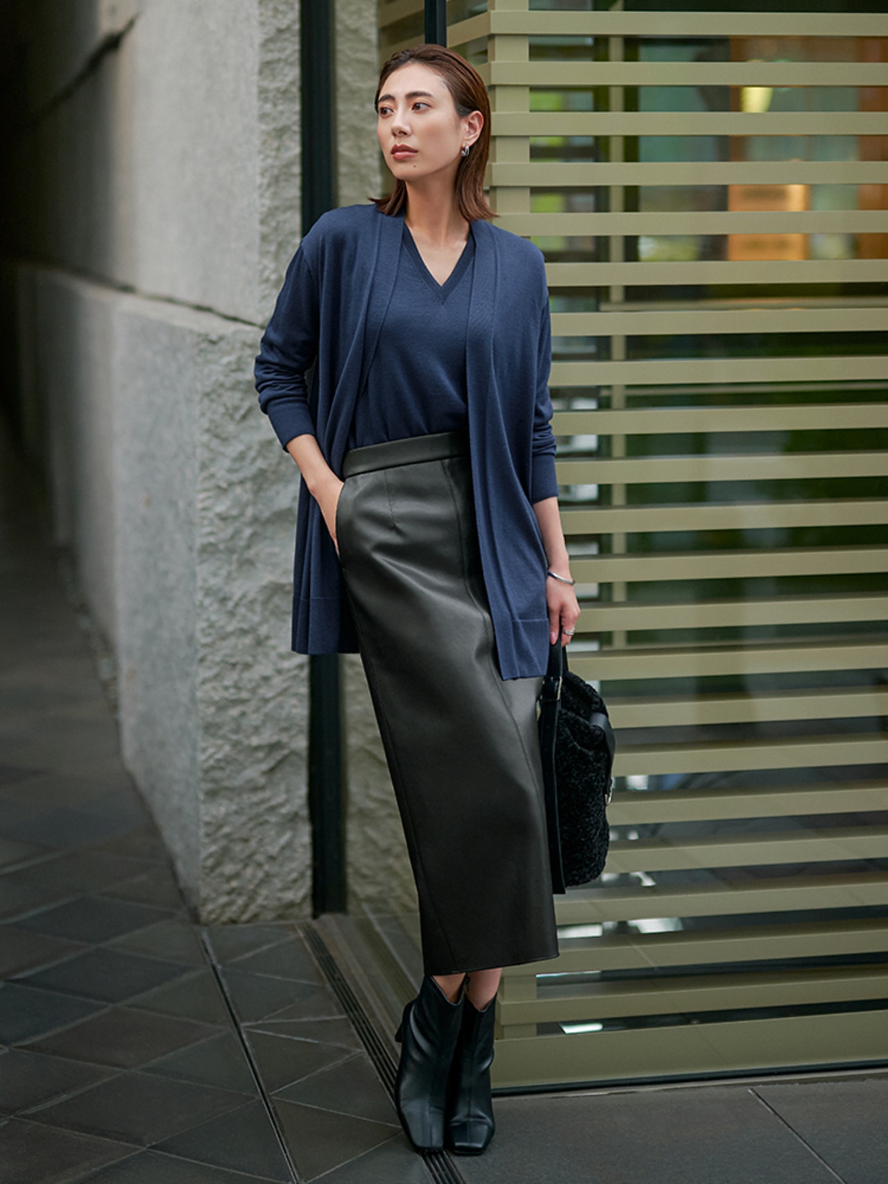 前後配色のVネックニットに同素材のカーディガンを合わせたアンサンブル風の着こなし。仕事終わりのお洒落なディナーにも対応する、上品コーデに欠かせないアイテム。