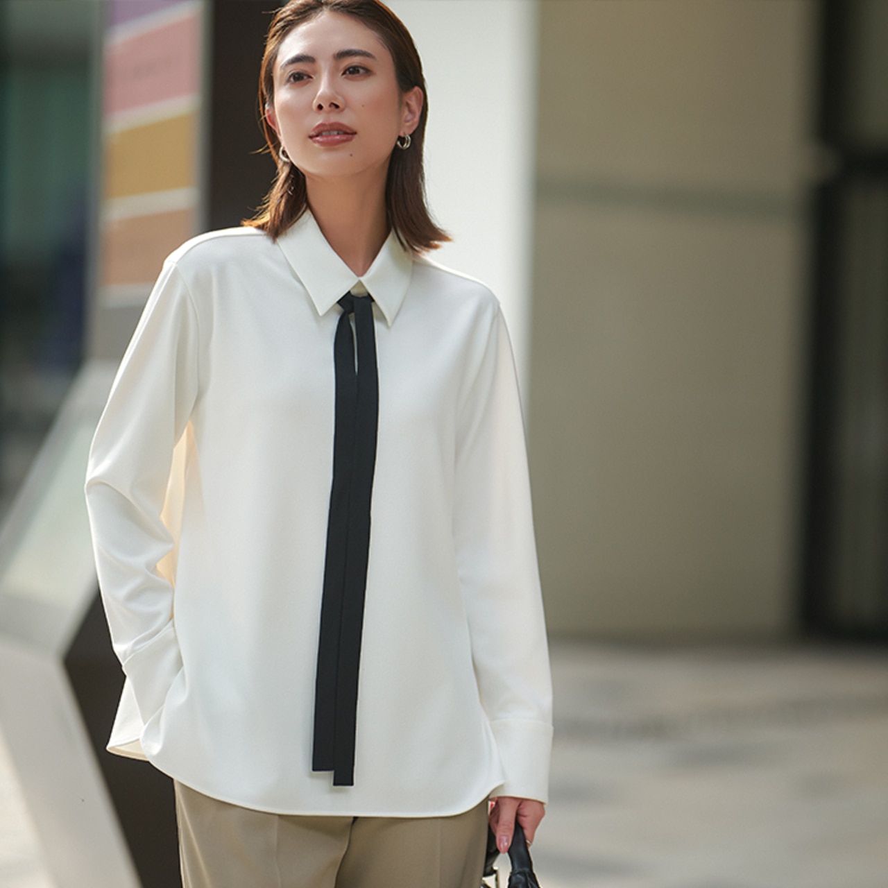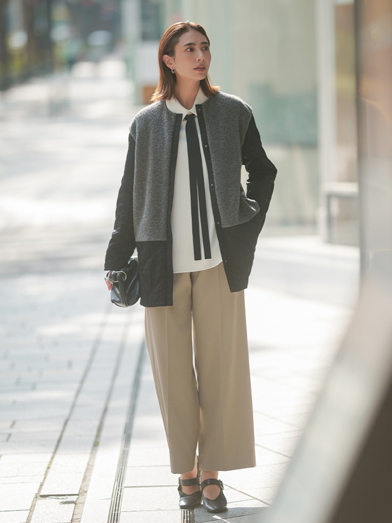 きちんとしたい休日のお出かけにはシャツカラートップスをチョイス。今年らしい細ボウタイ付きデザインで、華やかさもプラスしてくれます。寒くなってきたらリバーシブルで楽しめるキルトコートを羽織って。