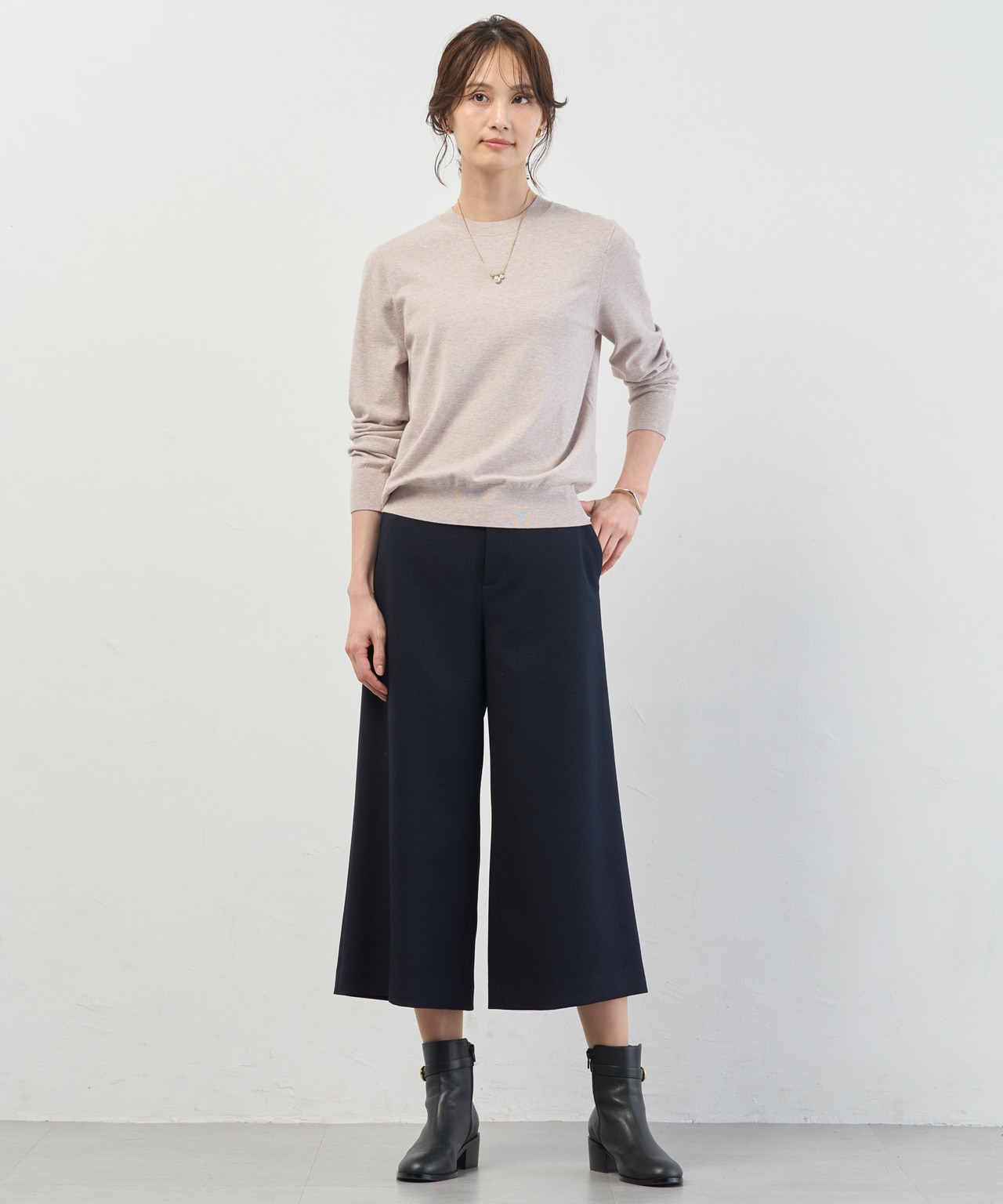 ネイビーのクロップドパンツにベージュのニットを合わせて、柔らかいニュアンスをプラス。