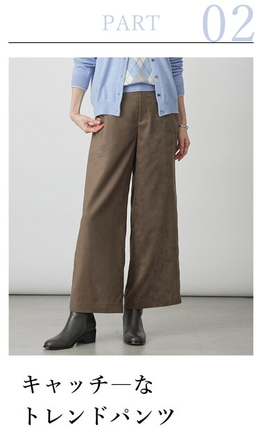 今旬のスエードパンツには華やかなブルーのアーガイルニットが好相性。