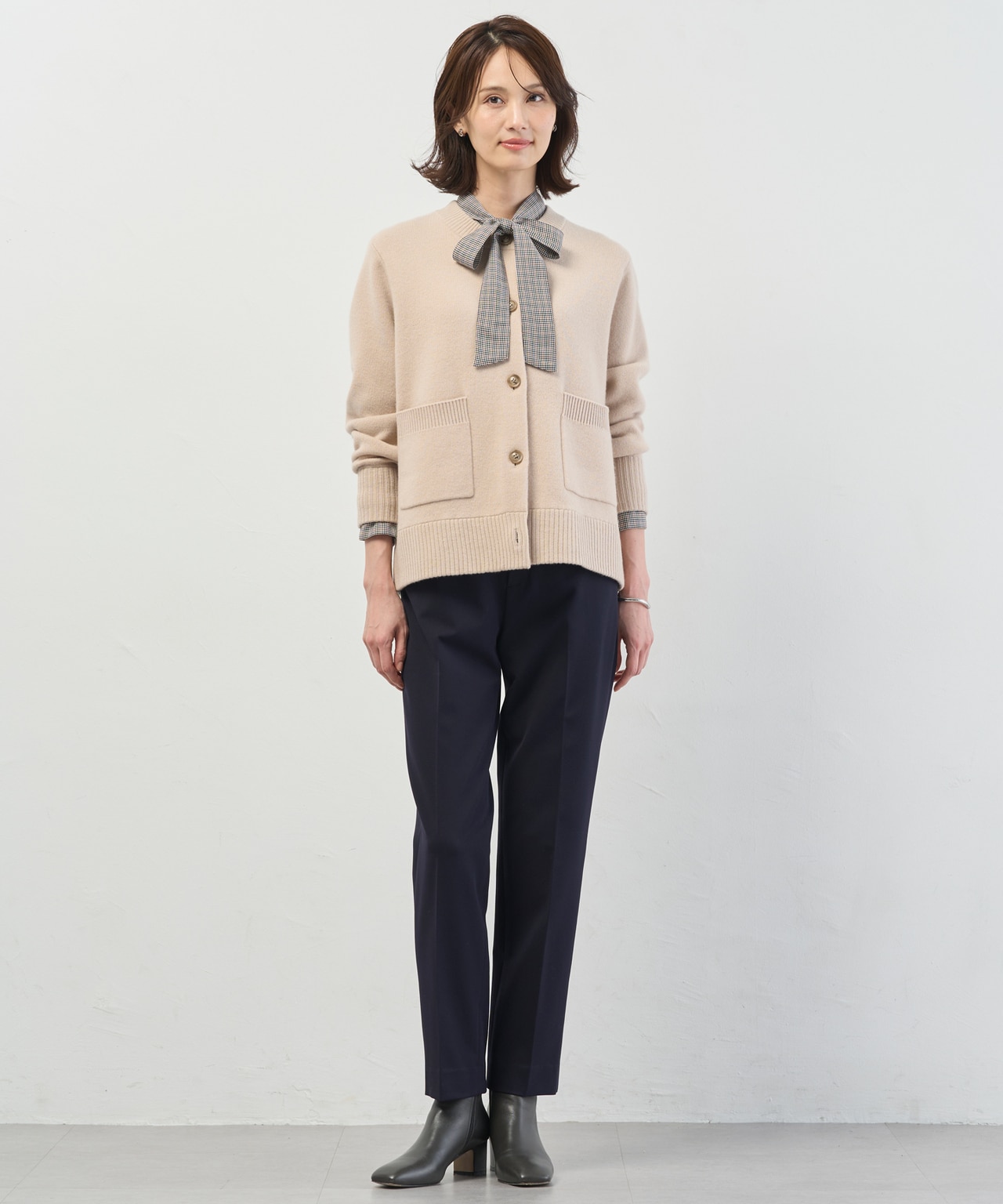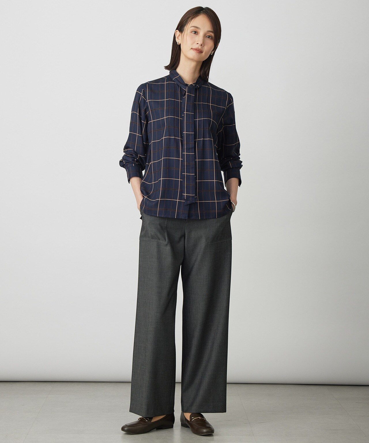 シンプルなテーパードパンツを、チェック柄のボウタイブラウスで華やかにクラスアップ。