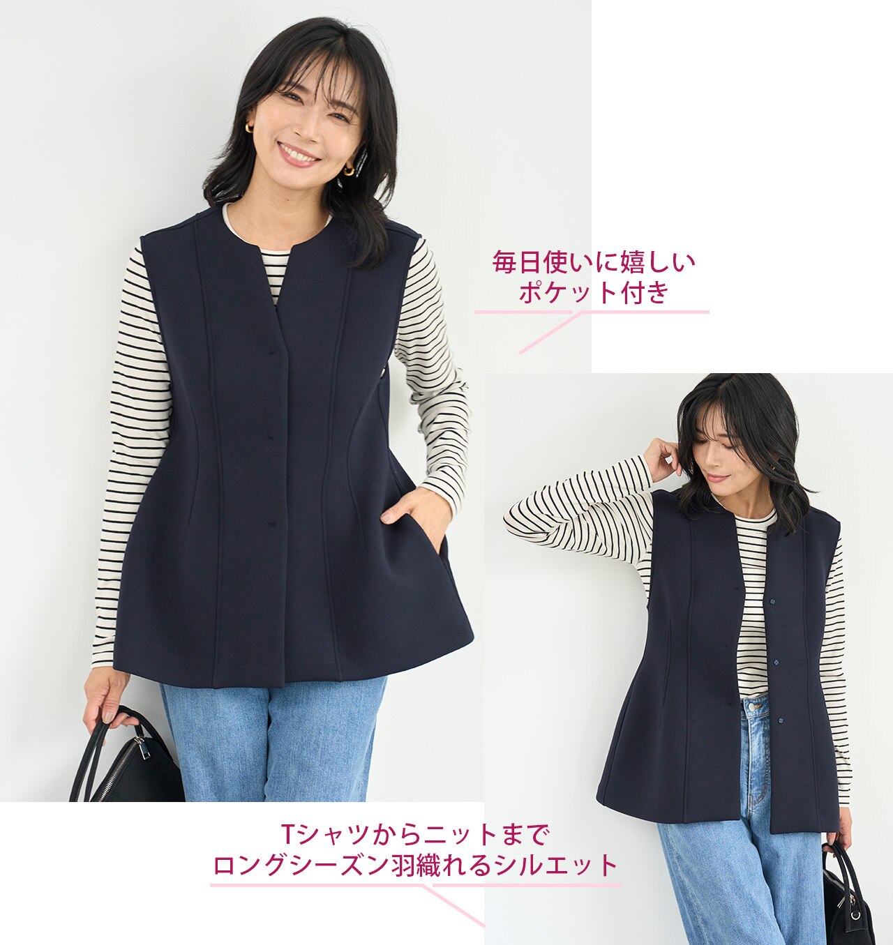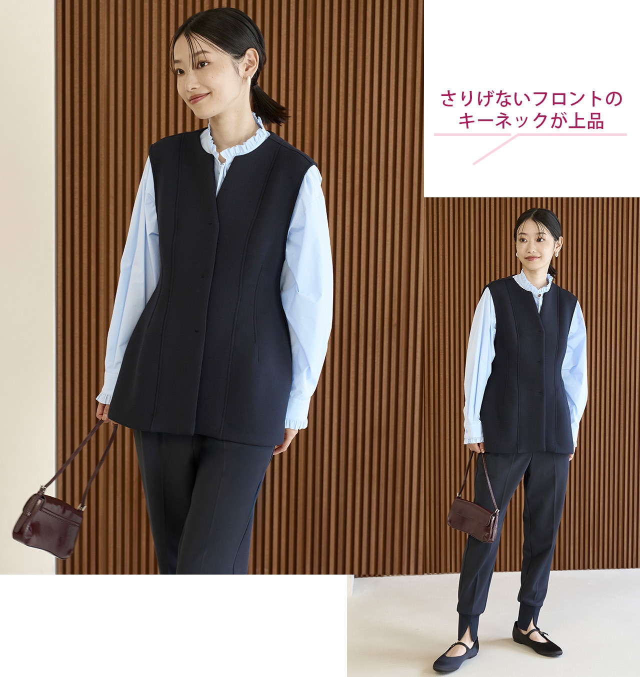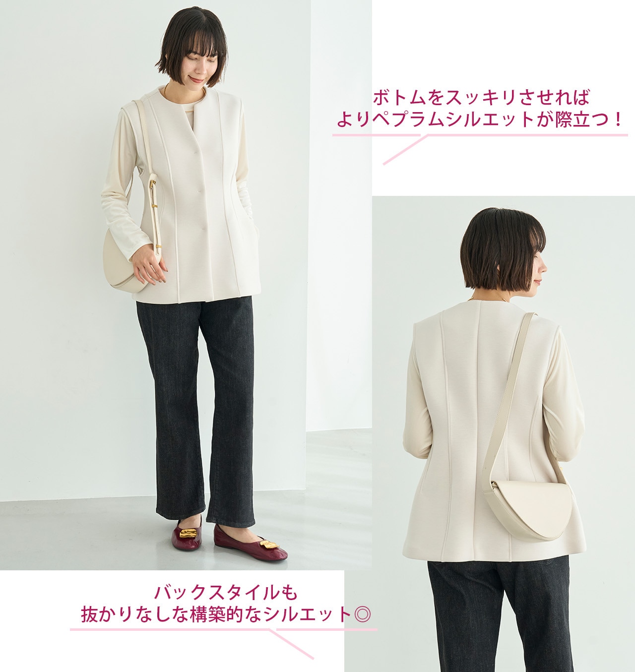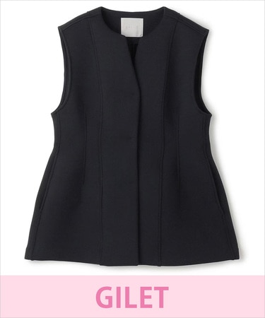 前を閉じてベスト風&前を開けたままサッと羽織ってもサマになるのがジレの万能ポイント◎