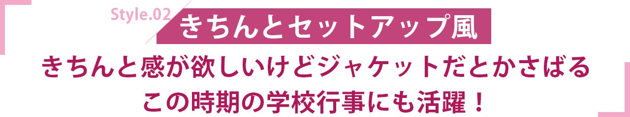 同色のパンツ&ブラウスとセットアップ風にまとめればラクにスーツスタイルの完成です。授業参観や七五三でもイージーケアアイテムが嬉しい!
