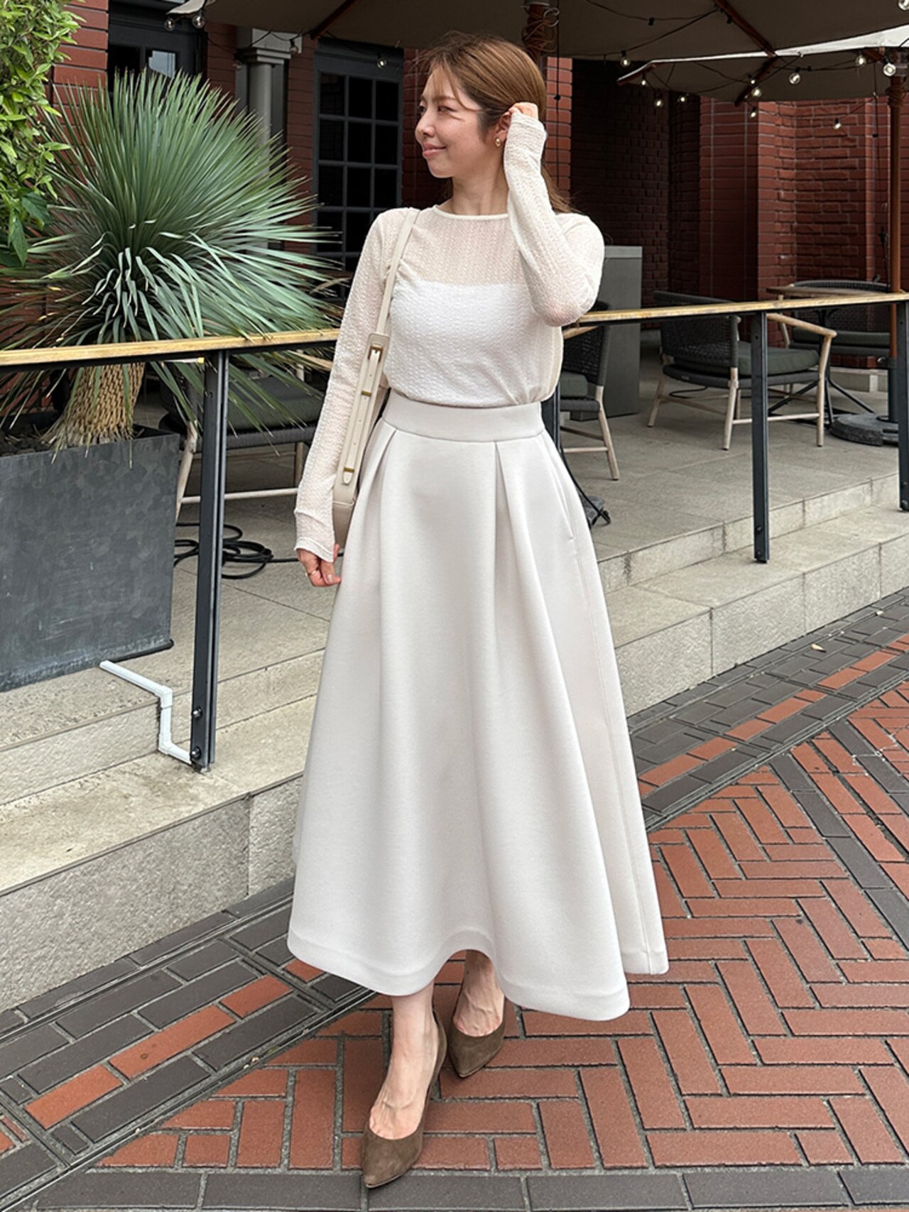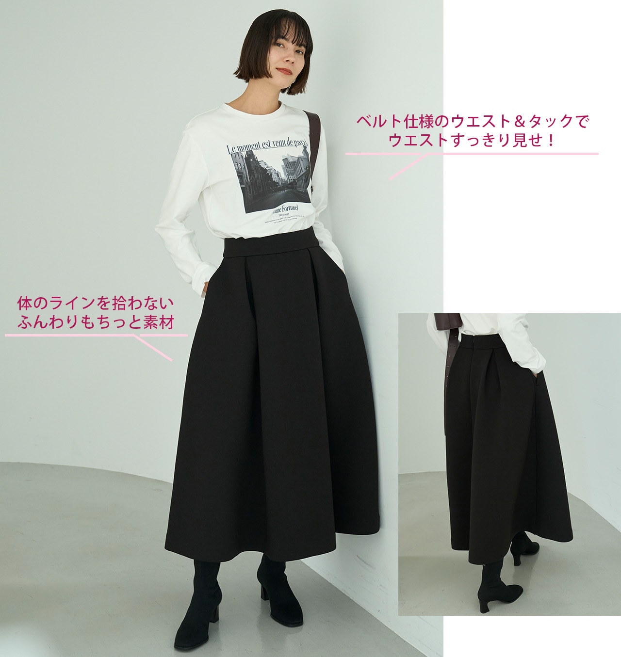 甘めなイメージのフレアスカートも、モノクロのロゴTシャツと合わせればグッとシックな印象に。上品な大人の女性を演出します。