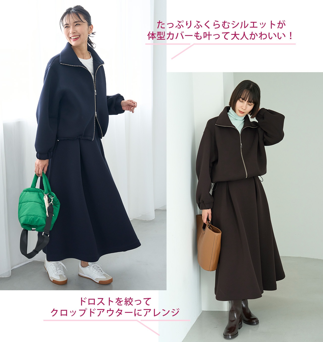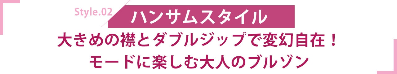スニーカー合わせの時はフォルム感を活かしてダブルジップで抜け感を。ブーツ合わせの時はドロストを絞って視線を上げてスッキリ見せて。