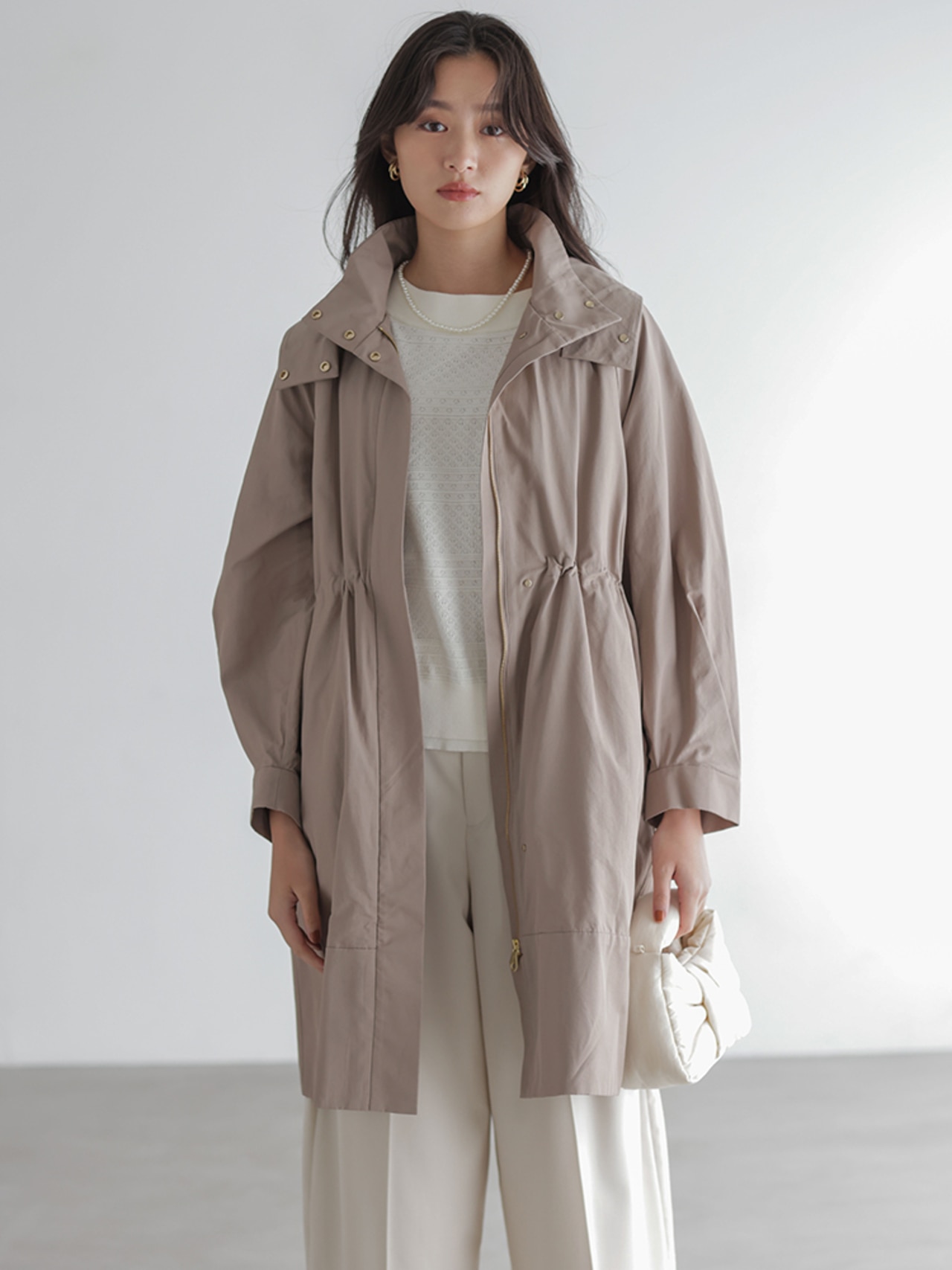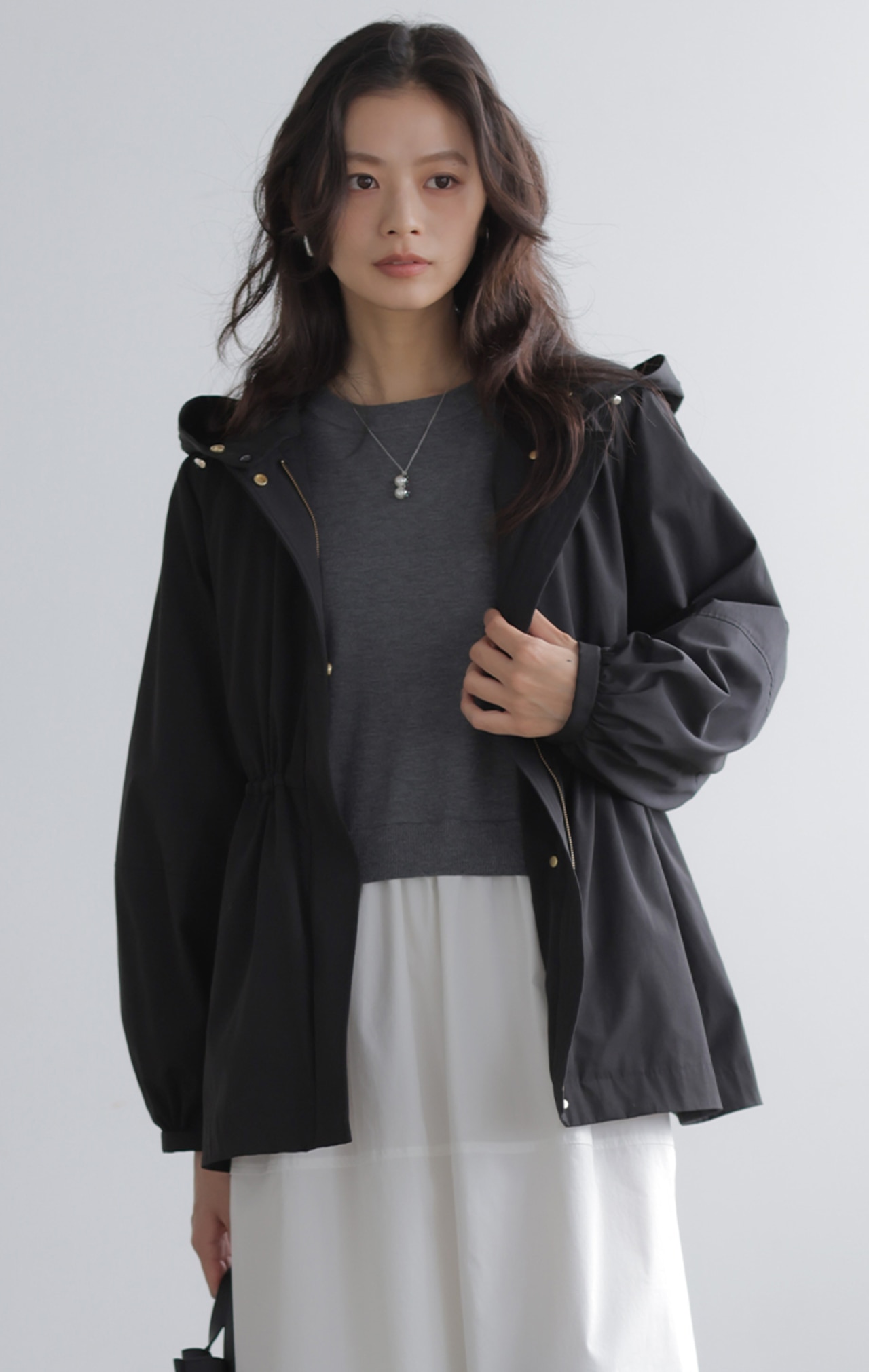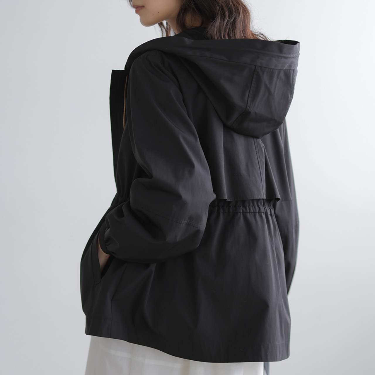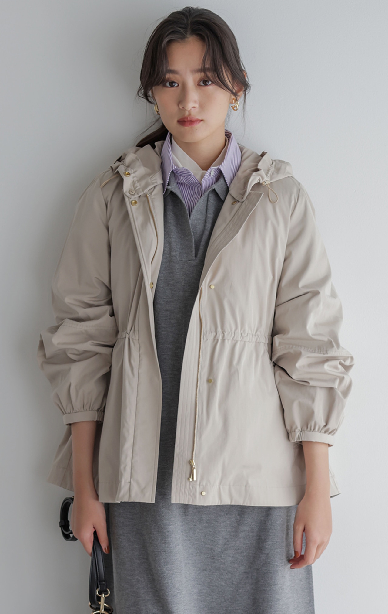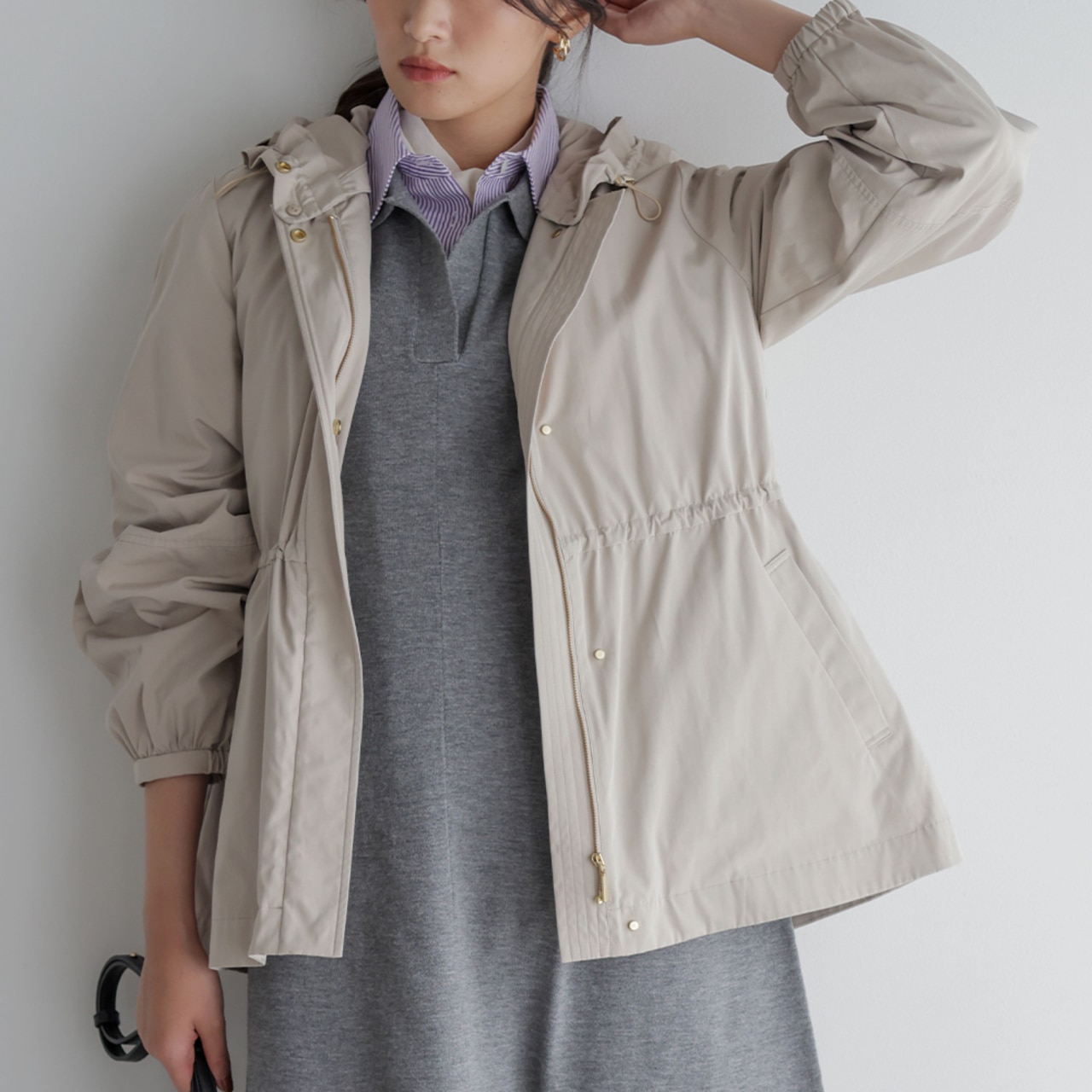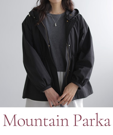 2WAY仕様のマウンテンパーカーは、フードを外してノーカラーとしても。袖のパフっとしたランタンスリーブでフェミニン要素をプラス。撥水加工付きなので、急な雨でも安心です。