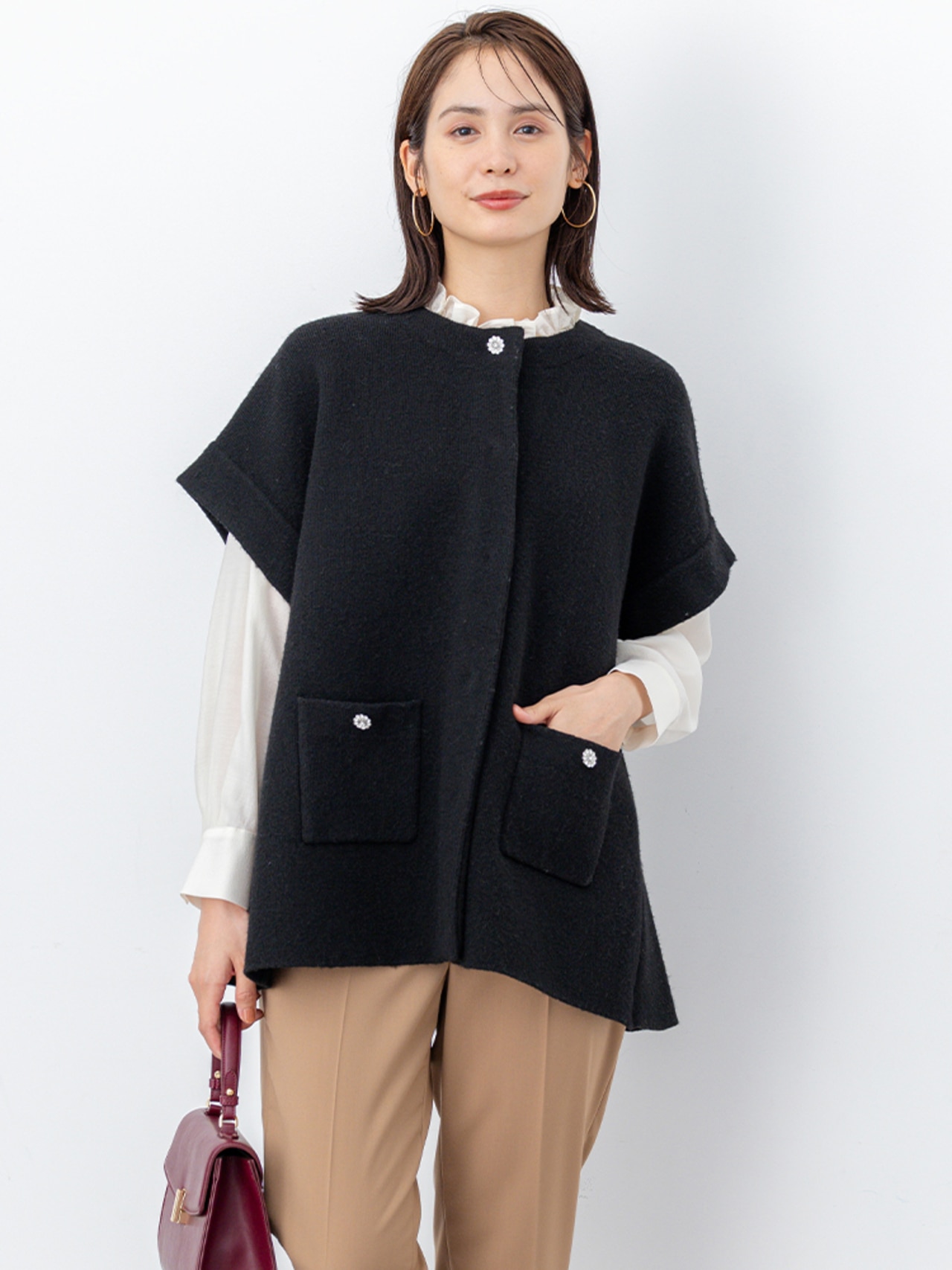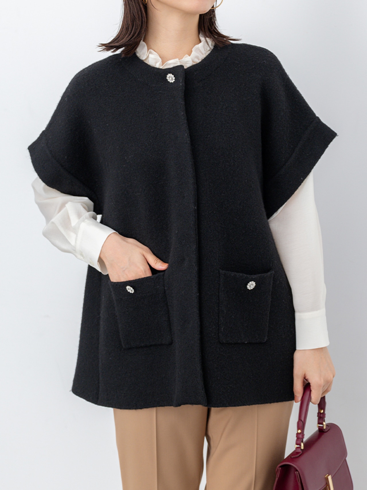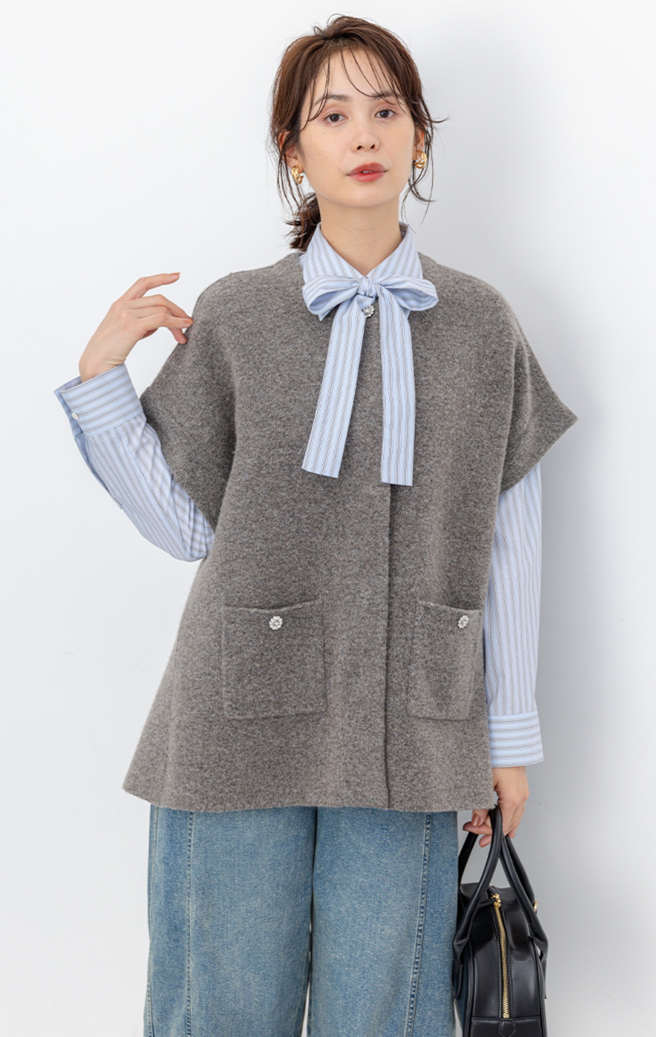 さらっと着られるオーバーサイズのトレンドライクなジレ。Aラインシルエットやビジュー釦で大人フェミニン派にも取り入れやすいデザイン。インナー次第でロングシーズン着用いただけるアイテムです。