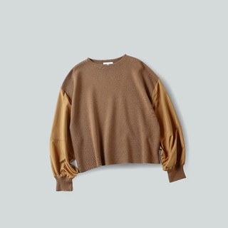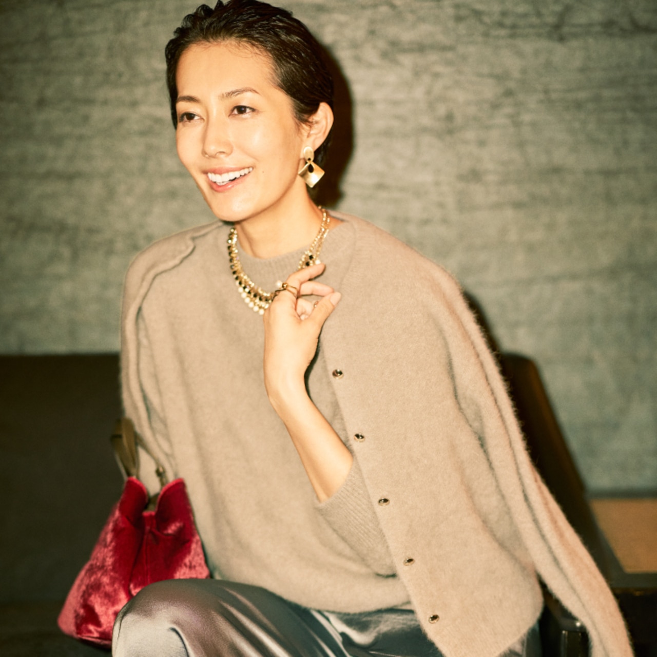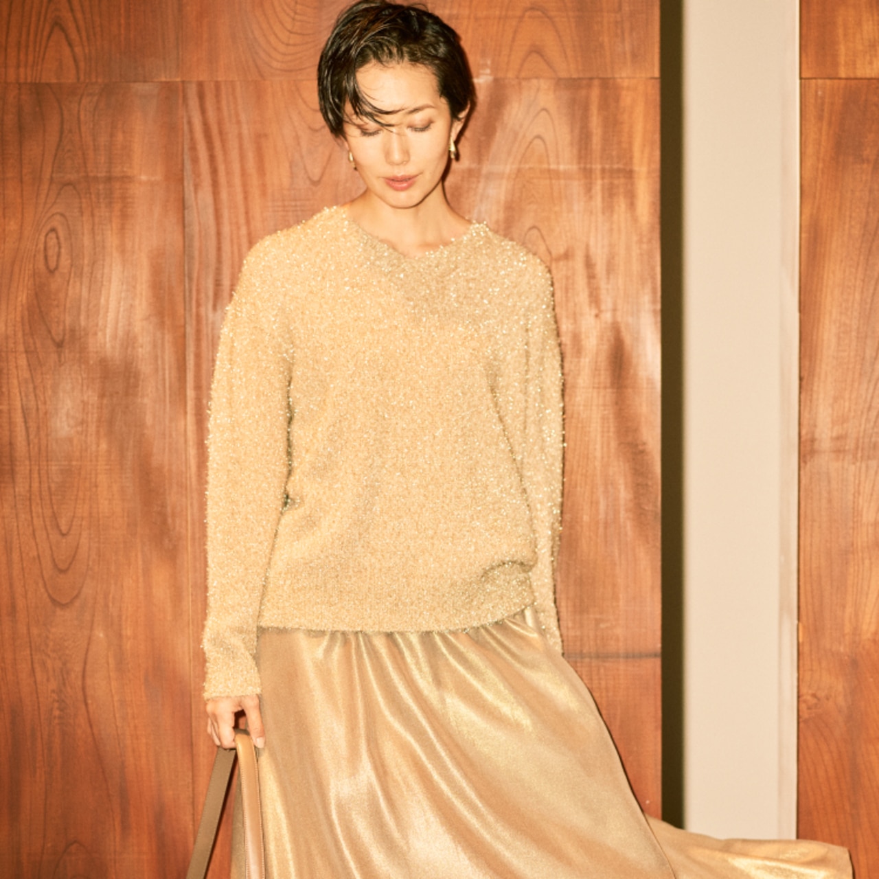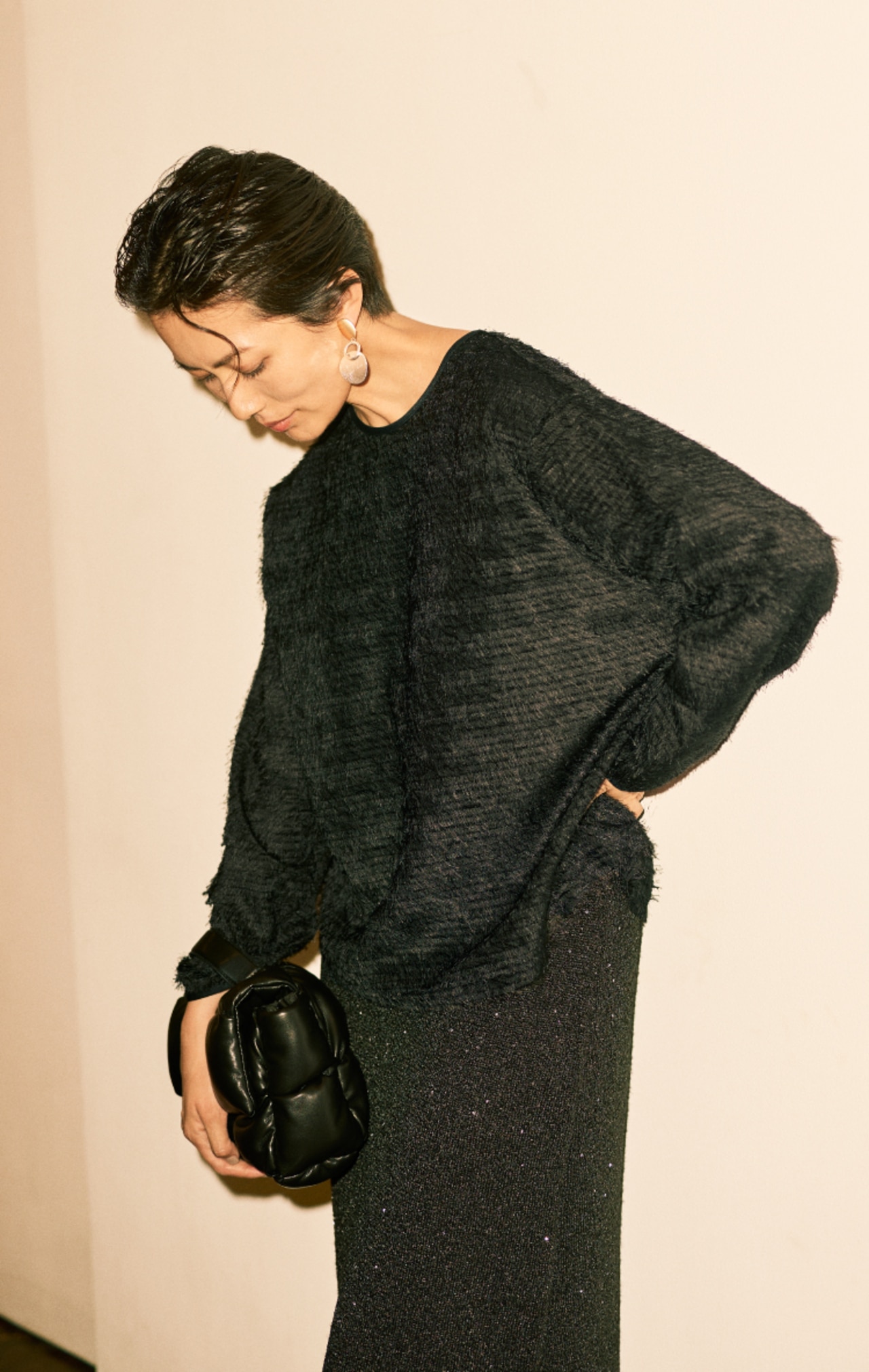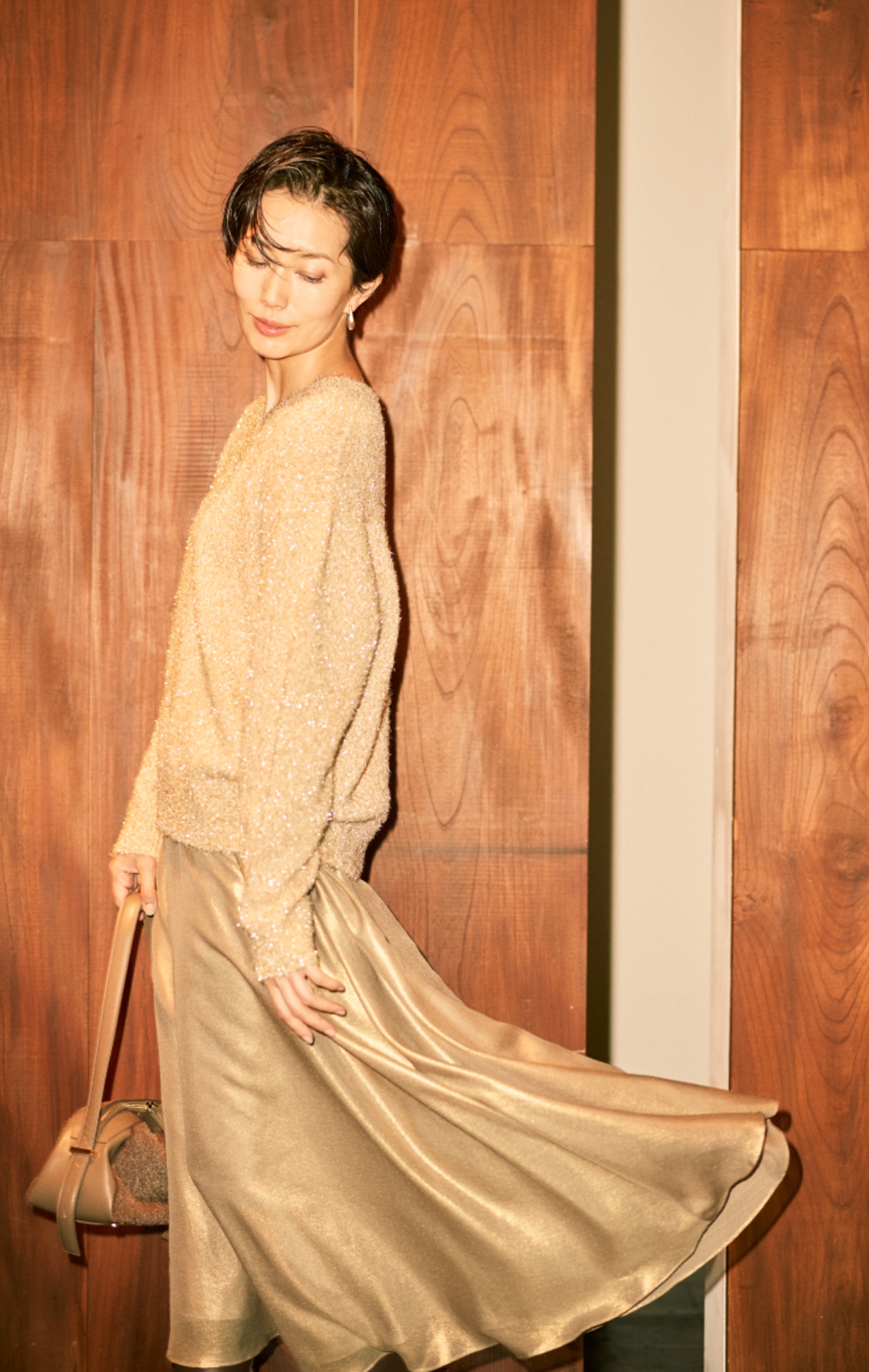 トレンドのジャカード素材を取り入れた技ありのブラウス。素材を際立たせるようにデザインは極力シンプルに。袖ぐりを低く設定したことで、袖を通すとドルマンスリーブのような絶妙な抜け感が生まれます。スパンコールが効いた煌びやかなスカートと合わせた異素材コーデで旬なスタイリングを。