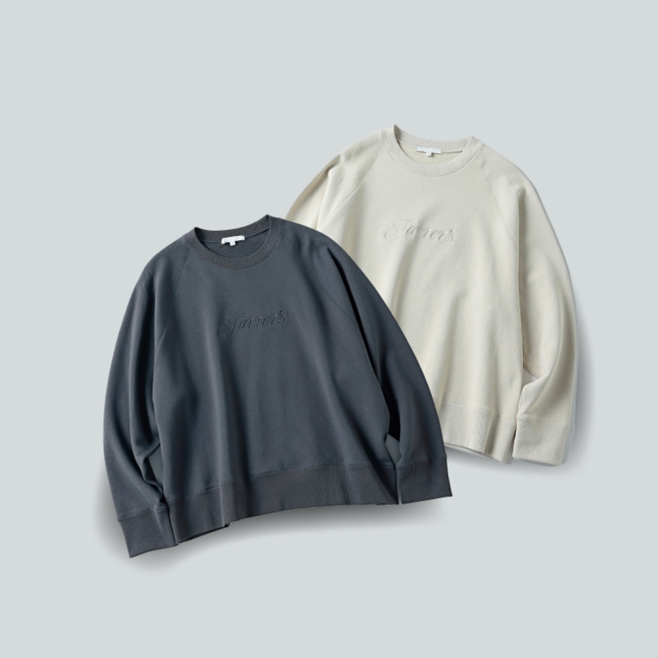 Farrer’sのロゴがポイントのスウェット。同色の糸で刺繡を施すことで、さりげない見え方にこだわりました。毛羽立ちにくく、光沢のある素材、ニュアンスカラーもきれい見えのカギ。