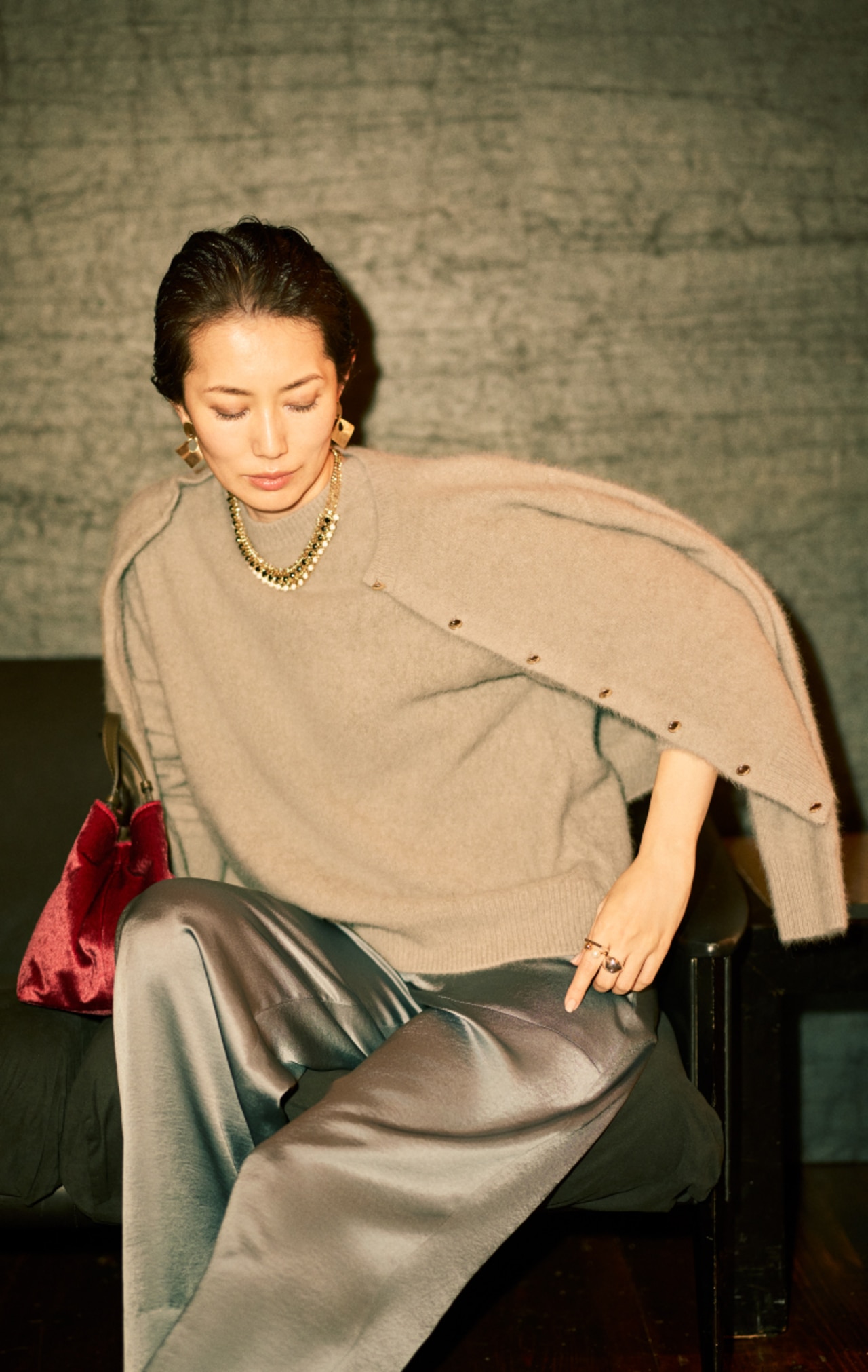 独特の艶っぽさが魅力のサテンパンツは、はいたときが美しさのピークになるように、厚みや伸縮性、なめらかな落ち感をもつ素材を丁寧に吟味。さらにヴィンテージ加工を施すことで、上品な光沢感をかなえました。真逆のふんわりマットなニットを合わせると、艶っぽさが一層際立ちます。