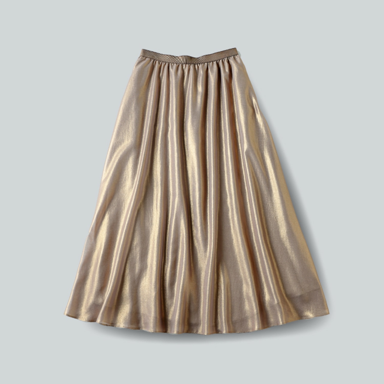 女らしさを盛り上げるスカートは、シアーボイルに繊細にキラキラと輝く箔プリントを施したトレンドのシャイニー素材。ギャザー入りのフレアデザインは、動くたびに裾が優美になびきます。同じラメが艶めくニットを合わせれば、華やかさマックスな装いに。