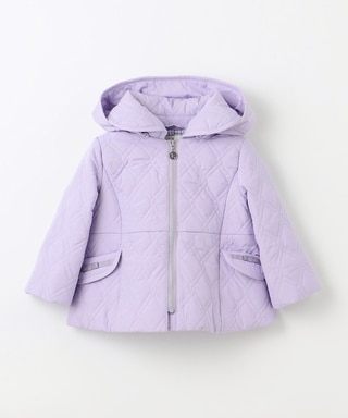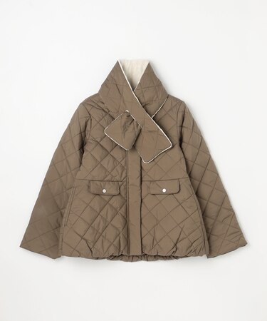 上品なダイヤキルト柄の中綿ジャケット。ウエストで切り替えたフレアシルエットが可愛らしい印象。