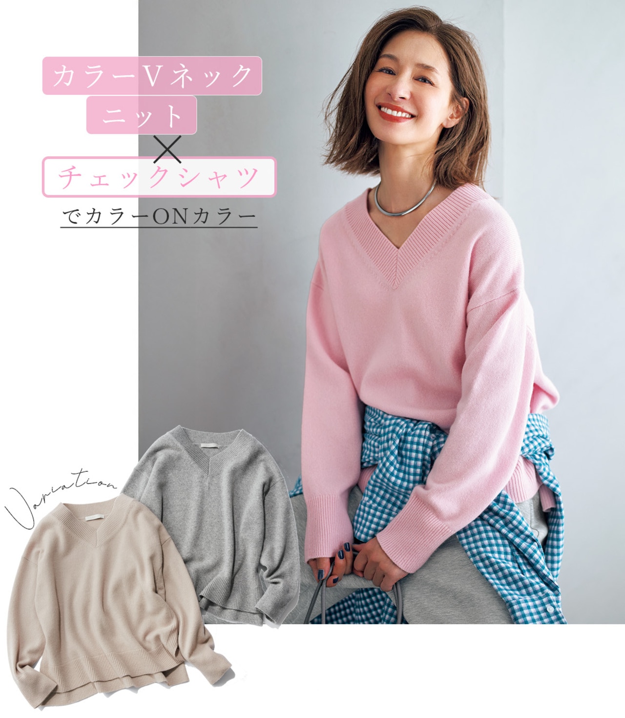 気になるニットの着膨れもV開きで顔周りもスッキリ。鮮やかな発色で1枚でもサマになるし、柄シャツを腰に巻いてイージーパンツと合わせれば、気軽にリズムのあるカジュアルスタイルが完成! ピンクの多幸感で、毎日の着こなしがもっと楽しくなるニットです。