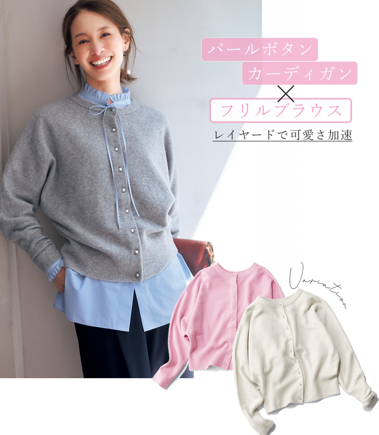 印象が変わる前後2WAYカーデはパールボタンで上品さを纏い、ドルマンスリーブで上半身が華奢見えする女性らしいニット。前後逆にするとプルオーバーとしても着られます。レイヤードすると旬度もUP。