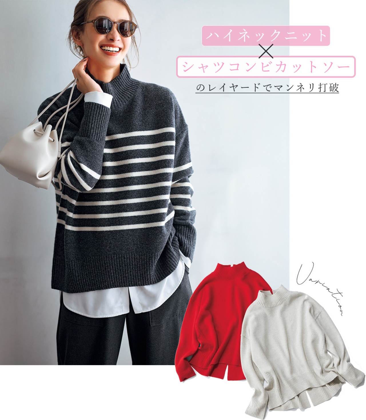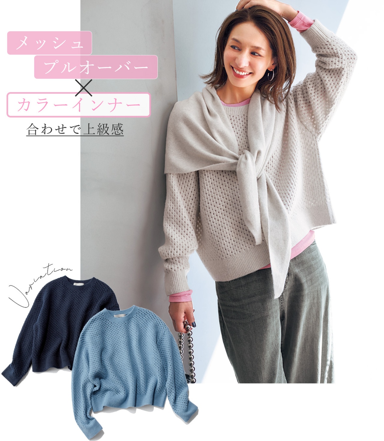 ふわっと感とメッシュの凹凸でもっちりした肌触りのニット。インナーは馴染むカラー合わせでもメッシュの表情でオシャレ見えしますが、あえて映えカラーをしのばせることで脱マンネリが叶い、より上級者のスタイリングに。