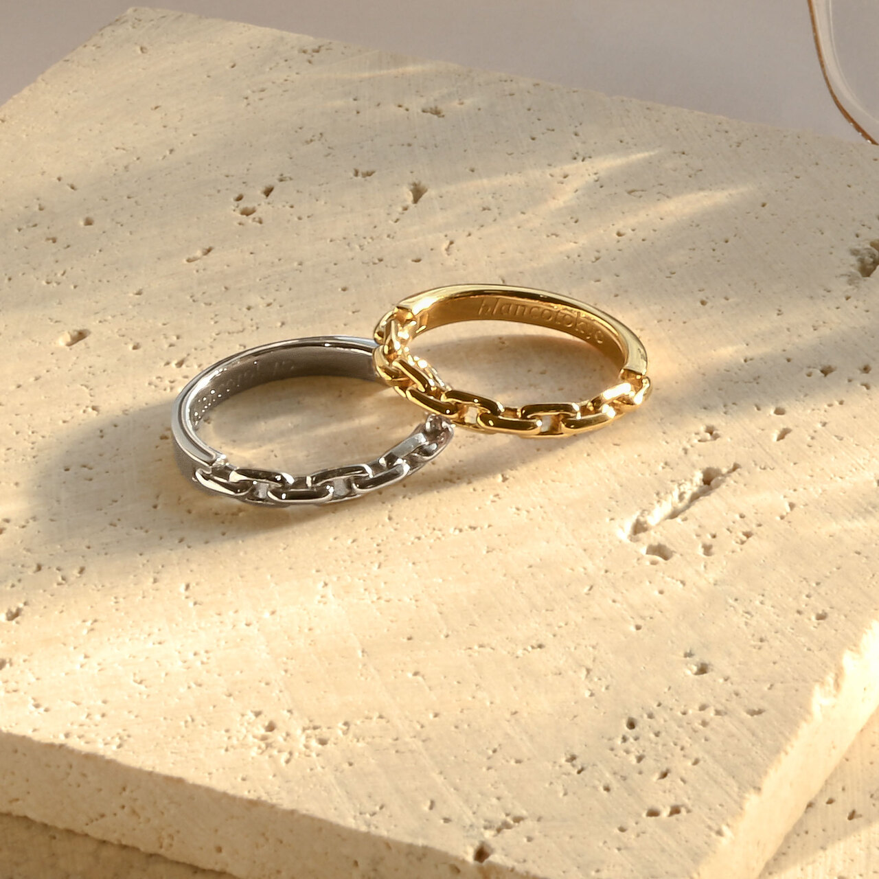 流行りに左右されないデイリーに使えるチェーンモチーフのリング。普段使いにも邪魔にならず、チェーンデザインなのでつけやすく指になじみます。