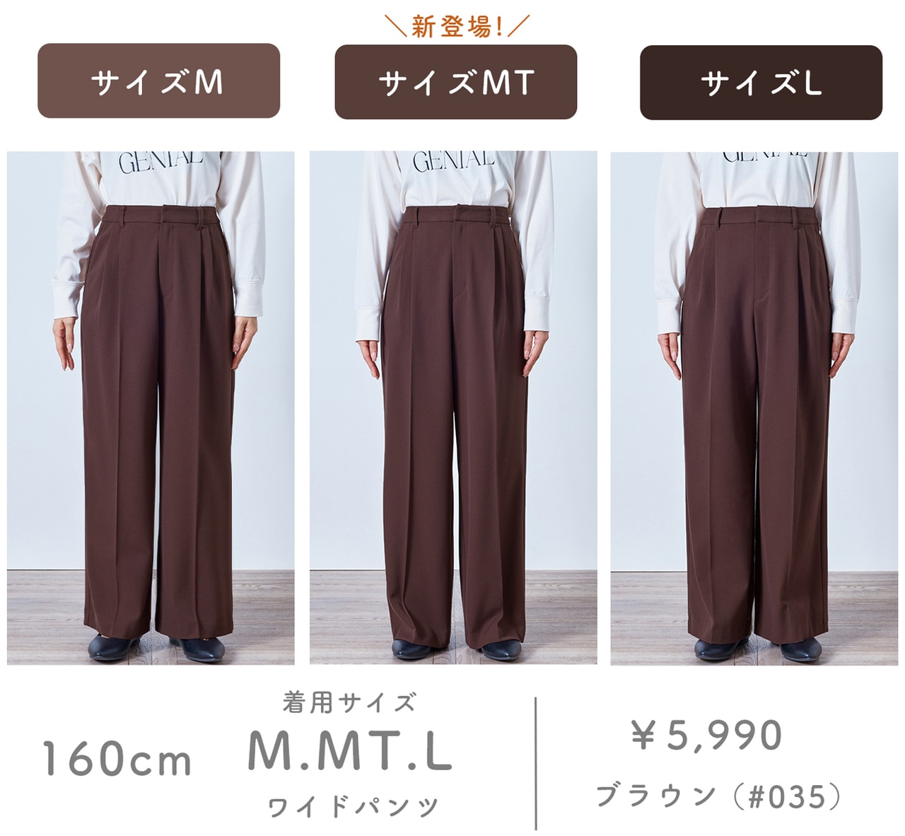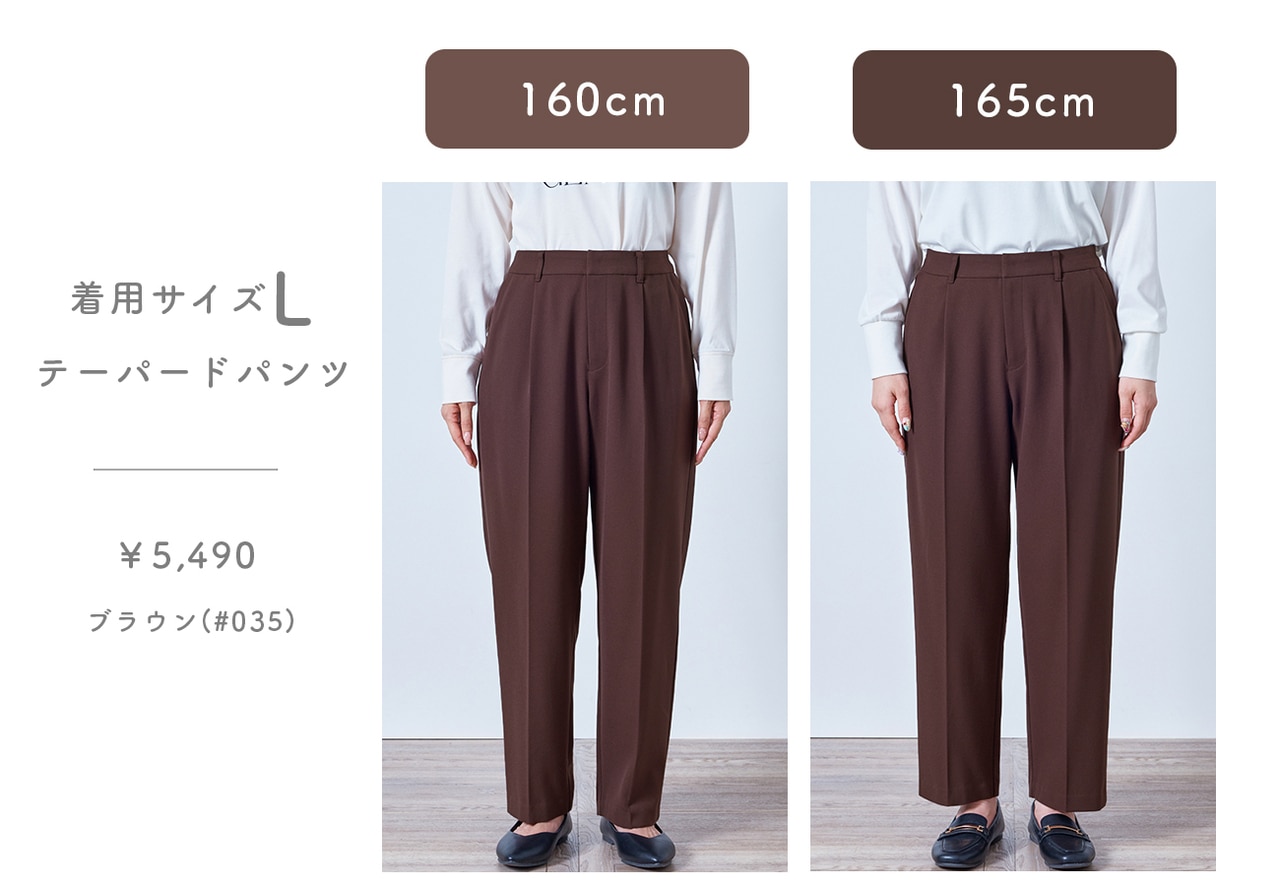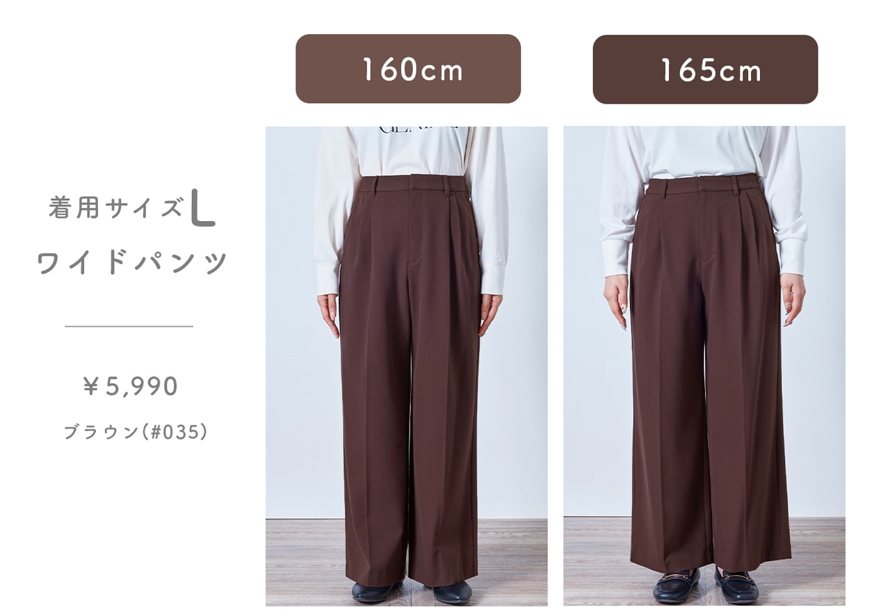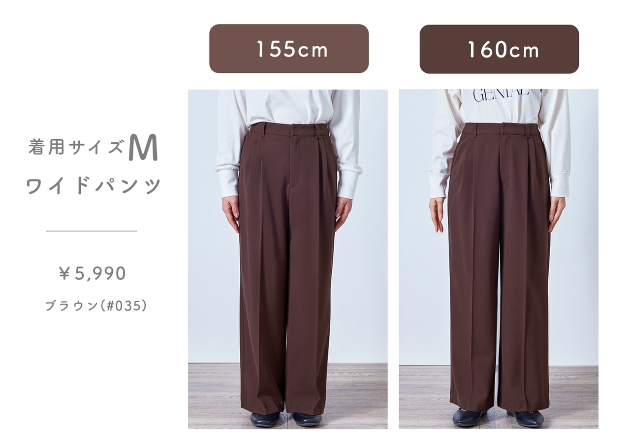 Mサイズよりも丈が長く、裾にワンクッションが入ることで程よいリラックス感を演出。ヒールで合わせればバランスよく大人っぽく、裾を軽く調整すればフラットシューズでもすっきり着こなせます。
