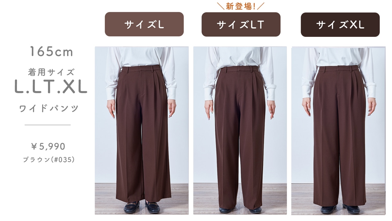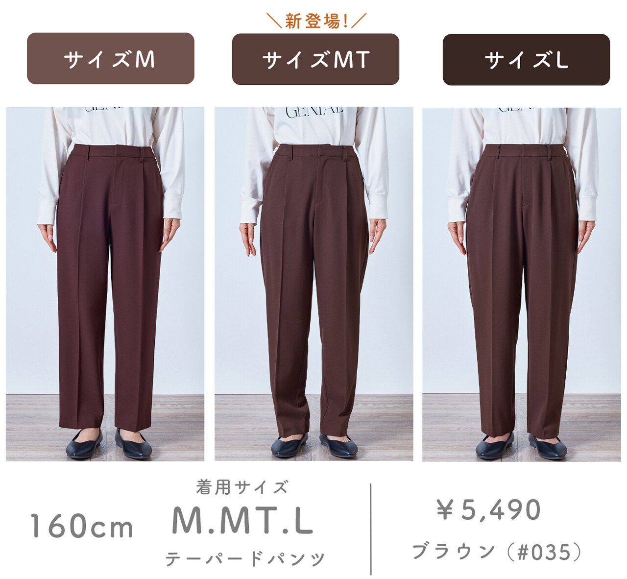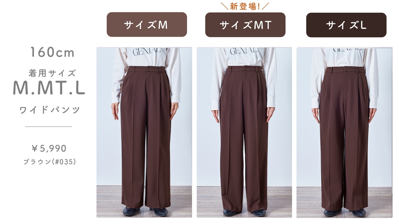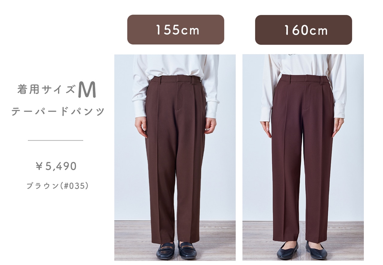 Mサイズよりも丈が長く、裾にワンクッションが入ることで程よいリラックス感を演出。ヒールで合わせればバランスよく大人っぽく、裾を軽く調整すればフラットシューズでもすっきり着こなせます。