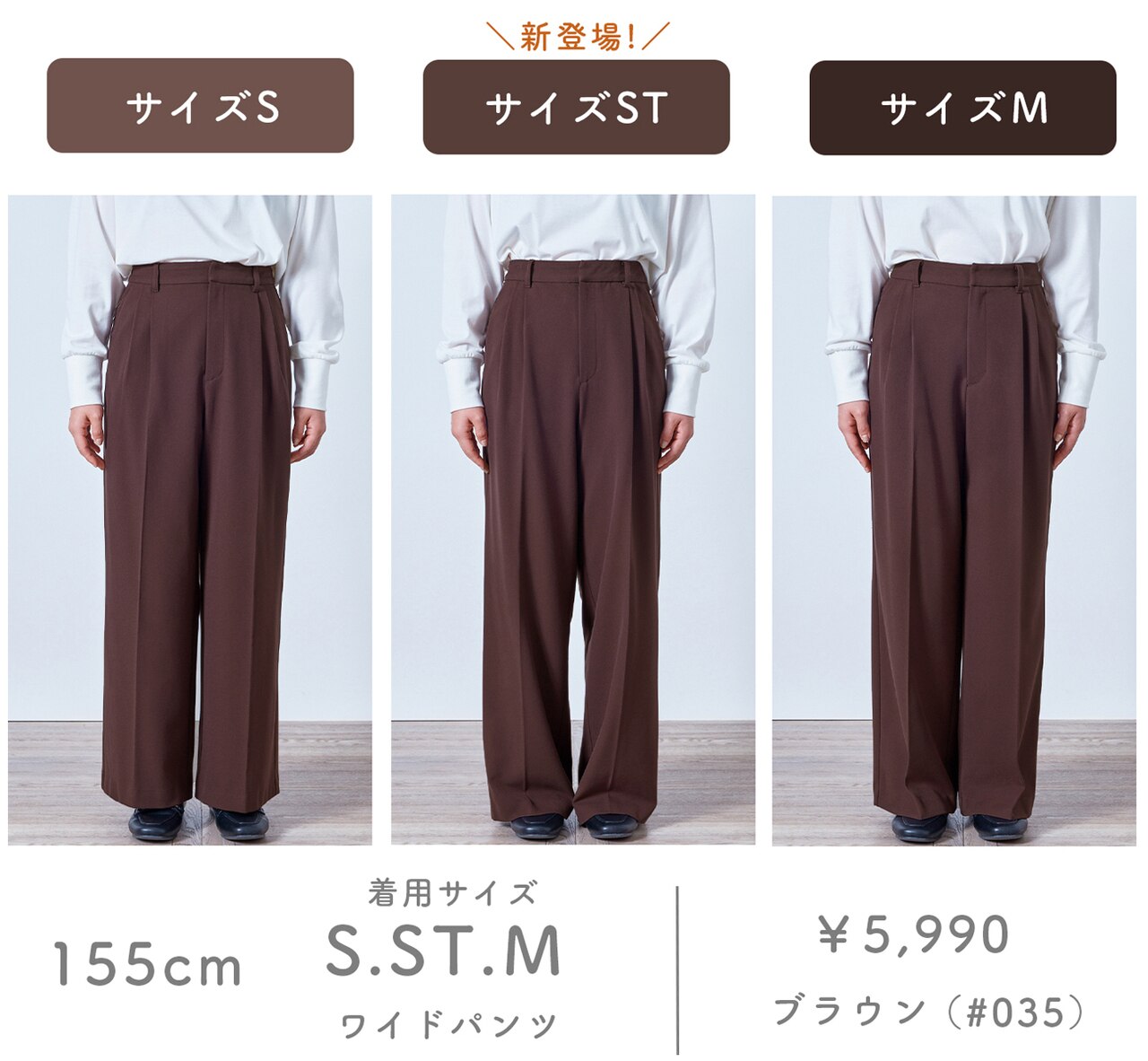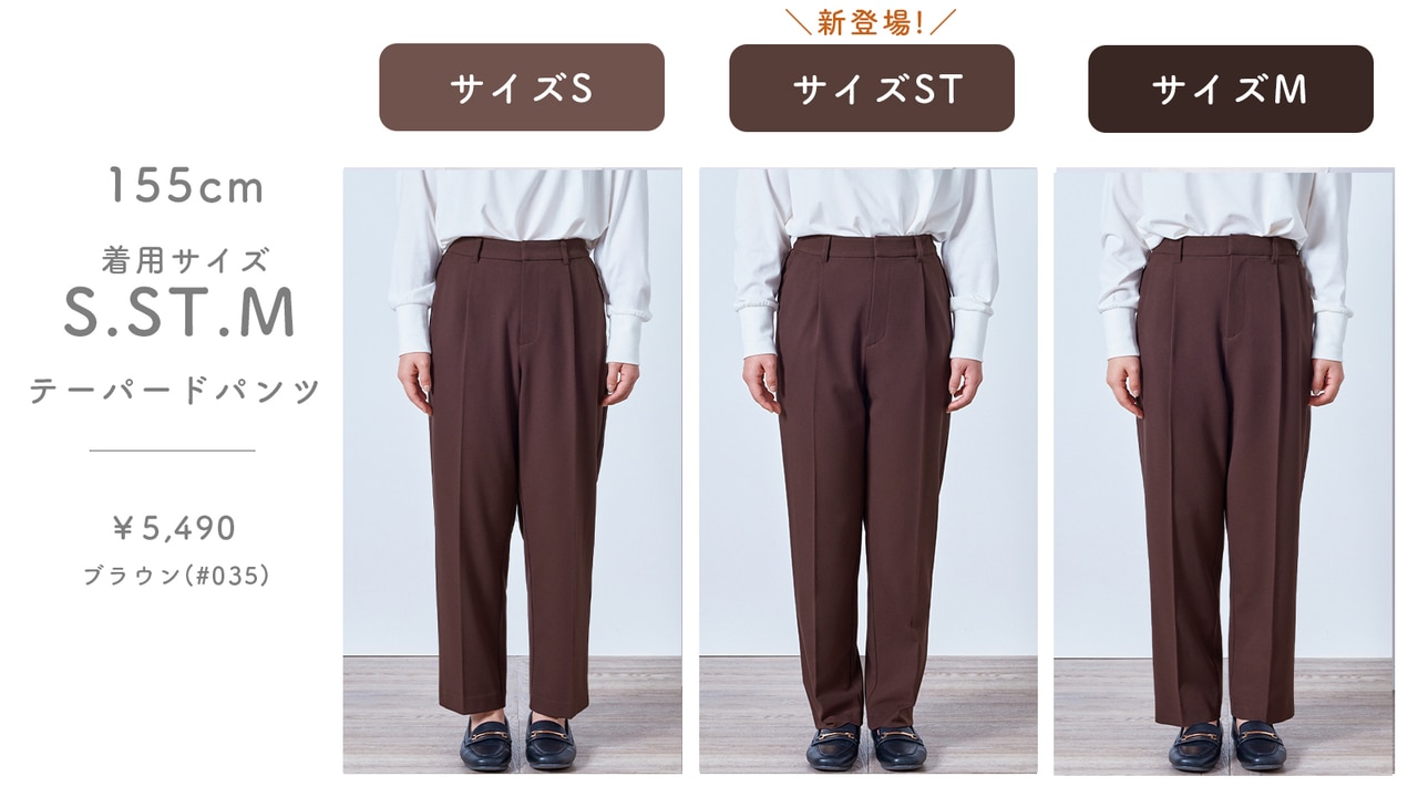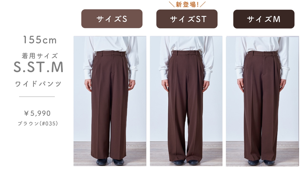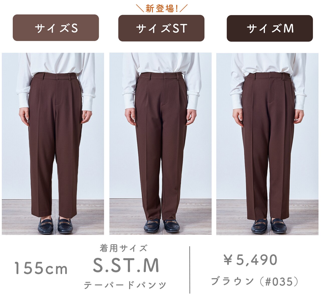 Mサイズよりも丈が長く、裾にワンクッションが入ることで程よいリラックス感を演出。ヒールで合わせればバランスよく大人っぽく、裾を軽く調整すればフラットシューズでもすっきり着こなせます。