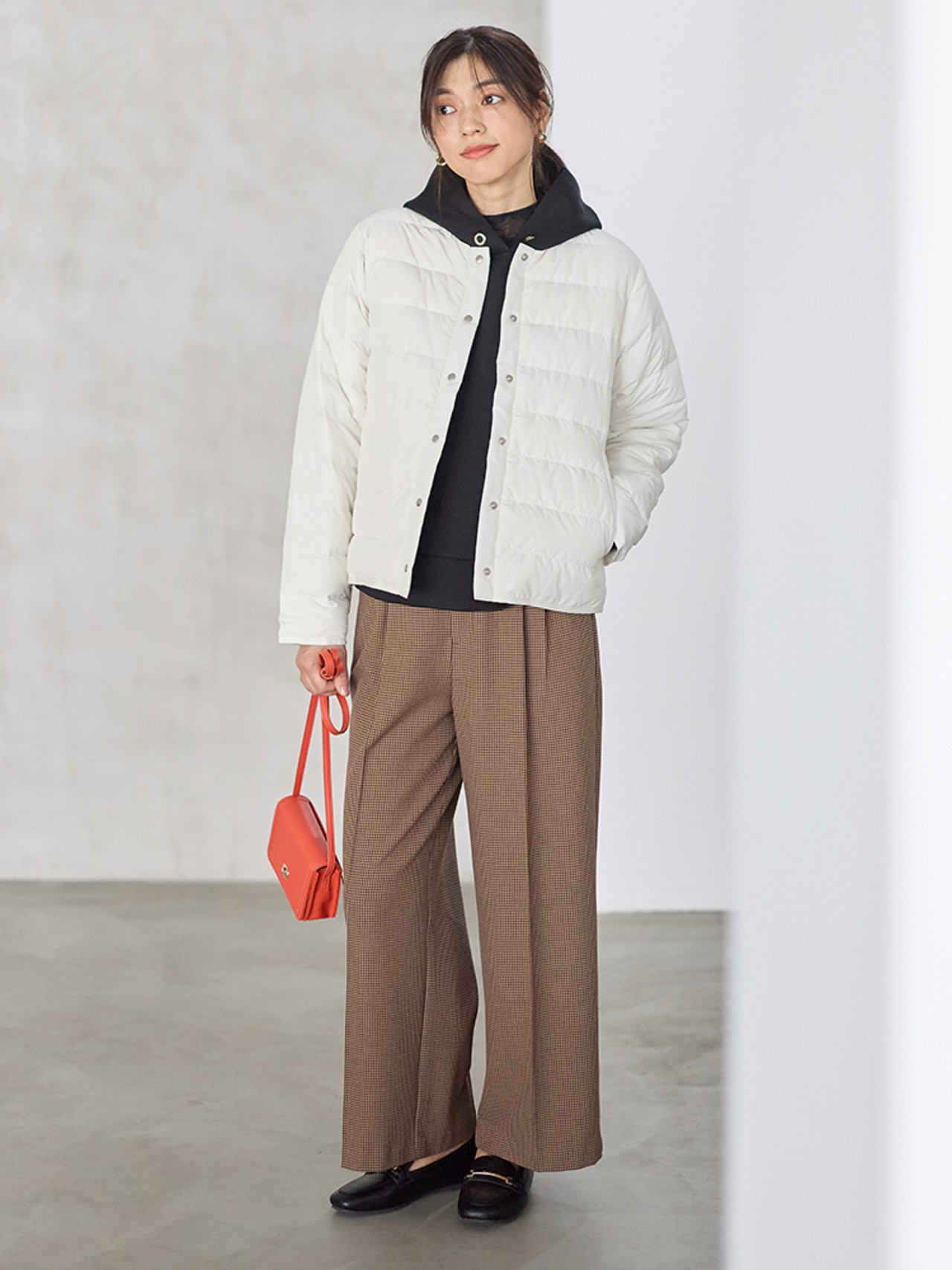 黒のパーカーに白のライトダウンを羽織った、軽やかで抜け感のあるカジュアルスタイル。ブラウンのガンクラブチェック柄ワイドパンツを合わせて、リラックス感の中にもトラッドな雰囲気をプラス。【6サイズ展開/洗濯機可/ウエストゴム/2WAYストレッチ】ウォームワイドパンツ【6サイズ展開/洗濯機可/ウエストゴム/2WAYストレッチ】ウォームワイドパンツANY¥5,990(税込)【手洗い可/撥水】フレンチダウンショートコート【手洗い可/撥水】フレンチダウンショートコートANY¥9,990(税込)【WEB限定/洗濯機可】ダンボールパーカー【WEB限定/洗濯機可】ダンボールパーカーANY¥5,990(税込) -