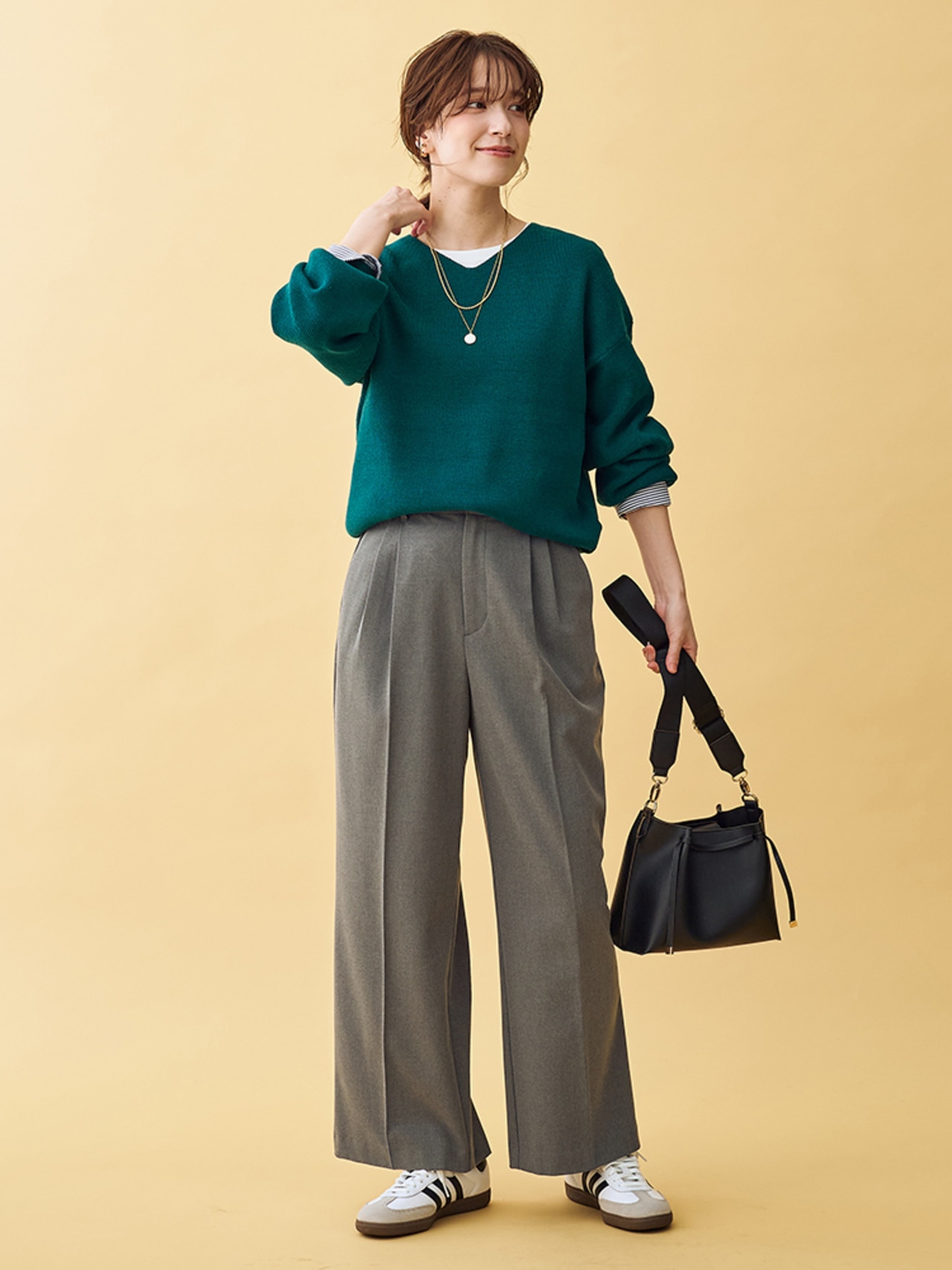 落ち感のあるグレーのワイドパンツが、ゆったりとしたシルエットで大人の抜け感を演出。グリーンのニットに白Tシャツを重ねたレイヤードで、ほどよくラフでこなれた印象に。【6サイズ展開/洗濯機可/ウエストゴム/2WAYストレッチ】ウォームワイドパンツ【6サイズ展開/洗濯機可/ウエストゴム/2WAYストレッチ】ウォームワイドパンツANY¥5,990(税込)【8色展開/洗濯機可/静電防止】Vネックデイリーニット【8色展開/洗濯機可/静電防止】VネックデイリーニットANY¥4,990(税込)【洗濯機可】シャツコンビレイヤードインナー【洗濯機可】シャツコンビレイヤードインナーANY¥3,990(税込)