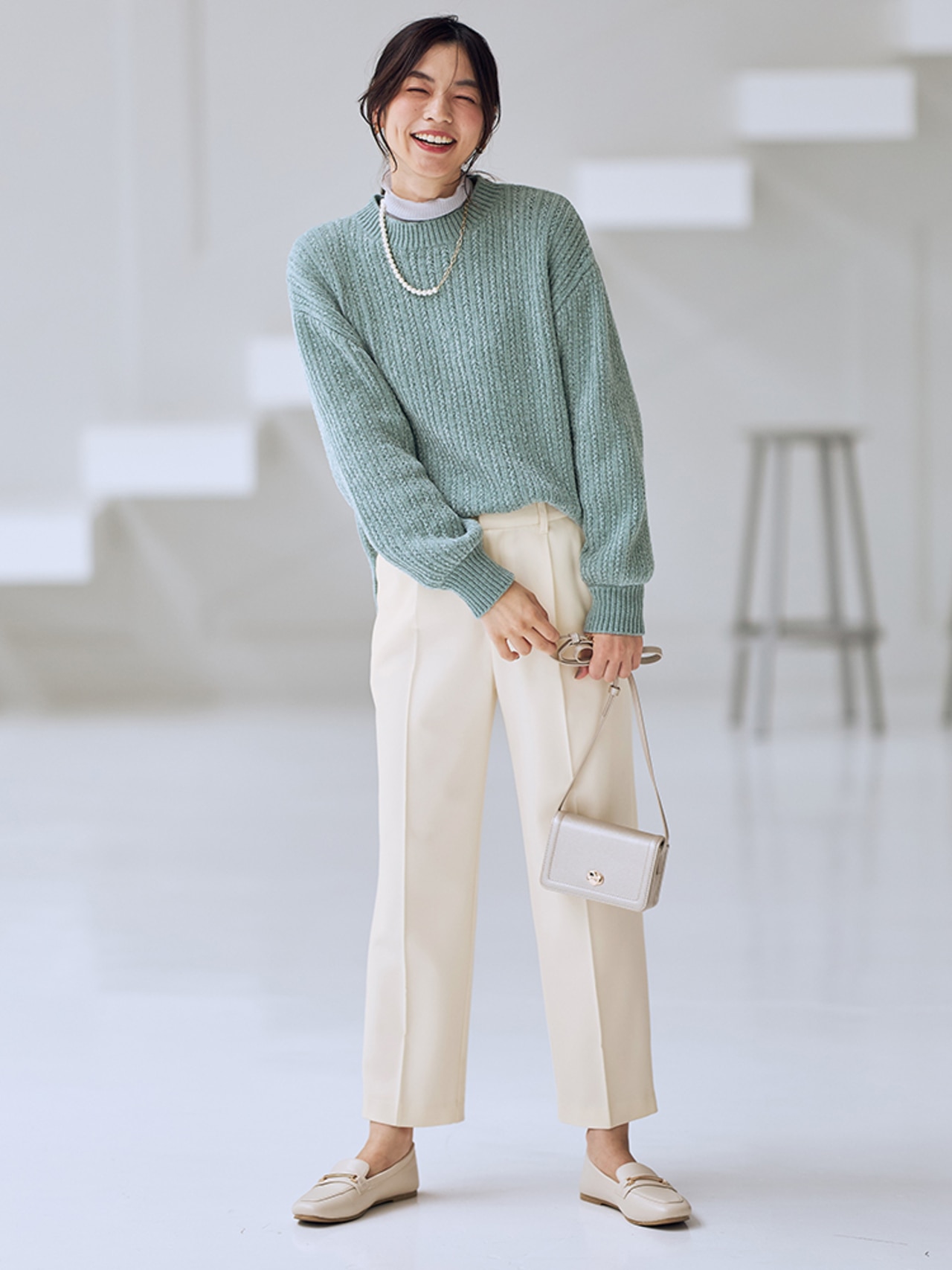 柔らかなミントカラーのニットが顔まわりを明るく見せてくれる、爽やかコーデ。白のテーパードパンツを合わせることで、きちんと感のある印象に。【6サイズ展開/洗濯機可/ウエストゴム/2WAYストレッチ】ウォームテーパードパンツ【6サイズ展開/洗濯機可/ウエストゴム/2WAYストレッチ】ウォームテーパードパンツANY¥5,490(税込)【手洗い可】レーシーモールニット【手洗い可】レーシーモールニットANY¥5,490(税込)【洗濯機可】シアーリブタートル【洗濯機可】シアーリブタートルANY¥3,990(税込)